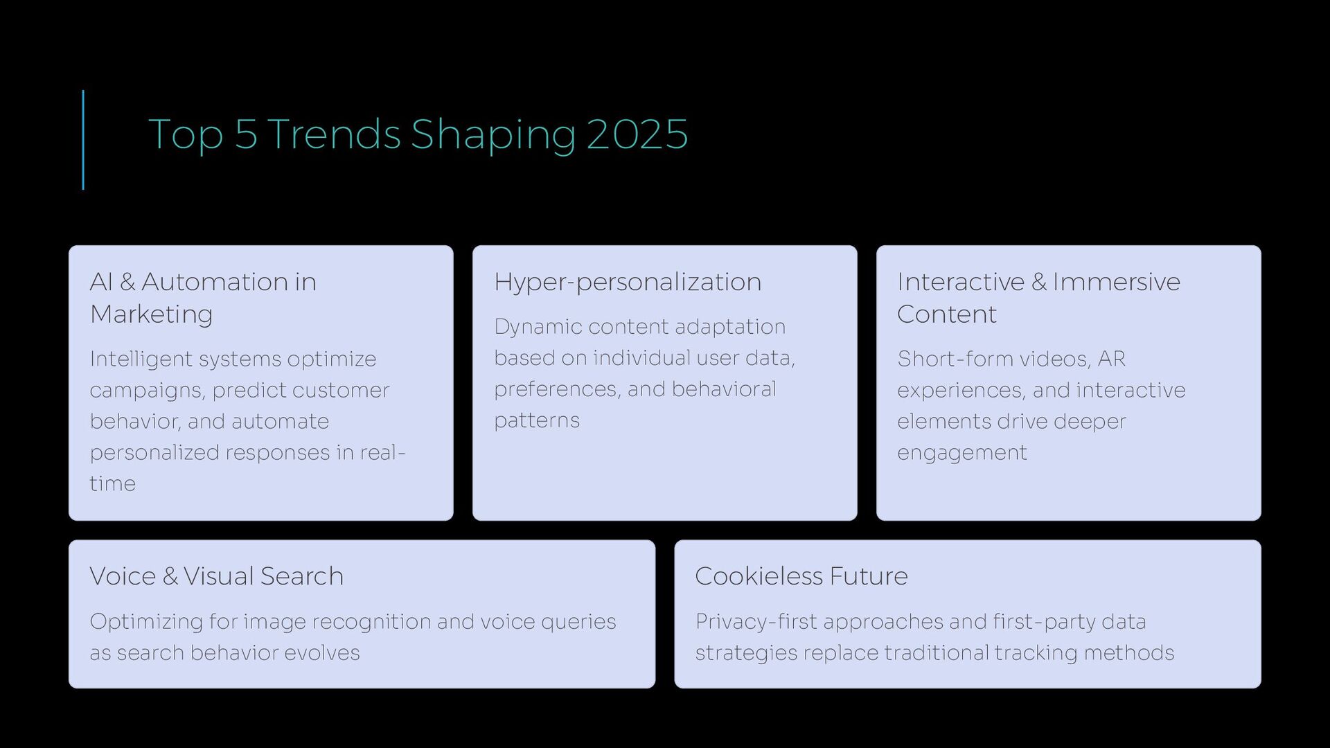 Intelligent systems optimize campaigns, predict customer behavior, and automate personalized responses in real- time Hyper-personalization Dynamic content adaptation based on individual user data, preferences, and behavioral patterns Interactive & Immersive Content Short-form videos, AR experiences, and interactive elements drive deeper engagement Voice & Visual Search Optimizing for image recognition and voice queries as search behavior evolves Cookieless Future Privacy-first approaches and first-party data strategies replace traditional tracking methods