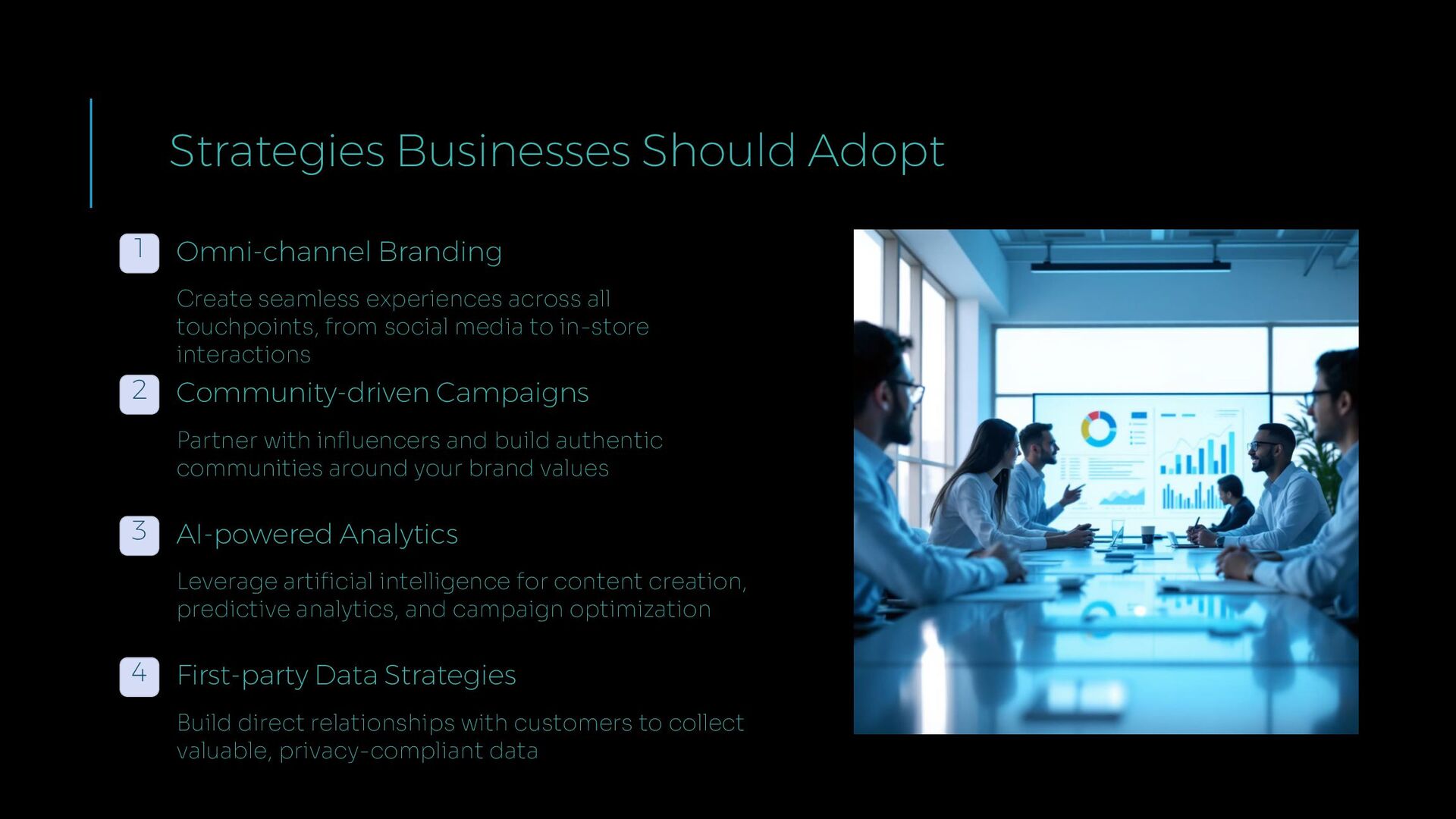 across all touchpoints, from social media to in-store interactions 2 Community-driven Campaigns Partner with influencers and build authentic communities around your brand values 3 AI-powered Analytics Leverage artificial intelligence for content creation, predictive analytics, and campaign optimization 4 First-party Data Strategies Build direct relationships with customers to collect valuable, privacy-compliant data