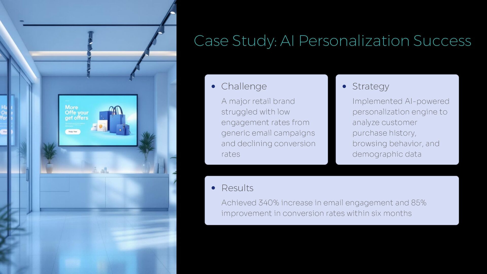 struggled with low engagement rates from generic email campaigns and declining conversion rates Strategy Implemented AI-powered personalization engine to analyze customer purchase history, browsing behavior, and demographic data Results Achieved 340% increase in email engagement and 85% improvement in conversion rates within six months