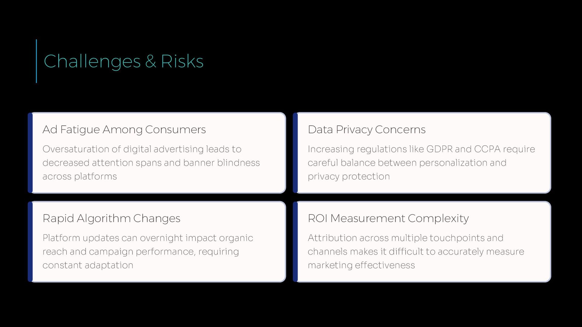 advertising leads to decreased attention spans and banner blindness across platforms Data Privacy Concerns Increasing regulations like GDPR and CCPA require careful balance between personalization and privacy protection Rapid Algorithm Changes Platform updates can overnight impact organic reach and campaign performance, requiring constant adaptation ROI Measurement Complexity Attribution across multiple touchpoints and channels makes it difficult to accurately measure marketing effectiveness