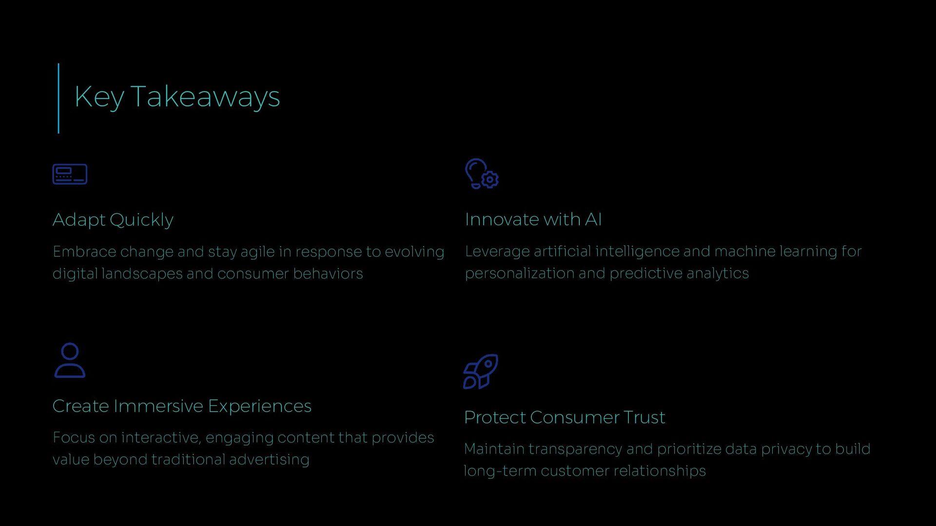 response to evolving digital landscapes and consumer behaviors Innovate with AI Leverage artificial intelligence and machine learning for personalization and predictive analytics Create Immersive Experiences Focus on interactive, engaging content that provides value beyond traditional advertising Protect Consumer Trust Maintain transparency and prioritize data privacy to build long-term customer relationships