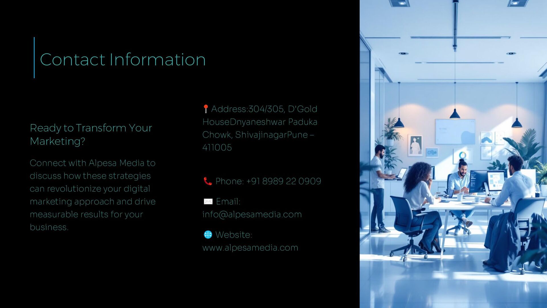 Media to discuss how these strategies can revolutionize your digital marketing approach and drive measurable results for your business. Address:304/305, D'Gold HouseDnyaneshwar Paduka Chowk, ShivajinagarPune – 411005 Phone: +91 8989 22 0909 Email: [email protected] Website: www.alpesamedia.com