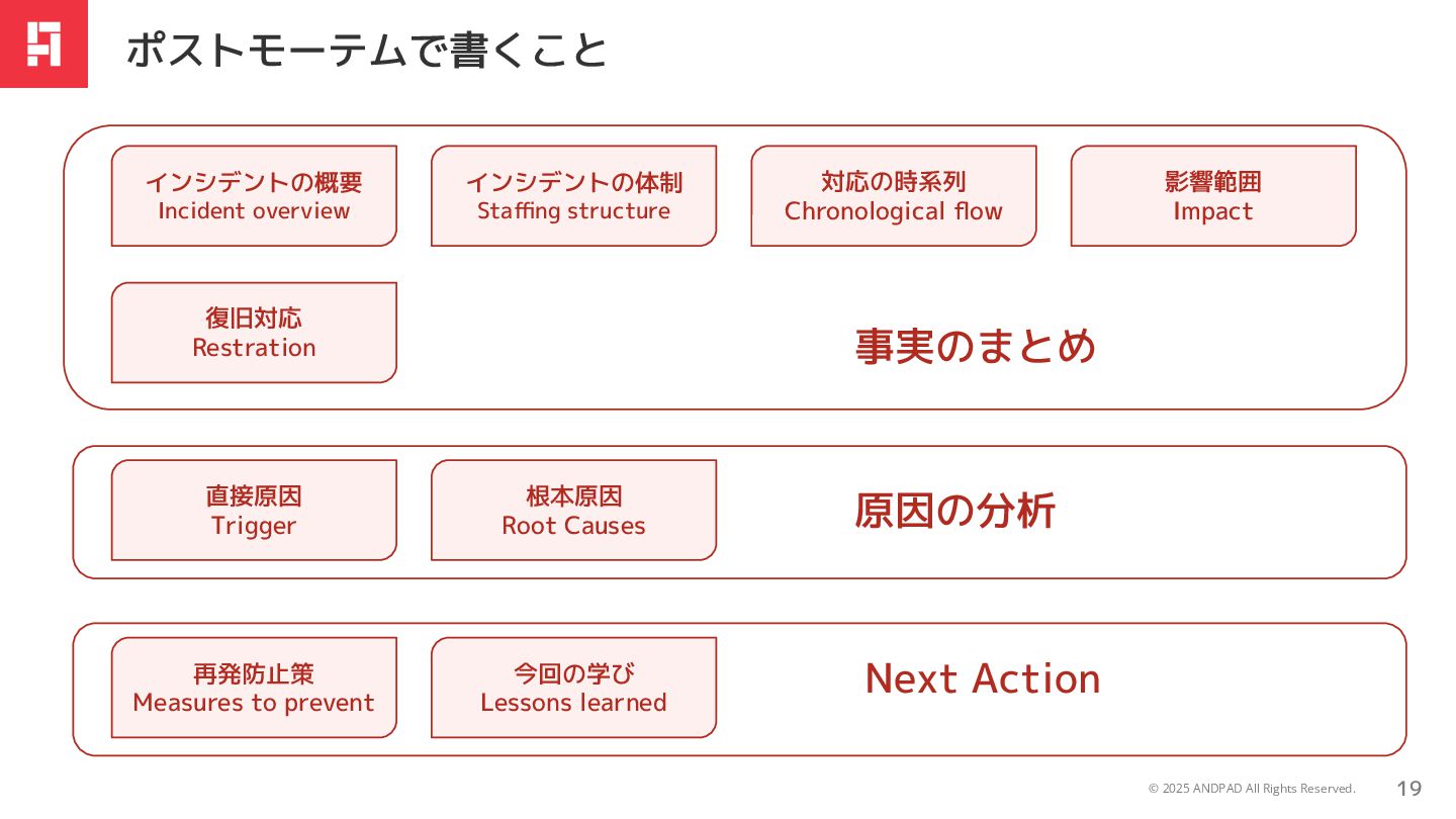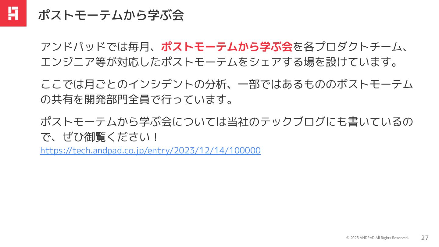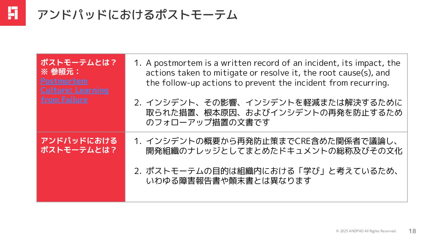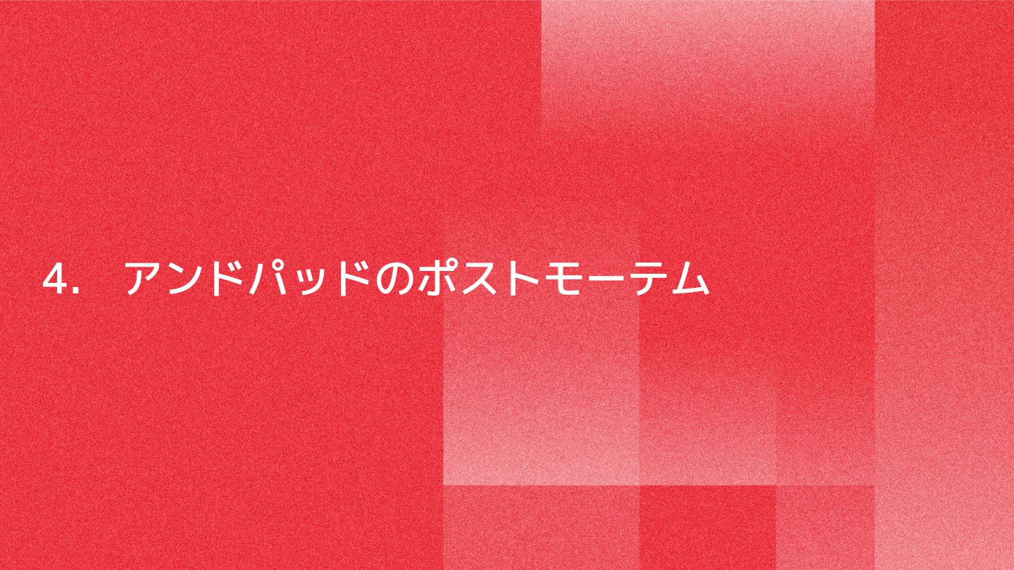 参照元: Postmortem Culture: Learning from Failure 1. A postmortem is a written record of an incident, its impact, the actions taken to mitigate or resolve it, the root cause(s), and the follow-up actions to prevent the incident from recurring. 2. インシデント、その影響、インシデントを軽減または解決するために 取られた措置、根本原因、およびインシデントの再発を防止するため のフォローアップ措置の文書です アンドパッドにおける ポストモーテムとは? 1. インシデントの概要から再発防止策までCRE含めた関係者で議論し、 開発組織のナレッジとしてまとめたドキュメントの総称及びその文化 2. ポストモーテムの目的は組織内における「学び」と考えているため、 いわゆる障害報告書や顛末書とは異なります