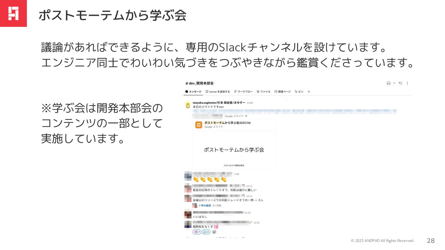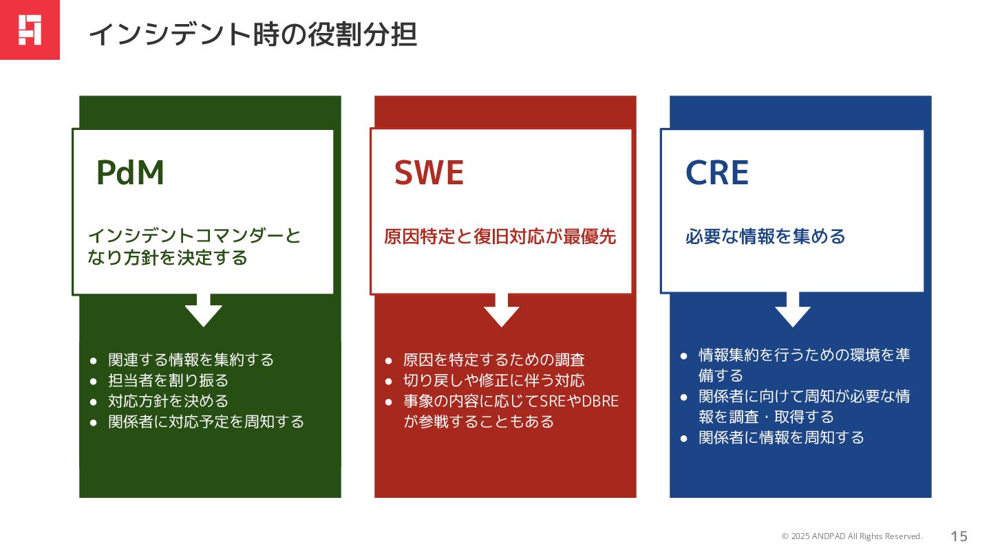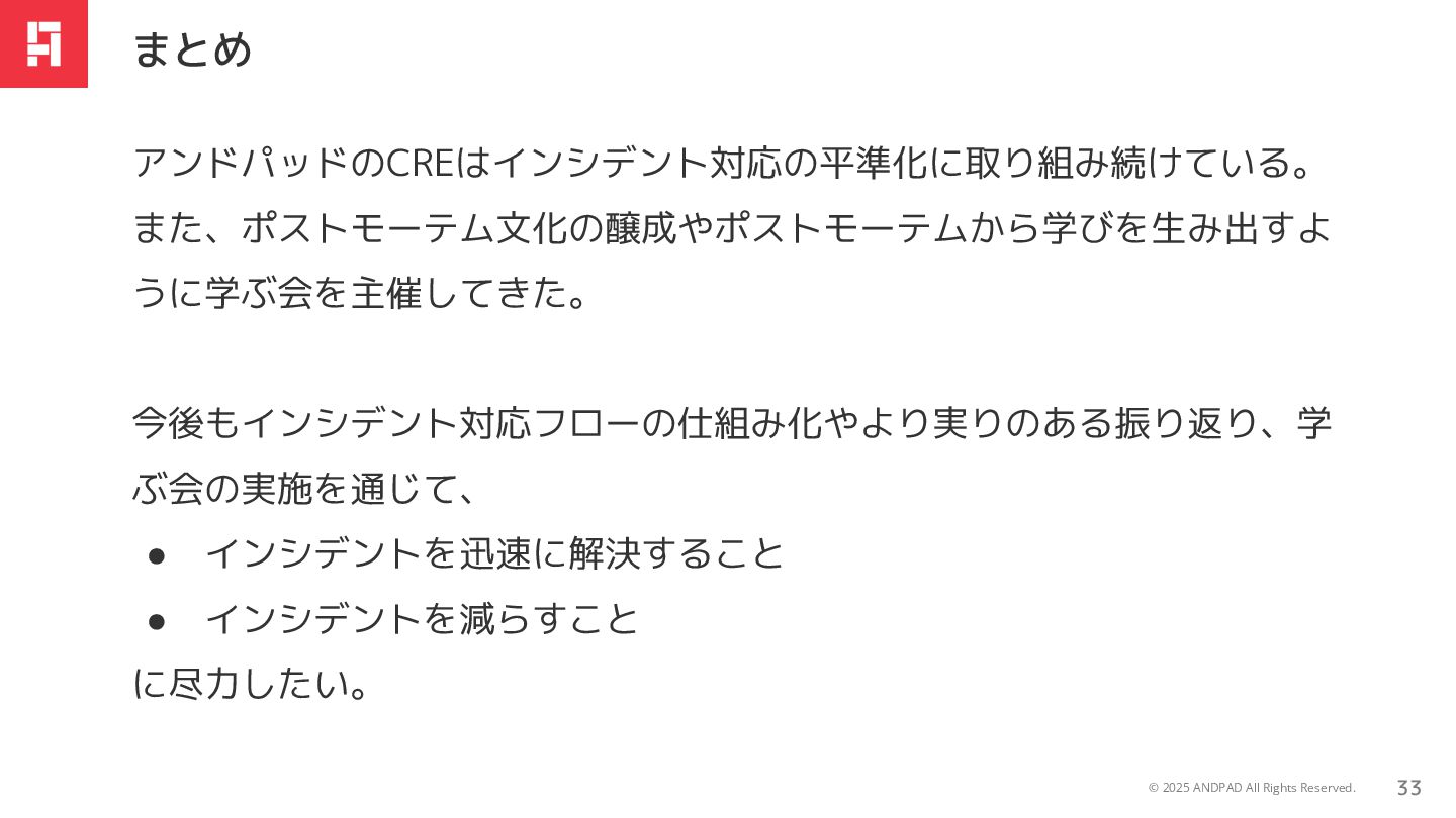 参照元: Postmortem Culture: Learning from Failure 1. A postmortem is a written record of an incident, its impact, the actions taken to mitigate or resolve it, the root cause(s), and the follow-up actions to prevent the incident from recurring. 2. インシデント、その影響、インシデントを軽減または解決するために 取られた措置、根本原因、およびインシデントの再発を防止するため のフォローアップ措置の文書です アンドパッドにおける ポストモーテムとは? 1. インシデントの概要から再発防止策までCRE含めた関係者で議論し、 開発組織のナレッジとしてまとめたドキュメントの総称及びその文化 2. ポストモーテムの目的は組織内における「学び」と考えているため、 いわゆる障害報告書や顛末書とは異なります