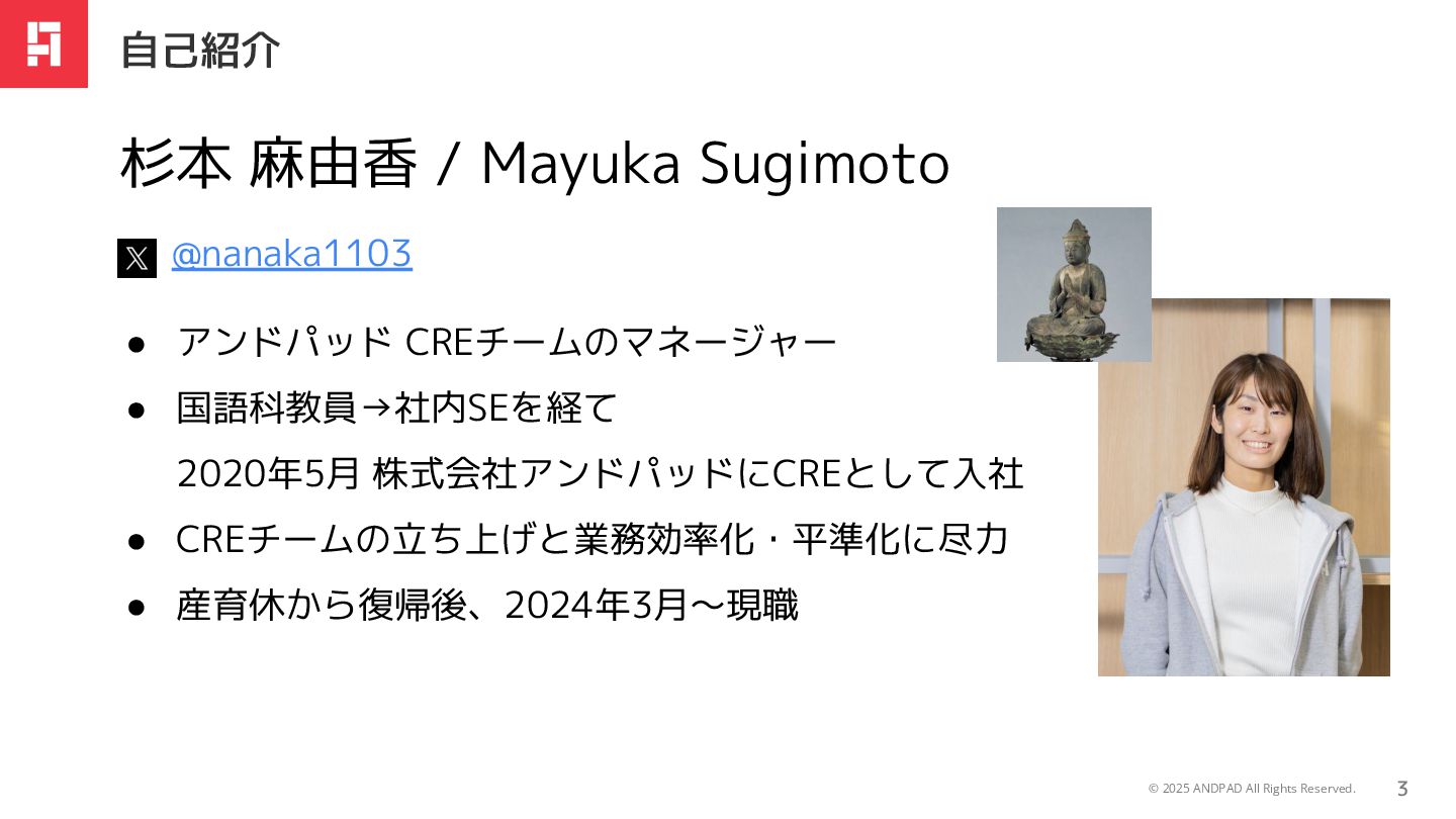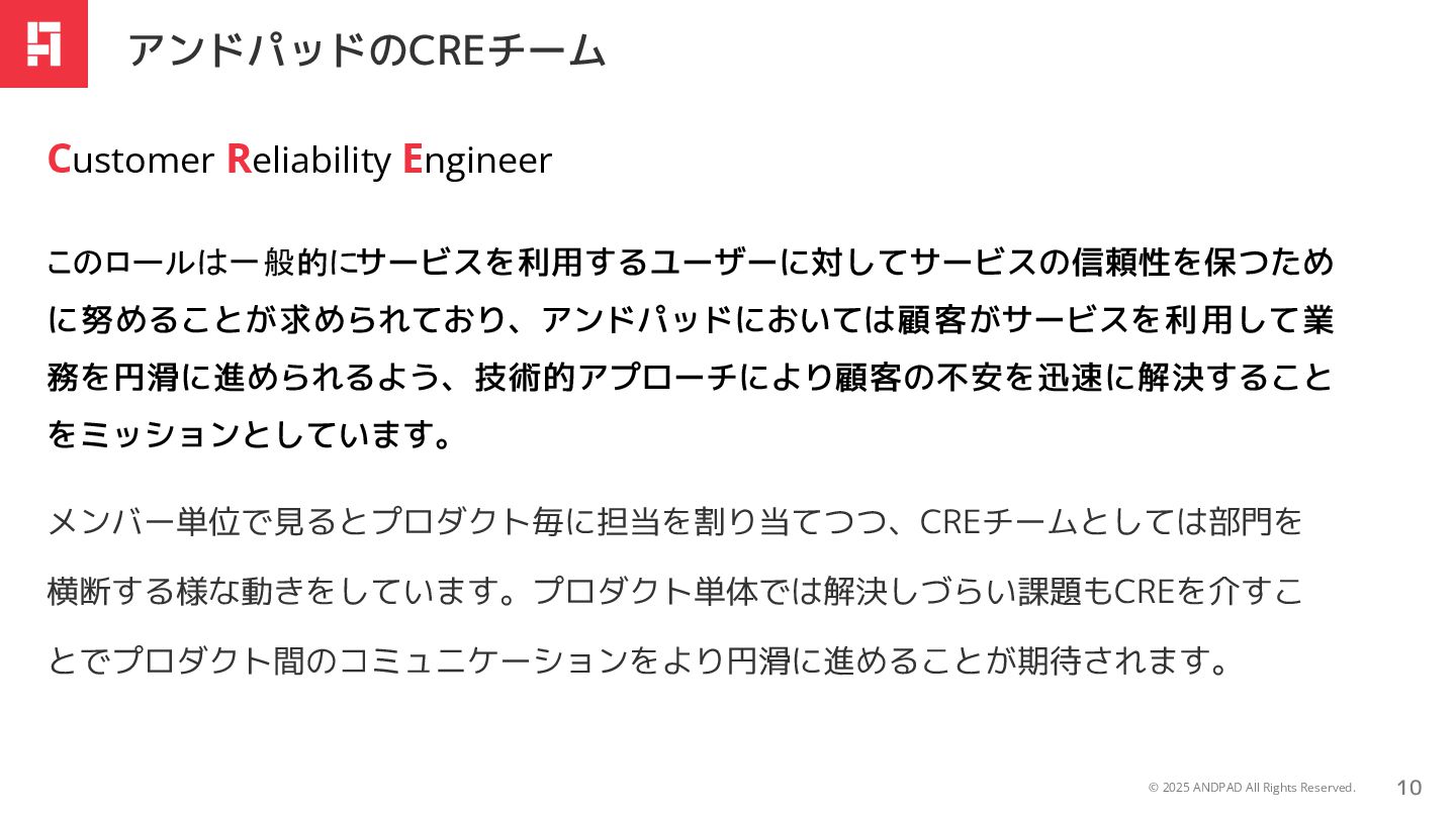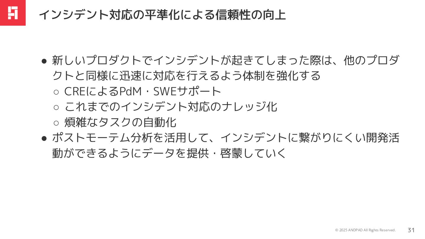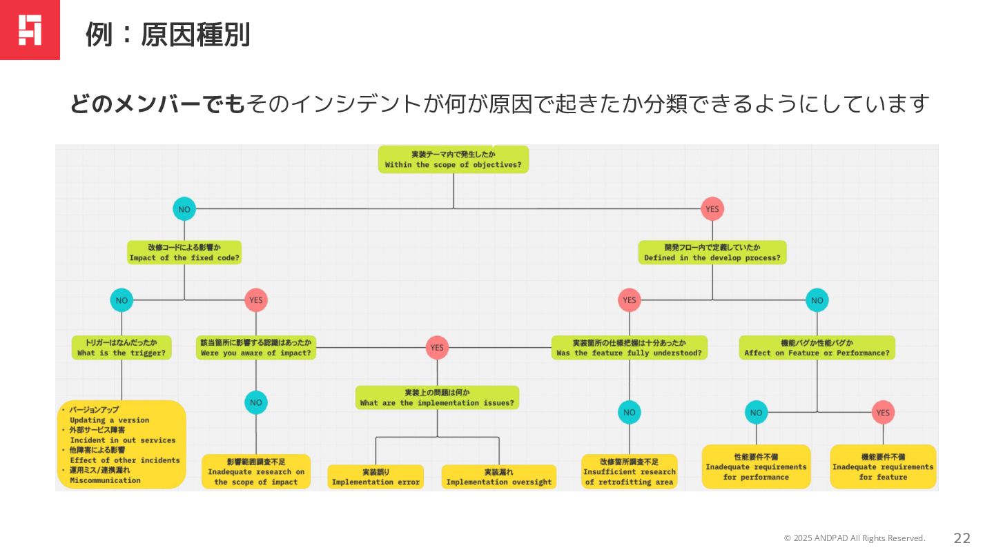 参照元: Postmortem Culture: Learning from Failure 1. A postmortem is a written record of an incident, its impact, the actions taken to mitigate or resolve it, the root cause(s), and the follow-up actions to prevent the incident from recurring. 2. インシデント、その影響、インシデントを軽減または解決するために 取られた措置、根本原因、およびインシデントの再発を防止するため のフォローアップ措置の文書です アンドパッドにおける ポストモーテムとは? 1. インシデントの概要から再発防止策までCRE含めた関係者で議論し、 開発組織のナレッジとしてまとめたドキュメントの総称及びその文化 2. ポストモーテムの目的は組織内における「学び」と考えているため、 いわゆる障害報告書や顛末書とは異なります