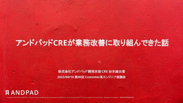 and was prepared by ANDPAD Inc. for the use of our client. It is not to be relied on by and 3rd party. Proprietary & Confidential 無断転載・無断複製の禁止 Copyright © 2022 Present ANDPAD Inc. This information is confidential and was prepared by ANDPAD Inc. for the use of our client. It is not to be relied on by and 3rd party. Proprietary & Confidential 無断転載・無断複製の禁止 アンドパッドCREが業務改善に取り組んできた話 株式会社アンドパッド 開発本部 CRE 杉本麻由香 2022/06/16 第06回 Customer系エンジニア座談会