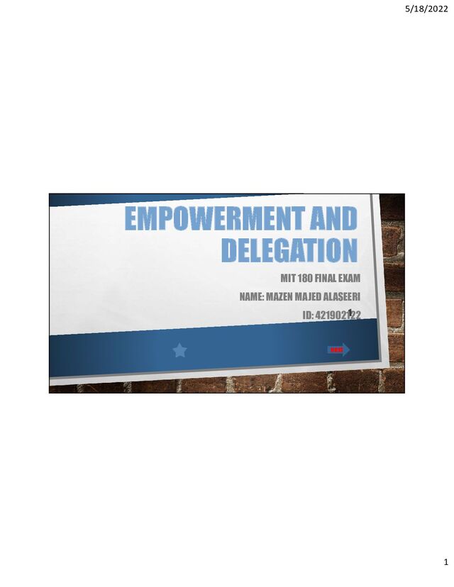 sometimes used interchangeably, there are several areas of difference between them. Delegation is a straightforward means of assigning tasks to your employees. Empowerment seeks to give an employee more authority with the aim of developing employee commitment, enthusiasm and expertise, while encouraging innovation that will benefit the organization over time. Empowerment necessarily requires some level of delegation, but not all instances of delegation will produce an empowered employee. Delegation Empowerment Normally refers to the assignment of a task. It is work-focused May involve non-work activities, emotions, and relationships. It involves the way people think about themselves home next back 18/05/2022 MAZEN 4