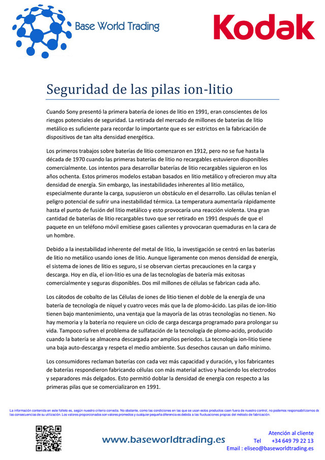 Documento divulgativo sobre la seguridad de uso y de transporte de las pilas de ion-litio y otras tecnologias quimicas basadas en el Litio. Base World Trading es distribuidor oficial de productos de consumo Kodak para España y Portugal, consultenos!