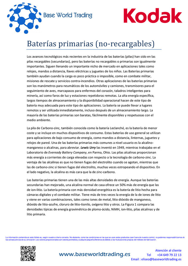 correcta. No obstante, como las condiciones en las que se usan estos productos caen fuera de nuestro control, no podemos responsabilizarnos de las consecuencias de su utilización. Los valores proporcionados son valores promedios y cualquier pequeña diferencia es debida a las fluctuaciones propias del método de fabricación. Base World Trading www.baseworldtrading.es Atención al cliente Tel +34 649 79 22 13 Email :