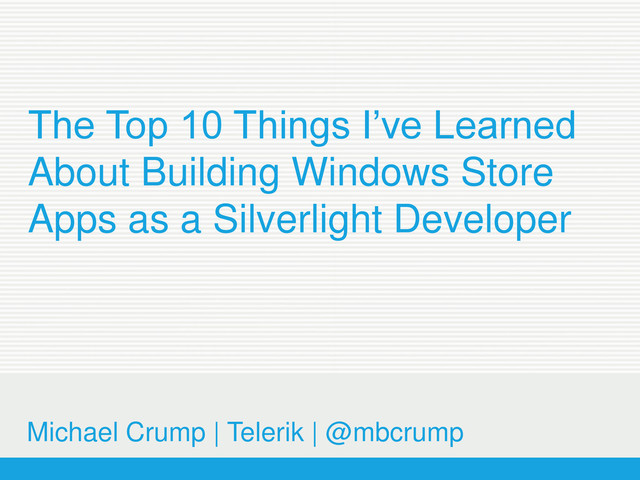 This session will help existing Silverlight developers get over the hump of building Windows 8 Store apps using XAML/C#. I have built both Silverlight and Windows 8 apps and share 10 things that I’ve found every Silverlight developer should know before starting their first XAML/C# Windows Store App.