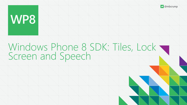 The Windows Phone 8 SDK brings along many new features that could benefit your next Windows Phone app. Come take a look at several of these new features including: Tiles, Changing Lock Screen & Notications and Speech Recognition. We will also discover the additional tooling support and templates covered with this release. This is definitely a session to get you up to speed quickly with this new and exciting platform.