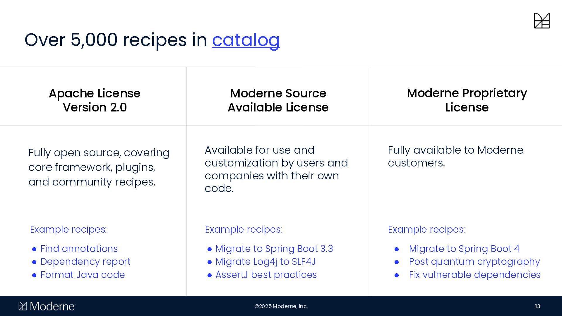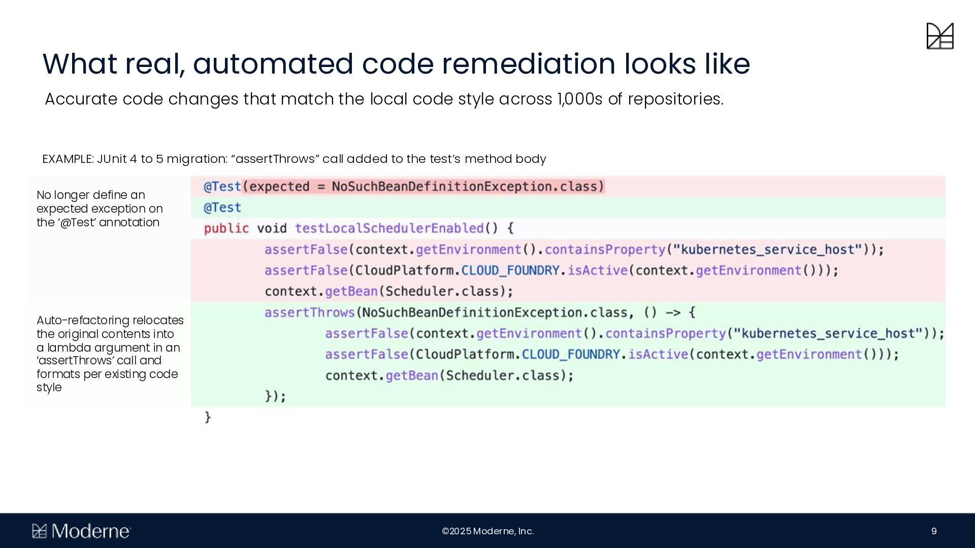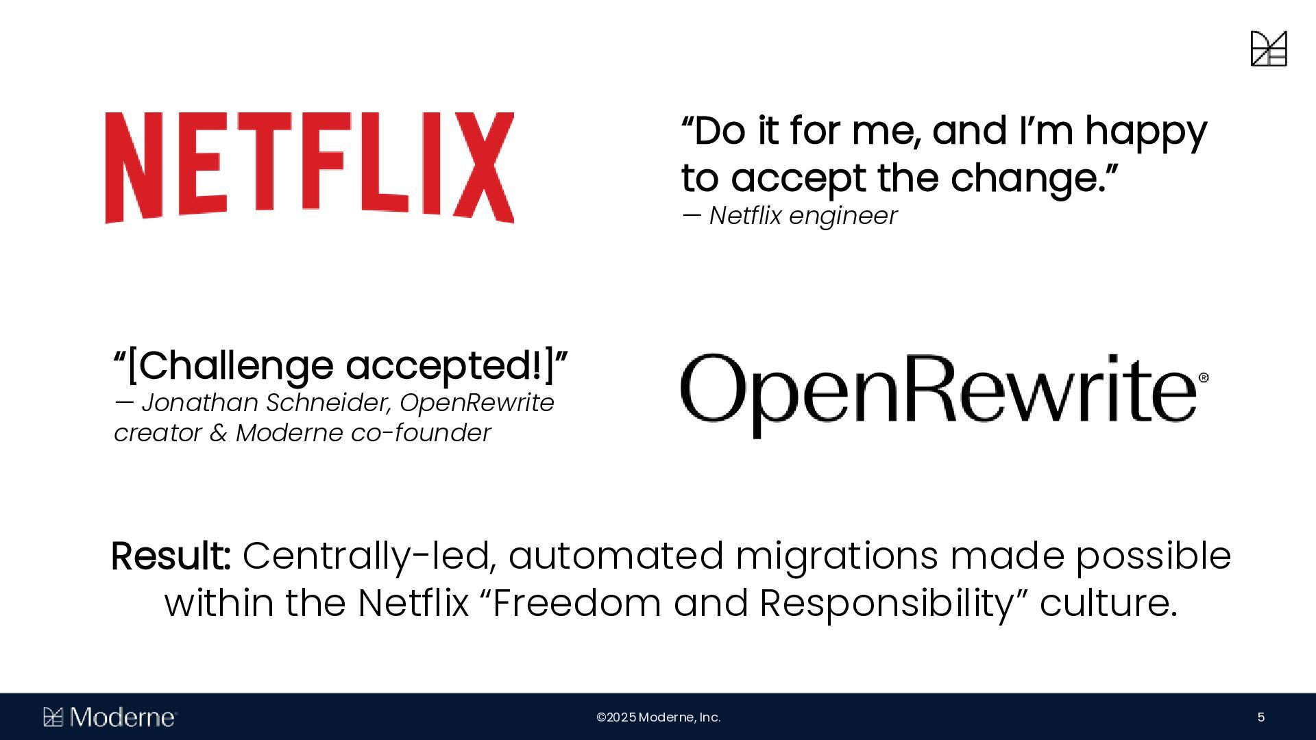 Mit der OpenRewrite-Technology können Unternehmen vorhersehbare und effiziente Migrationen von großen Code-Basen durchführen. Diese Vorhersagbarkeit ermöglicht sichere Migrationen zwischen Frameworks, um etwa frühere Entscheidungen rückgängig zu machen. Moderne skaliert diese Fähigkeit mit paralleler Ausführung über mehrere Repositorys, sodass Unternehmen Migrationen skalieren und den Quellcode als Wissensbasis nutzen können.