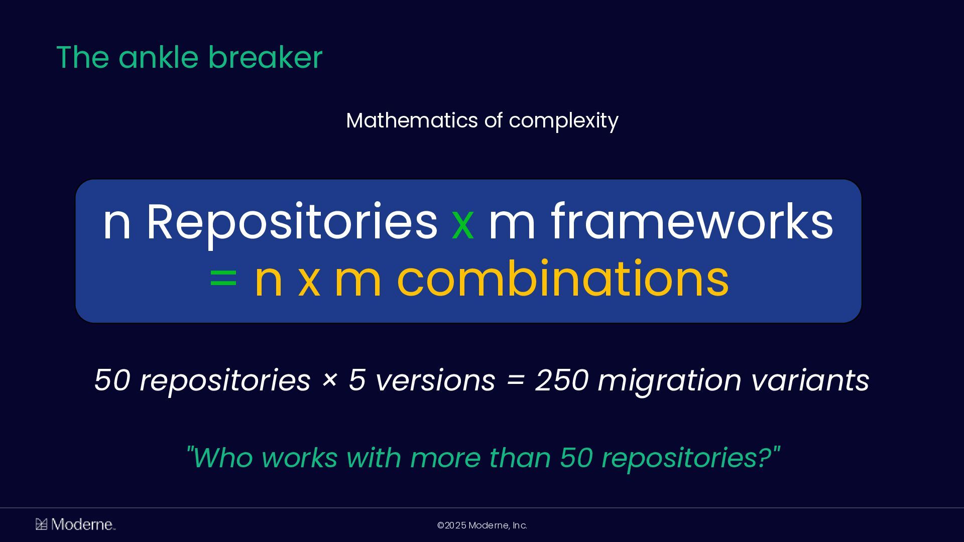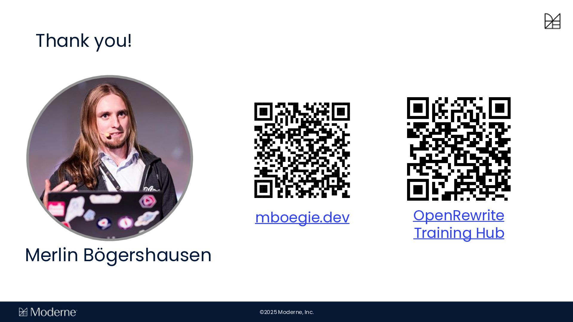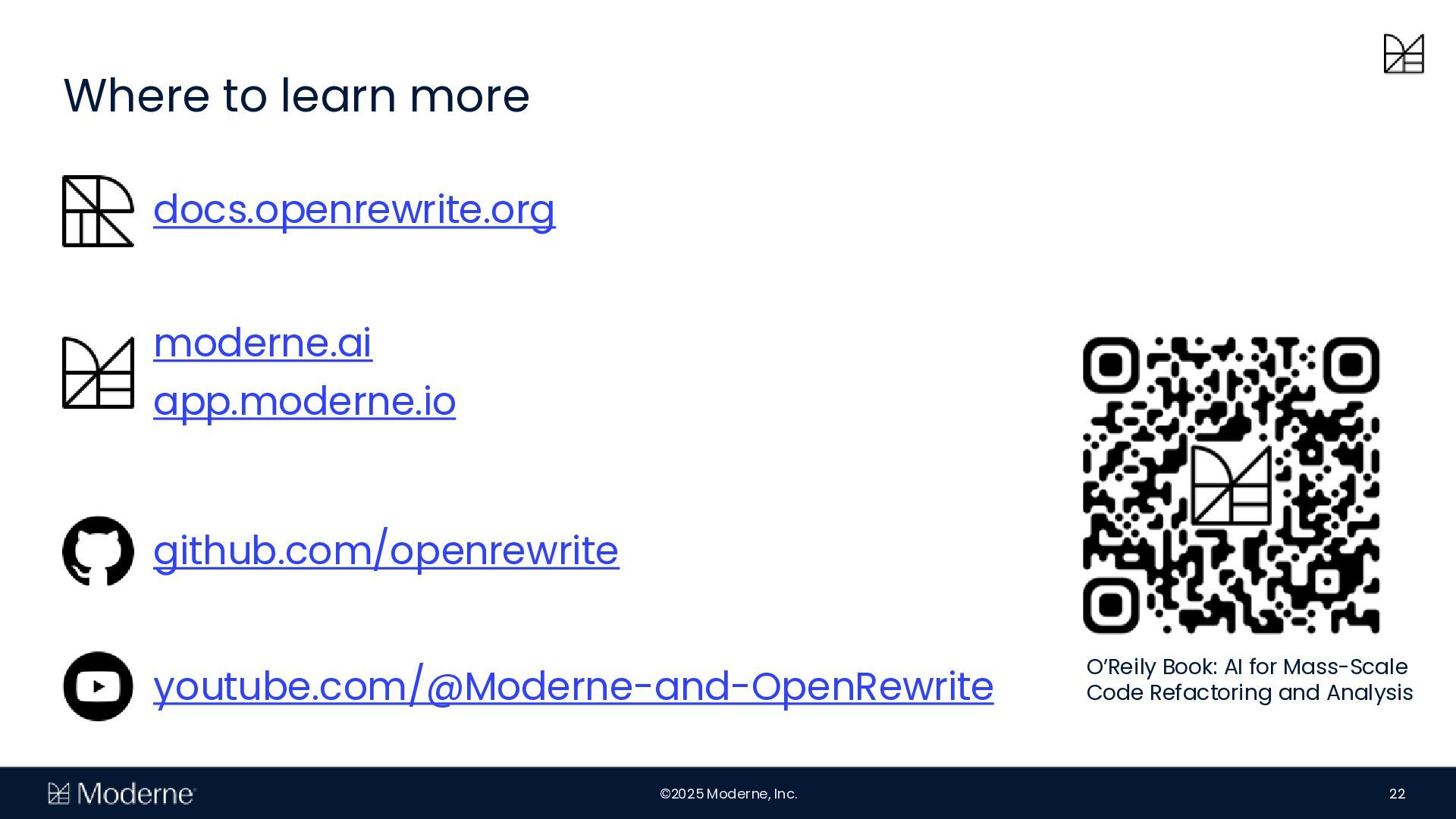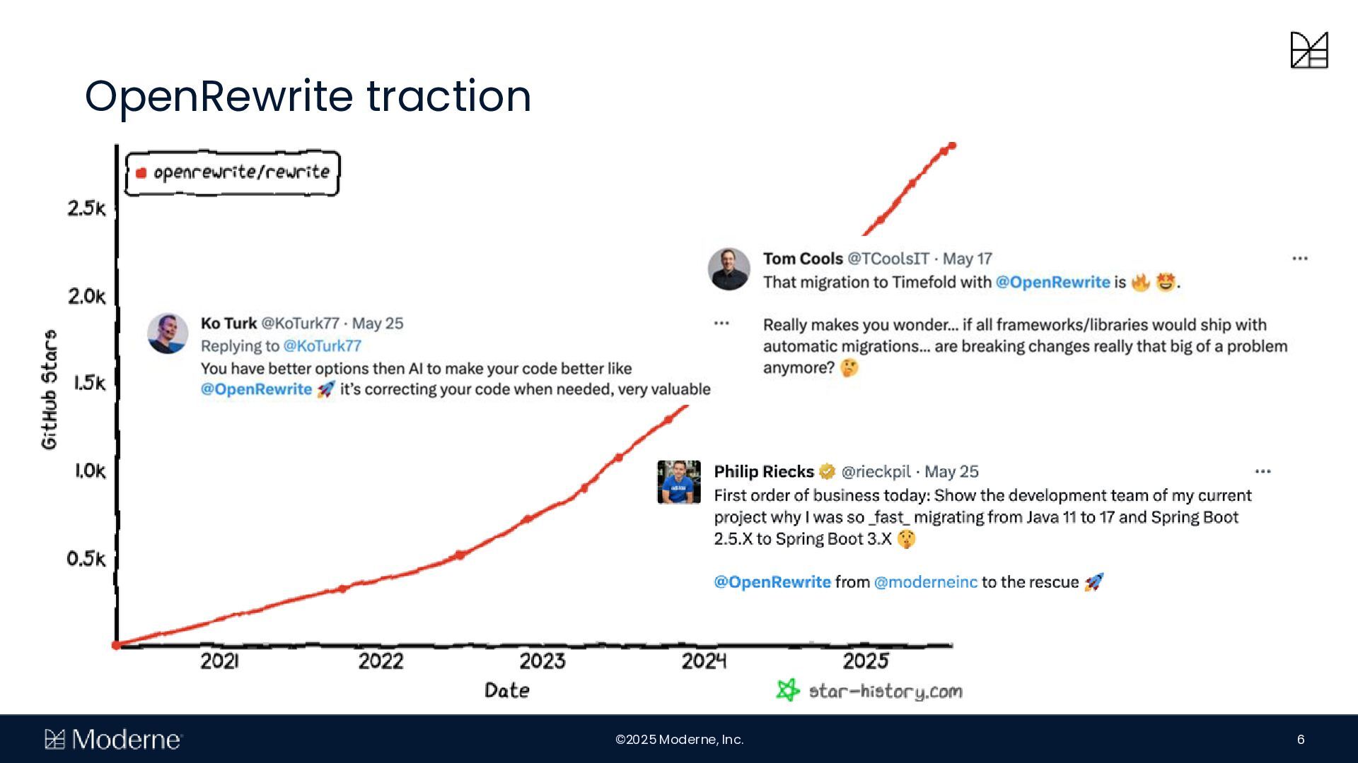 Mit der OpenRewrite-Technology können Unternehmen vorhersehbare und effiziente Migrationen von großen Code-Basen durchführen. Diese Vorhersagbarkeit ermöglicht sichere Migrationen zwischen Frameworks, um etwa frühere Entscheidungen rückgängig zu machen. Moderne skaliert diese Fähigkeit mit paralleler Ausführung über mehrere Repositorys, sodass Unternehmen Migrationen skalieren und den Quellcode als Wissensbasis nutzen können.