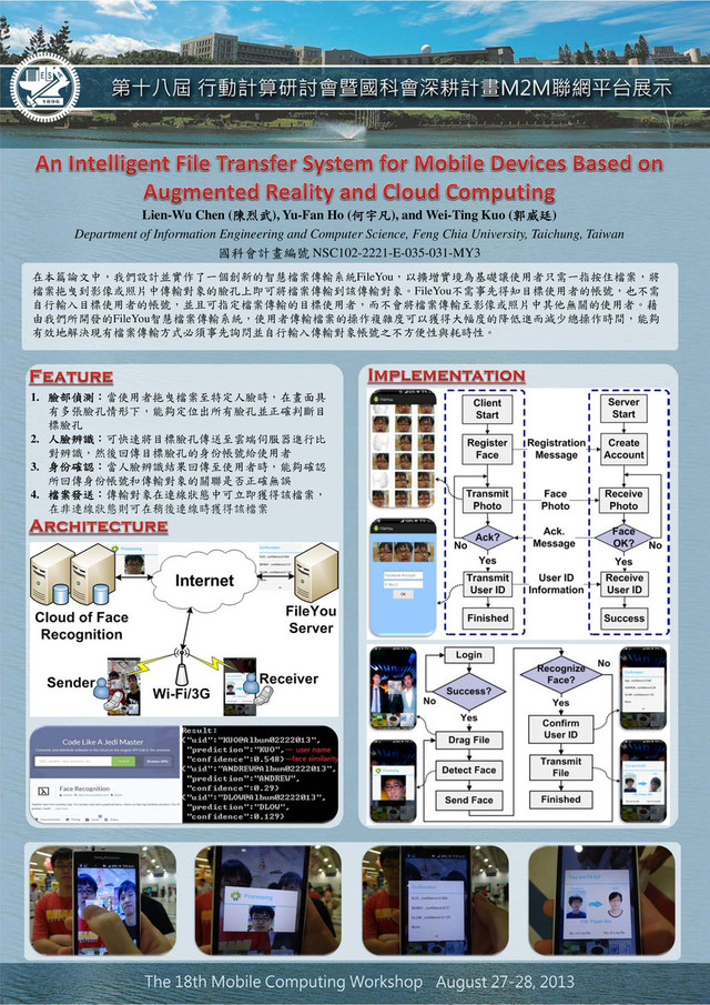 對到正確的傳輸對象臉孔,則回傳該傳輸對象的資料 經FileYou伺服器轉送給使用者,確認後使用者便會開 始傳輸檔案給FileYou伺服器,FileYou伺服器再協助 將檔案傳送給辨識出的傳輸對象之行動裝置,傳輸完 畢後將會發送一個傳送成功訊息給發送者的行動裝 置,整個資料傳輸流程便全部完成。 3. System Implementation FileYou客戶端程式是以Android智慧型手機APP來 實 作, Android 是 為 行動裝 置所 專屬打 造的 軟體 Stack,包含作業系統、中介軟體及應用程式,作業系 統則是承襲Linux 2.6核心。我們使用Java開發套件以 及Eclipse整合開發環境來進行系統實作,並使用 Android Development Tools (ADT) Plugin來為Eclipse 整合開發環境提供延伸功能,可加快FileYou程式撰寫 與除錯的進度,以及使用Android SDK提供必要的工 具程式與API。 客戶端介面在開始啟動時可以於螢幕上看到相機 預覽畫面,下方則會顯示目前資料夾內的所有檔案。 若需要切換不同的資料夾,可透過放置於最前方的資 料夾圖示來選擇。如圖二左上方所示,使用者可將下 方檔案圖示拖曳至相機預覽畫面上,系統便會進行臉 部偵測,並針對手指放開的座標點來尋找最接近之臉 孔。由於在客戶端進行臉部偵測可以有效降低螢幕影 像的傳輸量與傳輸時間,所以我們直接透過客戶端對 先前擷取的畫面進行臉孔偵測,之後便只需傳送單一 臉孔畫面至伺服端,而非傳送整張螢幕影像。圖二左 下方與右上方分別顯示偵測到臉孔後開始傳送至伺 服器的畫面,以及雲端人臉辨識的回傳結果畫面。圖 二左下方顯示傳送者所註冊的臉孔圖片與ID、接收者 所註冊的臉孔圖片與ID,以及所傳送檔案的名稱。 在臉部辨識方面, FileYou使用了Mashape [8]及 Lambda Labs [9]第三方雲端API來達成臉部辨識的功 能。Mashape為集結各種領域API的雲端開發網站,其 雲端API提供者可能為個人或是工作室等,Lambda 圖三、FileYou 系統展示 Labs即為Mashape的提供者。每種雲端API都有其免費 以及付費資格的限制(可使用固定次數,超過次數則要 額外收費)。當雲端臉部辨識伺服器接收到由FileYou 伺服端傳送來的臉孔後,於比對之前會先進行更精細 的臉孔偵測。若臉孔的準確度過低,將造成臉部辨識 結果不如預期,因此將會提示使用者須重新操作。當 臉孔準確度符合預期時,會針對現存資料庫中的所有 人臉樣本進行比對。待比對完成即顯示相似度前三名 的人臉標籤(prediction)以及相似度值(confidence)。 FileYou伺服器回傳辨識結果並經使用者確認結果 之後,在傳輸檔案之前會先發送給FileYou伺服器檔案 資訊,包含檔案大小與檔案名稱,可讓FileYou伺服器 動態的建置File Buffer , 增加伺服器的系統資源利用效 率。之後透過TCP協定開始做檔案資料流的傳輸。傳 輸完畢伺服器會確認傳輸對象是否在線上,若在線上 則將暫存的檔案資料直接轉送給傳輸對象,否則或是 直接以電子郵件形式來發送檔案。圖三為實際使用 FileYou進行檔案傳輸的畫面 , 其中圖三(a)為使用者拖 曳檔案至傳輸對象臉孔的畫面 , 圖三(b)為FileYou進行 臉孔偵測的畫面,圖三(c)為人臉辨識的結果畫面,圖 三(d)則為傳輸對象接收到FileYou所傳送檔案的畫面 。 4. Acknowledgements This research is supported in part by NSC under Grant No. 101-2221-E-035-090 and 102-2221-E-035-031-MY3. References [1] L.-B. Yu, “A study on NFC-activated Bluetooth data transmission over Android smart phones,” Master Thesis, Dept. of CSIE, National Taiwan Normal University, June 2012. [2] Dropbox. https://www.dropbox.com. [3] iCloud. http://www.apple.com/pr/library/2011/06/06icloud.html. [4] Bluetooth Special Interest Group. https://www.bluetooth.org. [5] H. Pucha, M. Kaminsky, D. G. Andersen, and M. A. Kozuch, “Adaptive File Transfers for Diverse Environments,” in Proc. of USENIX Annual Technical Conference (USENIX), June 2008. [6] N. Tolia, M. Kaminsky, D. G. Andersen, and S. Patil, “An architecture for Internet data transfer,” in Proc. of 3rd USENIX NSDI, May 2006. [7] A. Muthitacharoen, B. Chen, and D. Mazieres, “A low-bandwidth network file system,” in Proc. of 18th ACM Symposium on Operating Systems Principles (SOSP), Oct. 2001. [8] Mashape – The Cloud API Hub. https://www.mashape.com/. [9] Lambda Labs Face Recognition API. http://api.lambdal.com/.