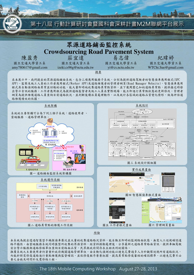 公里/小時, 異常點固定於同一減速丘。 實驗路線為繞行交大校內公車站牌前 停車場一圈,如圖 11: 圖 11 實驗路線二 此次實驗操縱變因為車架類型的不同, 分為掛於車子前方擋風玻璃和固定於儀表 板上方平台的車架。實驗收集數據如表 2: 車架 車速(km/hr) 異常指標 平穩標準差 掛式 18.1 6.737442 1.03193 立式 18.82 7.141476 0.51725 表 2 實驗二偵測資料 實驗三、不同手機擺放方向之異常點指標 實驗環境車種為電動高爾夫球車,手機 類型為 HTC OneX,車架為掛式車架,車速 固定為時速 20 公里/小時,異常點固定於同 一減速丘 。 實驗路線同於前次實驗的圖 11。 操縱變因則改設定手機擺放方式,分為 直立與橫向等兩種。實驗結果如表 3: 擺向 車速(km/hr) 異常指標 平穩標準差 直立 13.96 7.742903 0.86299 橫向 18.1 6.737442 1.03193 表 3 實驗三偵測資料 由實驗二和實驗三結果得知偵測的異 常點指標僅輕微受到各種車輛震動影響因 素,會有約 0.4 至 1 的差值,可能為車速和 計算之平穩狀態標準差不同所導致,但不影 響偵測的正確性。 七、結論 本系統為提出透過智慧型手機探偵車 廣泛並大量的收集道路路況資料,能自動且 即時的監測路面狀態,無需經由人工巡視方 式確認各道路的平穩性。並透過雲端服務系 統同時匯整所收集的眾源資料,經由資料探 勘處理後,分享最新之道路異常路面資訊, 提供車輛駕駛安全警示服務與道路修繕單 位查詢目前路面品質,對於民眾與政府彼此 間存在互助共利的關係。 推廣系統之主要使用者仍著重於政府 機關道路管理單位,由自動化偵測功能以避 免花費過多人力於觀察巡視所有道路狀況, 而能針對需修復道路進行重點維護與監督 確認,並由有秩序地依修復流程層層把關, 提高異常點修復審核的確認標準,以避免花 費不必要之金錢及時間於反覆修路工程。 八、未來研究 更進階之後續研究可依據震動等級進 行異常點類型的分類,以達到完全自動化偵 測的功能。並由震動等級大小及分布情形, 訂定道路品質規範,做為評估道路好壞及排 定修復的優先順序。另外可對統計道路的修 復異常點個數及修復時間進行分析,制定道 路維護評估標準,並將各縣市或道路進行排 序,鼓勵各負責單位正視且積極有效地維護 管理路面品質。同時可由分析修復時間的長 短,及修復後的持續性,來評估道路修復效 能,以做為控管施工廠商的維修品質依據。 參考文獻 [1] J. Eriksson, L. Girod, B. Hull, R. Newron, S. Madden, and H. Balakrishnan, “The pothole patrol: Using a mobile sensor network for road surface monitoring,” in the 6th international conference on Mobile systems, applications and services (MobiSys 08), 2008, pp. 29–39. [2] P. Mohan, V. N. Padmanabhan, and R. Ramjee, “Nericell: Rich monitoring of road and traffic conditions using mobile smartphones,” in the 6th international conference on Embedded network sensor systems (Sensys 08), November 2008, pp. 357–358. [3] A. Mednis, G. Strazdins, R. Zviedris, G. Kanonirs, and L. Selavo, “Real time pothole detection using android smartphones with accelerometers,” in 2011 International Conference on Distributed Computin [4] http://www.road.tcg.gov.tw/ROADRCIS/ [5] http://rdm.ntpc.gov.tw:8081/Road/ [6] 粘家盛, 「用於路面異常偵測之智慧型手 機探偵車系統」 ,國立交通大學,碩士論 文,民國 101 年 7 月 [7] A. Hinneburg and D. Keim, “An Efficient Approach to Clustering in Large Multimedia Databases with Noise,” in Proc. of the ACM SIGKDD, 1998, pp. 58–65 [8] 楊孟翰, 「空間物件比對與變遷分析的技 巧應用於資料發掘上」 ,國立臺灣大學, 碩士論文,民國 90 年 6 月。 起點