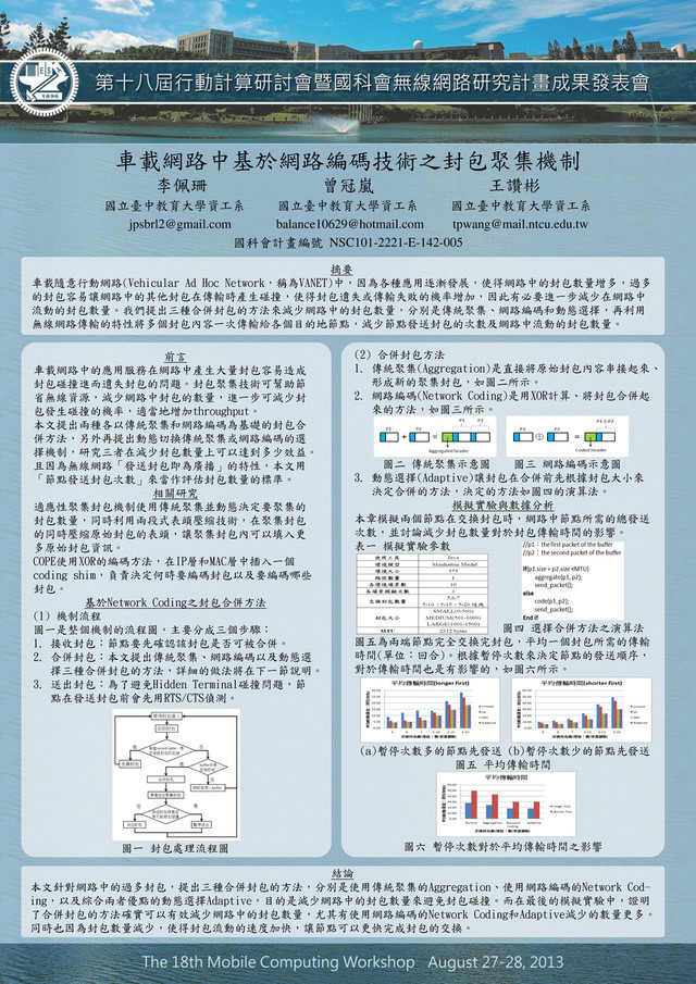 的 方 法 , 分 別 是 使 用 傳 統 聚 集 的 Aggregation、使用網路編碼的 Network Cod- ing,以及綜合兩者優點的動態選擇 Adaptive, 目的是減少網路中的封包數量來避免封包碰 撞。 而在最後的模擬實驗中,證明了合併封包 的方法確實可以有效減少網路中的封包數 量,尤其有使用網路編碼的 Network Coding 和 Adaptive 減少的數量更多 。 同時也因為封包 數量減少,使得封包流動的速度加快,讓節點 可以更快完成封包的交換。 致謝 This work was supported in part by the Science Council under grant No. 101-2221-E-142 -005-, Taiwan. 參考文獻 [1] 陳昱群,An Adaptive Mechanism for Packet Aggregation for Header Compression in VANET,碩士論文,國立臺中教育大學, 台中市,2011。 [2] “IEEE Std 802.11-2007(Revision of IEEE Std 802.11-1999,” June 12, 2007. [3] IEEE 802.11p, “Part11:WLAN MAC and PHY Specifications: Wireless Access in Ve- hicular Environments(WAVE),” IEEE Standards Association, July 15, 2010. [4] Ahlswede, R., Ning Cai, Li, S.-Y.R., Yeung, R.W., “Network Information Flow,” IEEE Transactions on Information Theory, vol.46, iss.4, pp.1204-1216, July 2000. [5] Sandra Céspedes, Xuemin (Sherman) Shen, and Christian Lazo, “IP Mobility Manage- ment for Vehicular Communication Net- works: Challenges and Solutions,” IEEE Communications Magazine, vol.49, iss.5, pp. 187-194, May 2011. [6] Chou, P.A., Yunnan Wu, “Network Coding for the Internet and Wireless Networks,” IEEE Signal Processing Magazine, vol.24, iss.5, pp.77-85, Sep. 2007. [7] Katti, S., Rahul, H., Wenjun Hu, Katabi, D., Medard, M., Crowcroft, J., “XORs in the Air: Practical Wireless Network Coding”, IEEE/ACM Transactions on Networking, vol.16, iss.3, pp.497-510, June 2008. [8] D. Kidston, “IP Header Compression and Packet Aggregation in Mobile Tactical Netwrks,” in IEEE Military Communica- tions, 2009, pp. 1-7. [9] Koetter, R., Medard, M., “An Algebraic Ap- proach to Network Coding, " IEEE/ACM Transactions on Networking, vol.11, iss.5, pp.782-795, Oct. 2003. [10] Baochun Li, Di Niu, “Random Network Coding in Peer-to-Peer Networks: From Theory to Practice,” Proceedings of the IEEE, vol.99, iss.3, pp.513-523, Mar. 2011. [11] Li, S.-Y.R., Sun, Q.T., Ziyu Shao, “Linear Network Coding: Theory and Algorithms, ” Proceedings of the IEEE, vol.99, iss.3, pp.372-387, Mar. 2011. [12] Nascimento, A.G.O., Mota, E.S., Queiroz, S.J.B., and Nascimento, E., “An Alternative Approach for Header Compression Over Wireless Mesh Networks,” International Conference on Advanced Information Net- working and Applications Workshops, Bradford, pp. 165-169, May 2009. [13] Dong Nguyen, Tuan Tran, Thinh Nguyen, Bose, B., “Wireless Broadcast Using Net- work Coding, ” IEEE Transactions on Ve- hicular Technology, vol.58, iss.2, pp.914-925, Feb. 2009. [14] Bo Yu, Cheng-Zhong Xu, Minyi Guo, “Adaptive Forwarding Delay Control for VANET Data Aggregation,” IEEE Transac- tions on Parallel and Distributed Systems, vol.23, iss.1, pp.11-18, Jan. 2012.