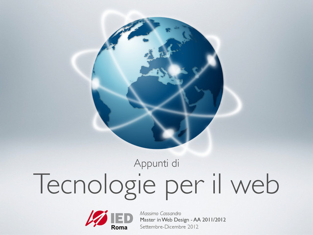 protocolli • Domini e IP • Ipertesti • Il protocollo http • Storia di Internet • Il W3C • Web 2.0 • Il web di domani 2. Siti web • Anatomia di un sito web • Pagine web • Siti statici e siti dinamici • Applicazioni server side e client side • Siti gestiti da database • Server e applicazioni web 3. Browser • La guerra dei browser • Browser market share • L’importanza degli standard • Dispositivi assistivi • Progressive enhancement e gracefully degradation • La rivoluzione mobile • Responsive design • Web Apps 4. Linguaggi • HTML e CSS • Linguaggi lato server • Linguaggi lato client • Librerie e framework 5. Scegliere un server • Scegliere e configurare un server • Tipologia dei siti web più comuni • Servizi accessori 6. Avviare un progetto web • Scegliere un servizio di hosting • Registrare un dominio • Figure professionali • Usabilità e accessibilità Panoramica ragionata di tecnologie e metodologie per il World Wide Web