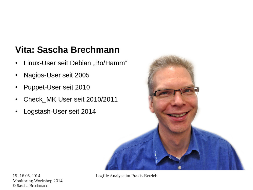 Praxis-Betrieb Vita: Sascha Brechmann • Linux-User seit Debian „Bo/Hamm“ • Nagios-User seit 2005 • Puppet-User seit 2010 • Check_MK User seit 2010/2011 • Logstash-User seit 2014