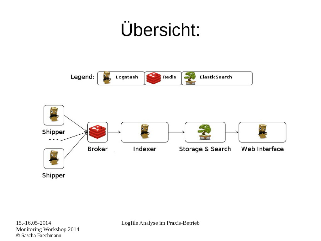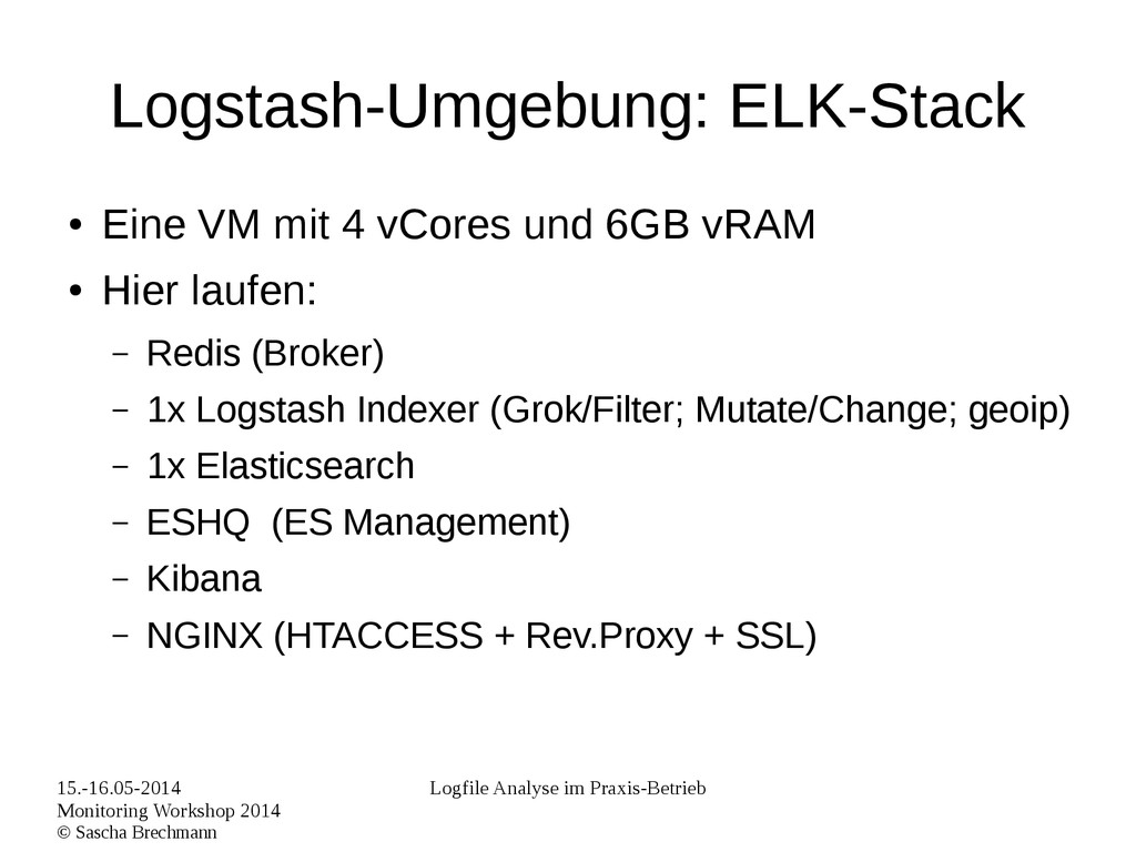 Praxis-Betrieb Logstash-Umgebung: Hosts • N Webserver VMs • Hier lauft: – Apache Webeserver – Logstash Shipper dieses sendet an den Broker (redis) zur Weiterverarbeitung.