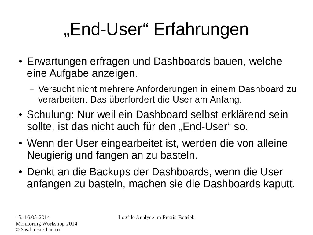 Praxis-Betrieb „End-User“ Erfahrungen • Erwartungen erfragen und Dashboards bauen, welche eine Aufgabe anzeigen. – Versucht nicht mehrere Anforderungen in einem Dashboard zu verarbeiten. Das überfordert die User am Anfang. • Schulung: Nur weil ein Dashboard selbst erklärend sein sollte, ist das nicht auch für den „End-User“ so. • Wenn der User eingearbeitet ist, werden die von alleine Neugierig und fangen an zu basteln. • Denkt an die Backups der Dashboards, wenn die User anfangen zu basteln, machen sie die Dashboards kaputt.