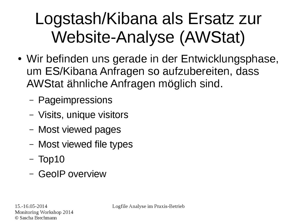 Praxis-Betrieb Logstash/Kibana als Ersatz zur Website-Analyse (AWStat) • Wir befinden uns gerade in der Entwicklungsphase, um ES/Kibana Anfragen so aufzubereiten, dass AWStat ähnliche Anfragen möglich sind. – Pageimpressions – Visits, unique visitors – Most viewed pages – Most viewed file types – Top10 – GeoIP overview