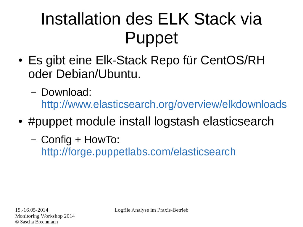 Praxis-Betrieb Installation des ELK Stack via Puppet • Es gibt eine Elk-Stack Repo für CentOS/RH oder Debian/Ubuntu. – Download: http://www.elasticsearch.org/overview/elkdownloads • #puppet module install logstash elasticsearch – Config + HowTo: http://forge.puppetlabs.com/elasticsearch