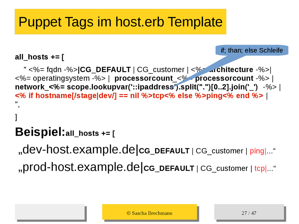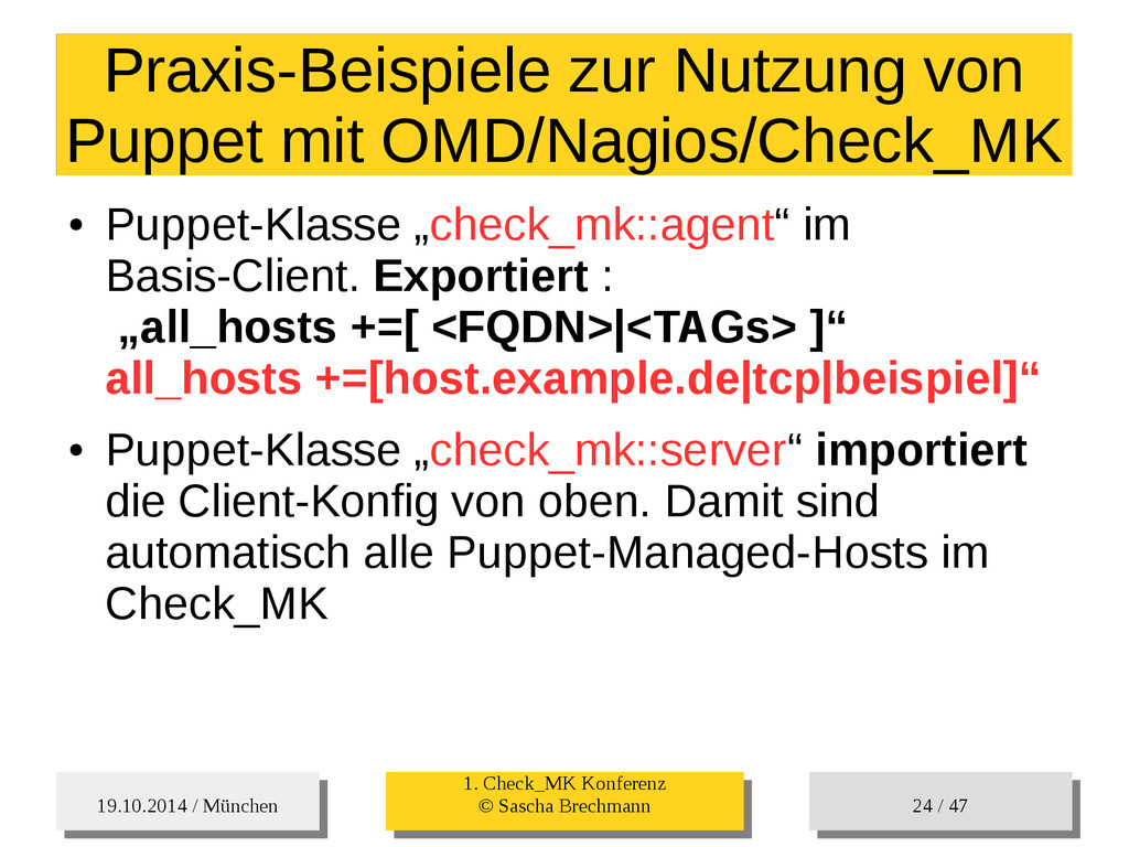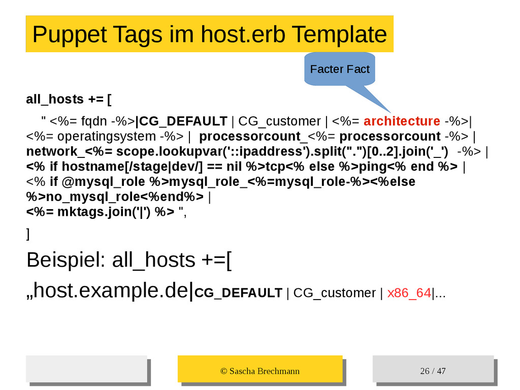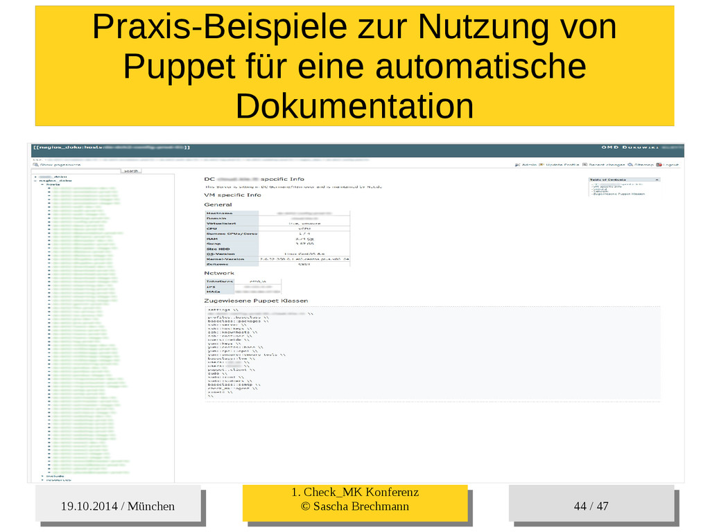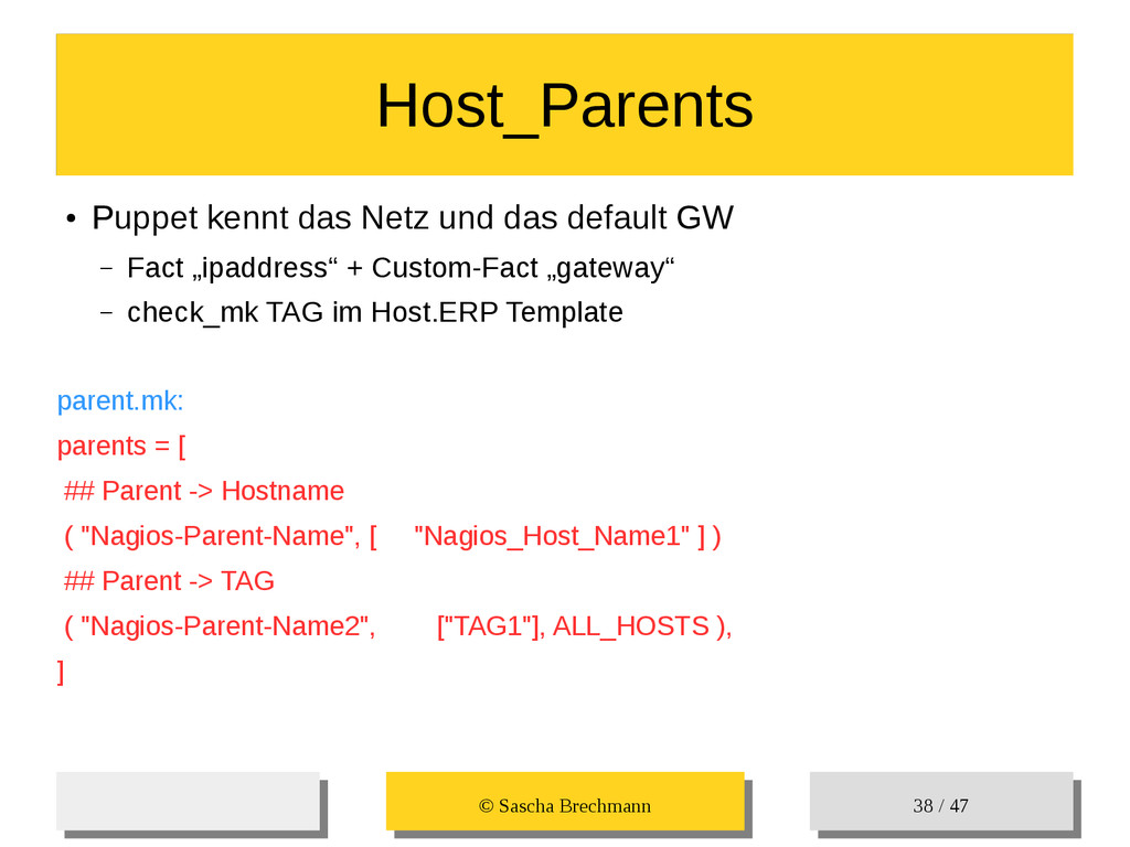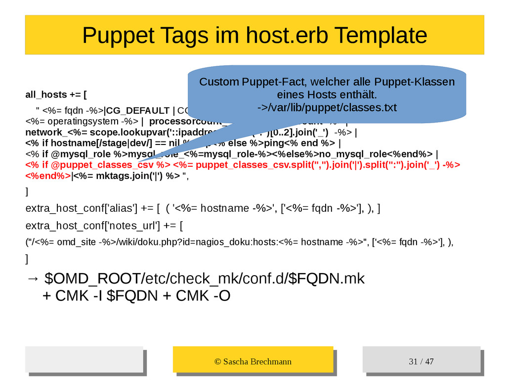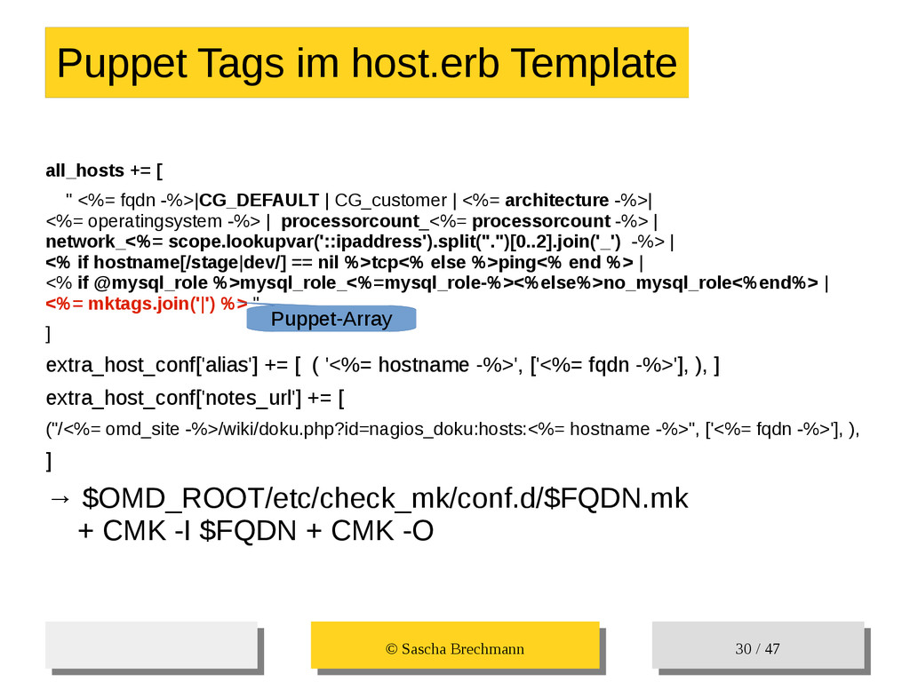 / 47 Hosts-Groups Hosts-Groups • Erzeugen von dynamischen Host-Groups auf Basis des Custom-Facts „Puppet_classes_csv“ – Alle Host, welche das Tag „mysql__server“ (das ist die Puppet-classe „mysql::server“ in umgewandelter Form) haben sollen in die Hostgrouppe MySQL-Server • Erzeugen von dynamischen Host-Groups auf Basis der IP (Front-/Back-/Verwaltungs-LAN) • Erzeugen von dynamischen Host-Groups auf Basis des Environment (DEV; Stage; QA; Prod)