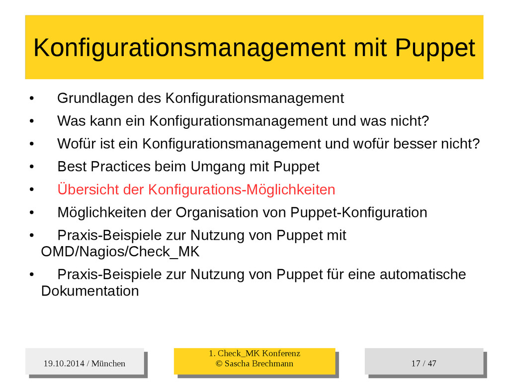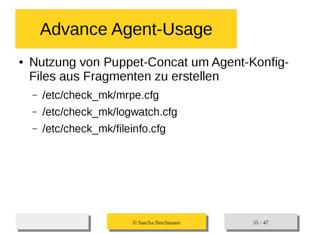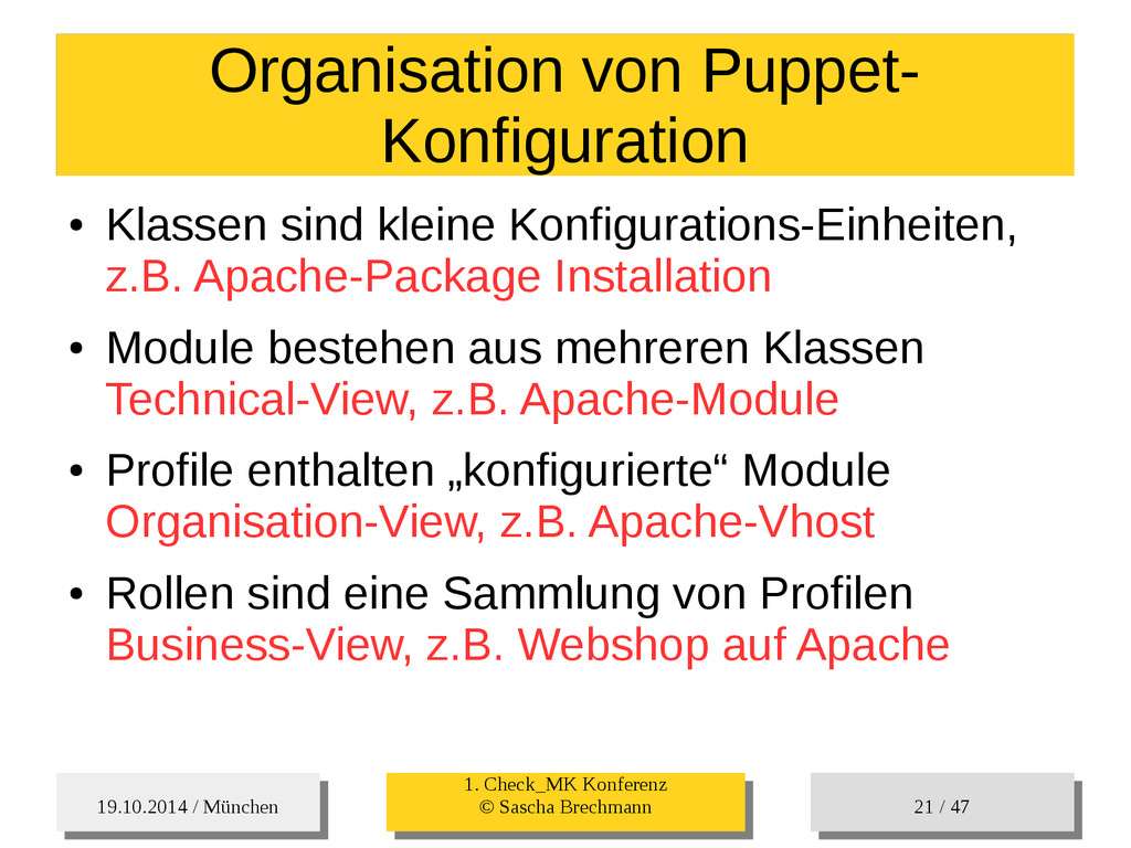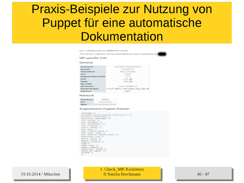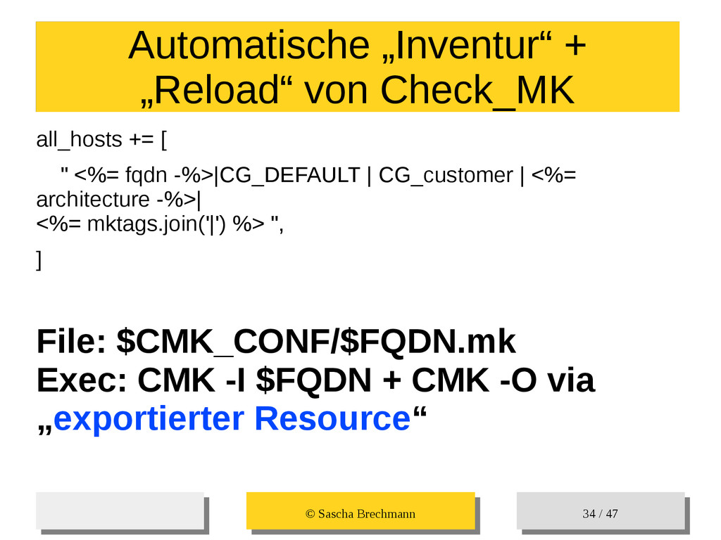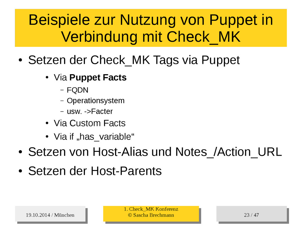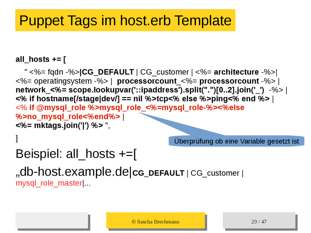 / 47 Hosts-Groups Hosts-Groups • Erzeugen von dynamischen Host-Groups auf Basis des Custom-Facts „Puppet_classes_csv“ – Alle Host, welche das Tag „mysql__server“ (das ist die Puppet-classe „mysql::server“ in umgewandelter Form) haben sollen in die Hostgrouppe MySQL-Server • Erzeugen von dynamischen Host-Groups auf Basis der IP (Front-/Back-/Verwaltungs-LAN) • Erzeugen von dynamischen Host-Groups auf Basis des Environment (DEV; Stage; QA; Prod)
