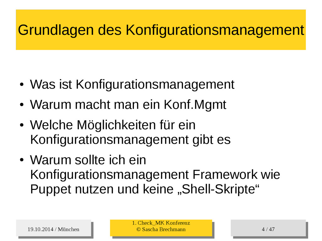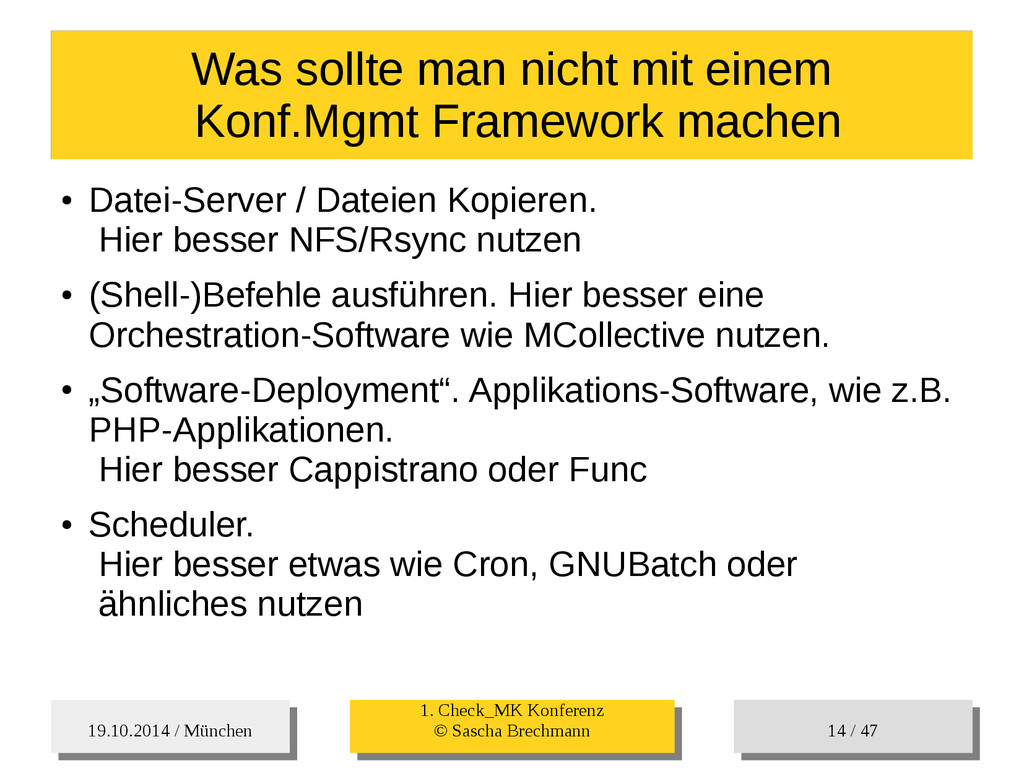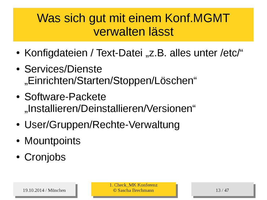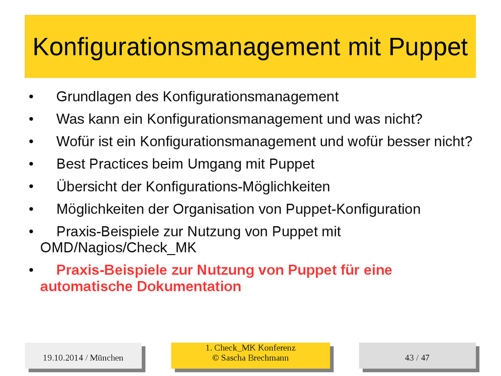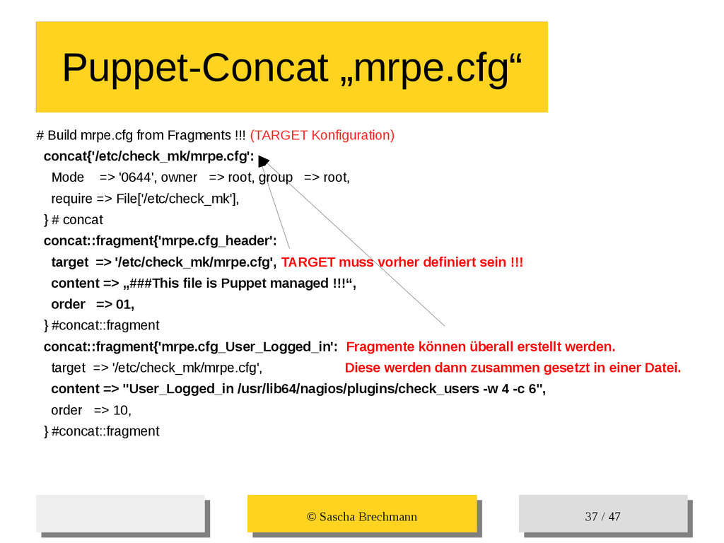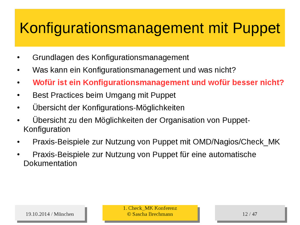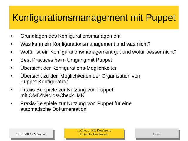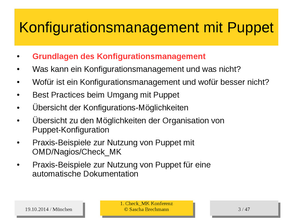 / 47 Hosts-Groups Hosts-Groups • Erzeugen von dynamischen Host-Groups auf Basis des Custom-Facts „Puppet_classes_csv“ – Alle Host, welche das Tag „mysql__server“ (das ist die Puppet-classe „mysql::server“ in umgewandelter Form) haben sollen in die Hostgrouppe MySQL-Server • Erzeugen von dynamischen Host-Groups auf Basis der IP (Front-/Back-/Verwaltungs-LAN) • Erzeugen von dynamischen Host-Groups auf Basis des Environment (DEV; Stage; QA; Prod)
