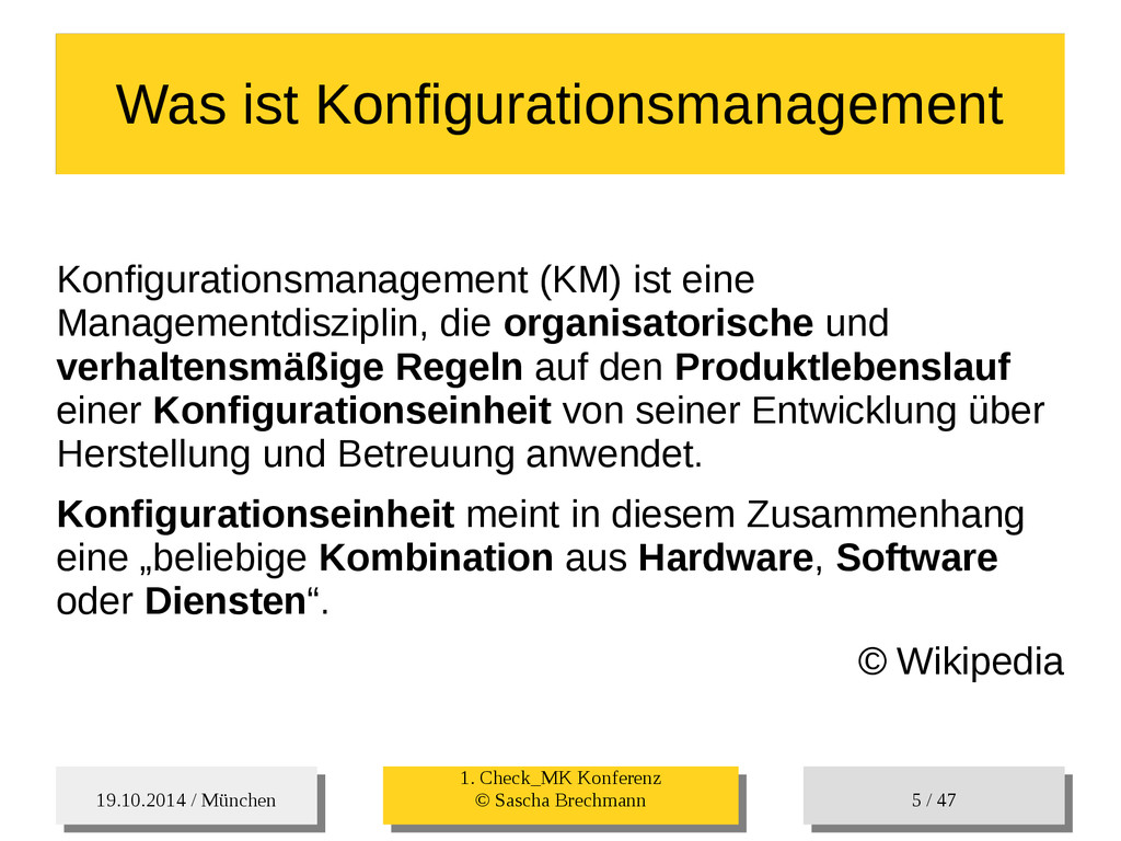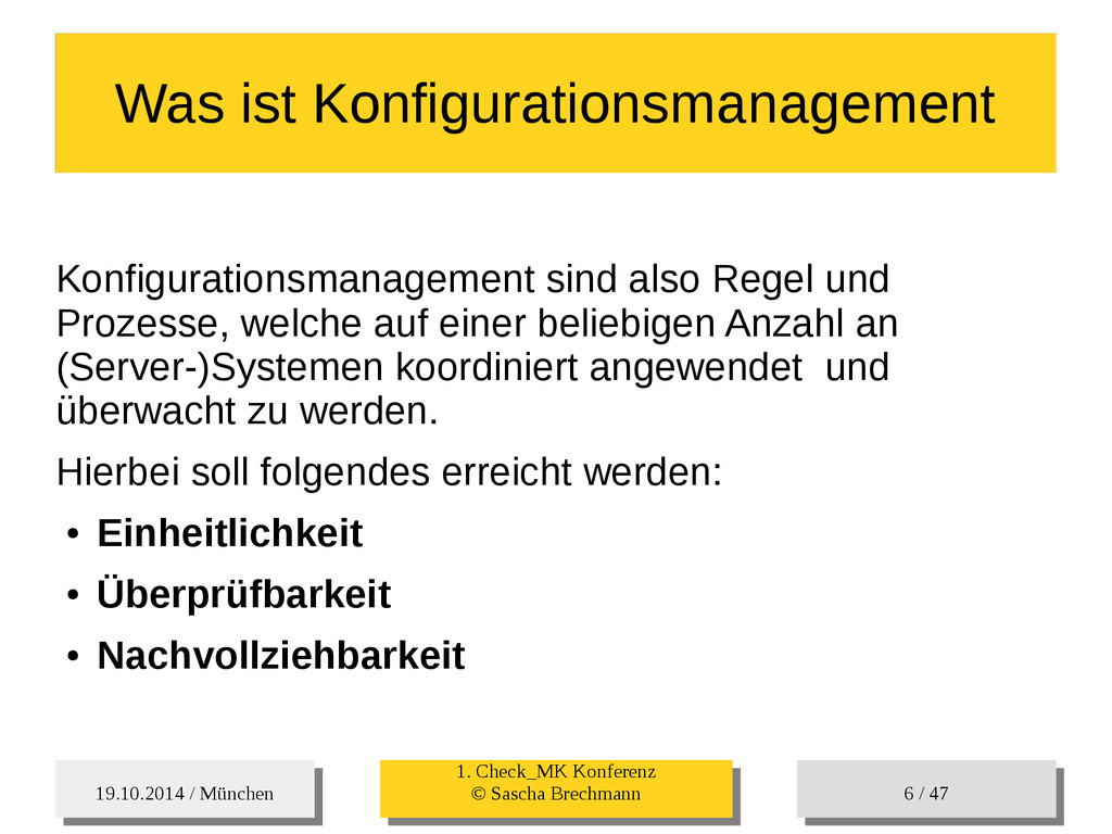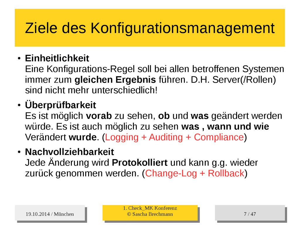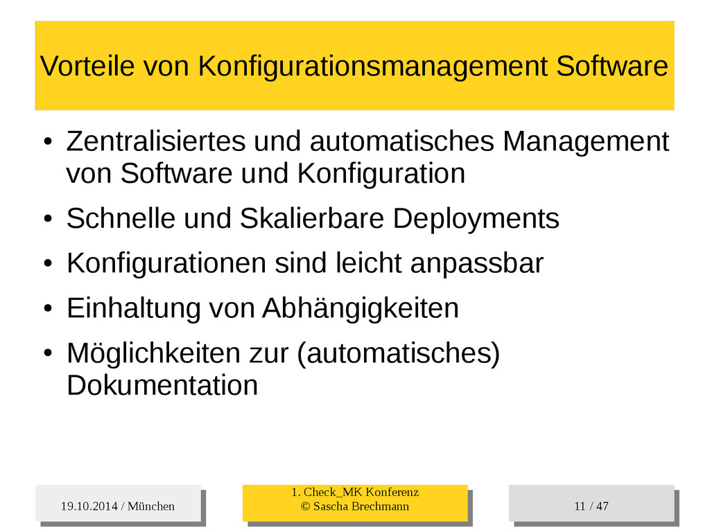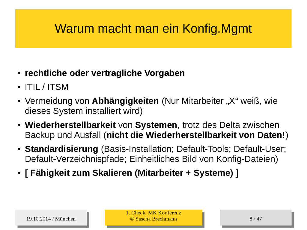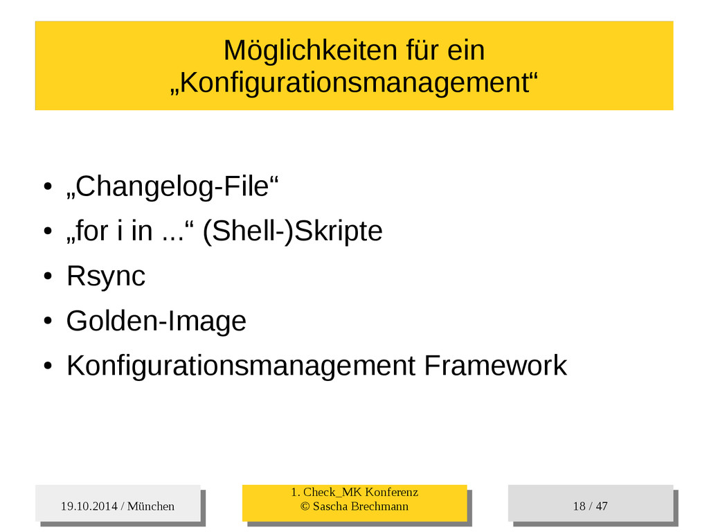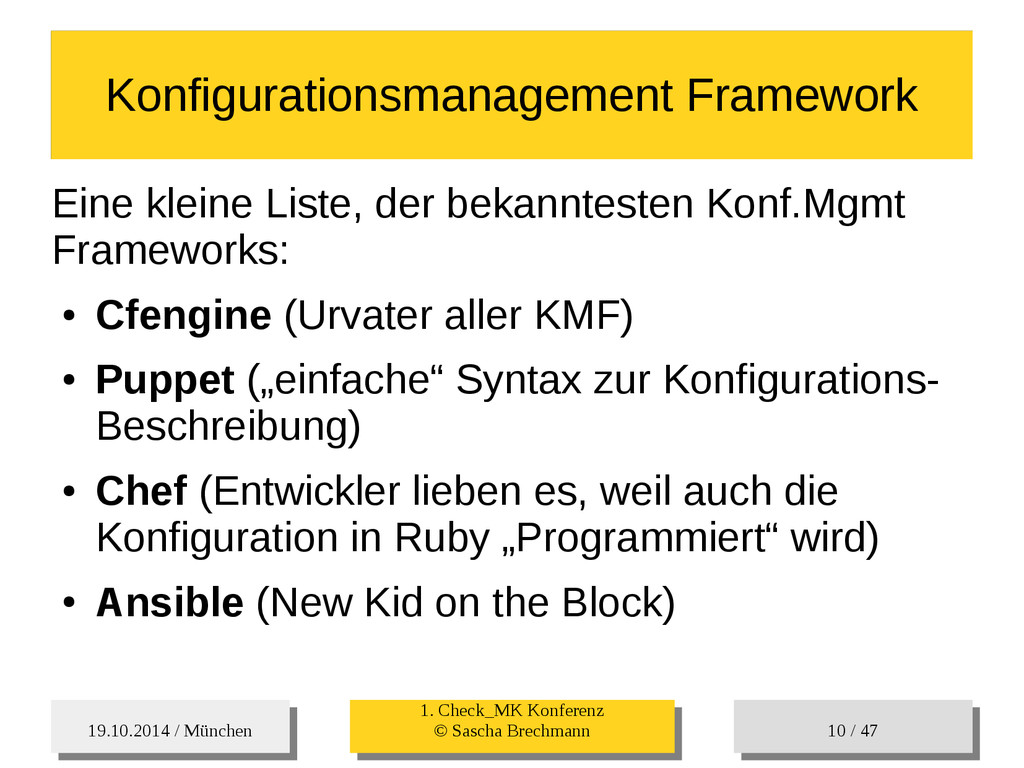 / 47 Hosts-Groups Hosts-Groups • Erzeugen von dynamischen Host-Groups auf Basis des Custom-Facts „Puppet_classes_csv“ – Alle Host, welche das Tag „mysql__server“ (das ist die Puppet-classe „mysql::server“ in umgewandelter Form) haben sollen in die Hostgrouppe MySQL-Server • Erzeugen von dynamischen Host-Groups auf Basis der IP (Front-/Back-/Verwaltungs-LAN) • Erzeugen von dynamischen Host-Groups auf Basis des Environment (DEV; Stage; QA; Prod)