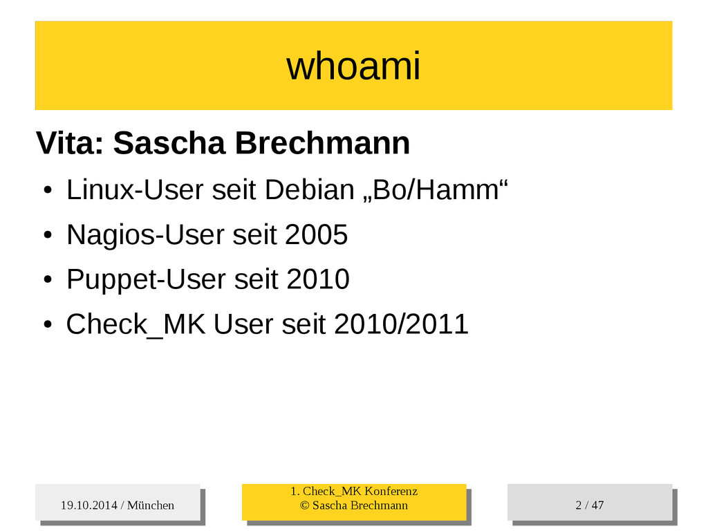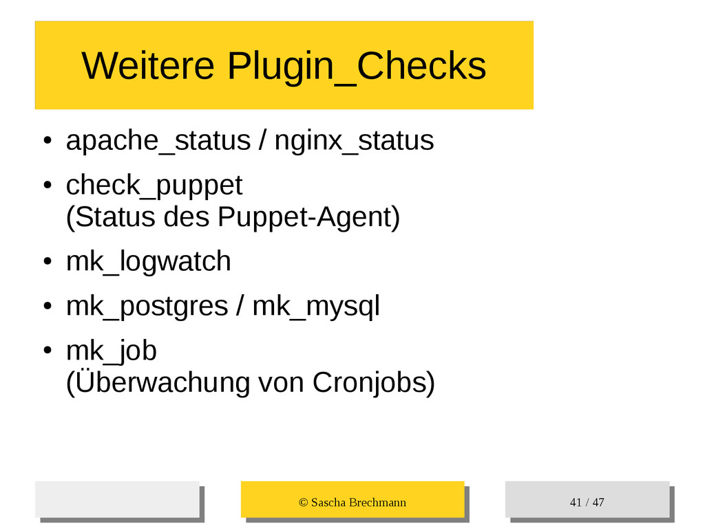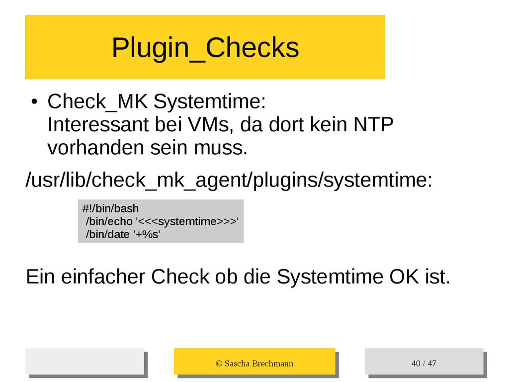 / 47 • Check_MK Systemtime: Interessant bei VMs, da dort kein NTP vorhanden sein muss. /usr/lib/check_mk_agent/plugins/systemtime: Ein einfacher Check ob die Systemtime OK ist. Plugin_Checks Plugin_Checks #!/bin/bash /bin/echo '<<<systemtime>>>' /bin/date '+%s'