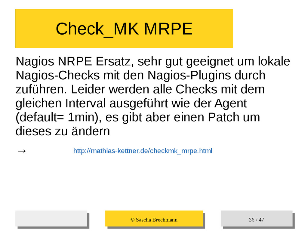/ 47 Check_MK MRPE Check_MK MRPE Nagios NRPE Ersatz, sehr gut geeignet um lokale Nagios-Checks mit den Nagios-Plugins durch zuführen. Leider werden alle Checks mit dem gleichen Interval ausgeführt wie der Agent (default= 1min), es gibt aber einen Patch um dieses zu ändern → http://mathias-kettner.de/checkmk_mrpe.html