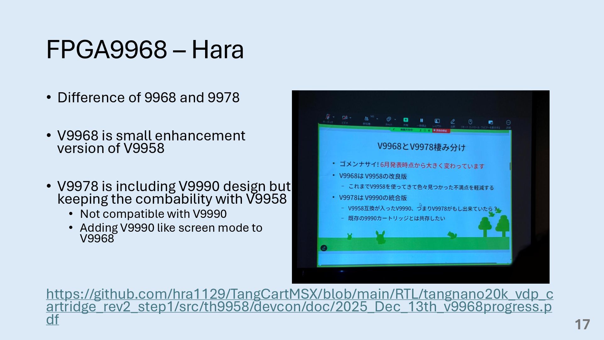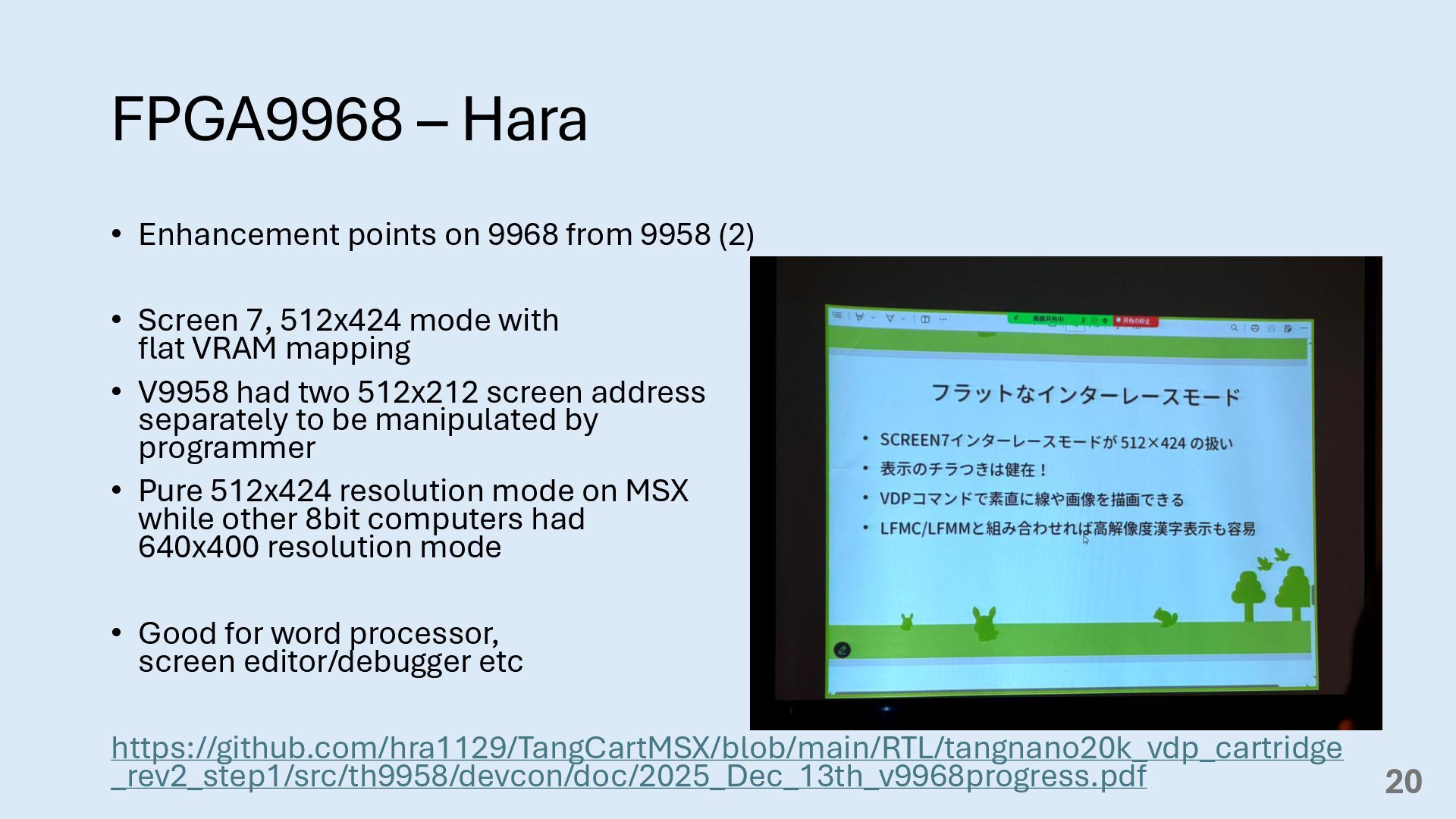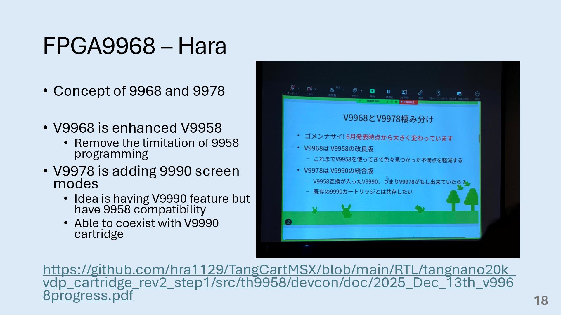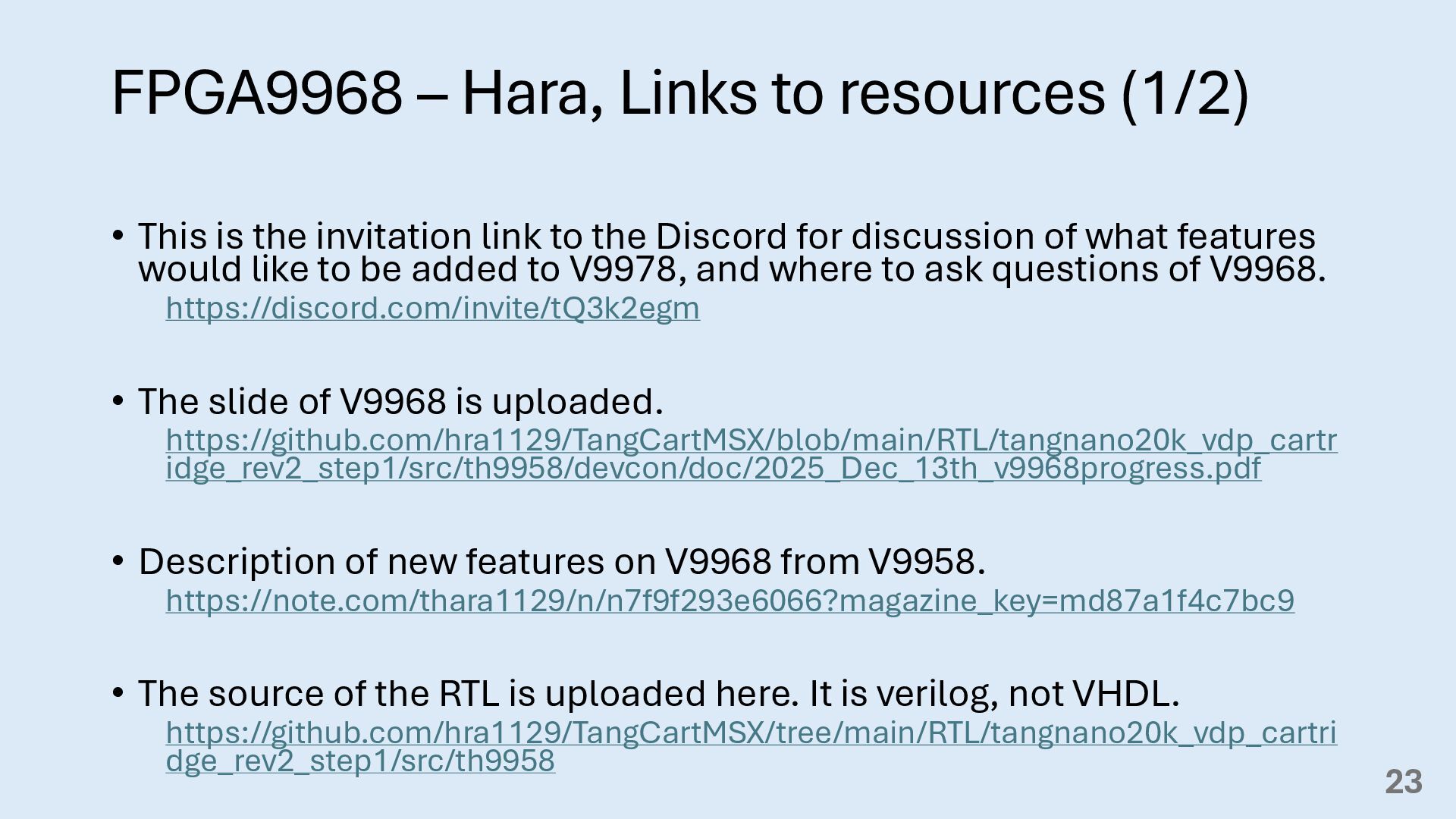 the invitation link to the Discord for discussion of what features would like to be added to V9978, and where to ask questions of V9968. https://discord.com/invite/tQ3k2egm • The slide of V9968 is uploaded. https://github.com/hra1129/TangCartMSX/blob/main/RTL/tangnano20k_vdp_cartr idge_rev2_step1/src/th9958/devcon/doc/2025_Dec_13th_v9968progress.pdf • Description of new features on V9968 from V9958. https://note.com/thara1129/n/n7f9f293e6066?magazine_key=md87a1f4c7bc9 • The source of the RTL is uploaded here. It is verilog, not VHDL. https://github.com/hra1129/TangCartMSX/tree/main/RTL/tangnano20k_vdp_cartri dge_rev2_step1/src/th9958 23