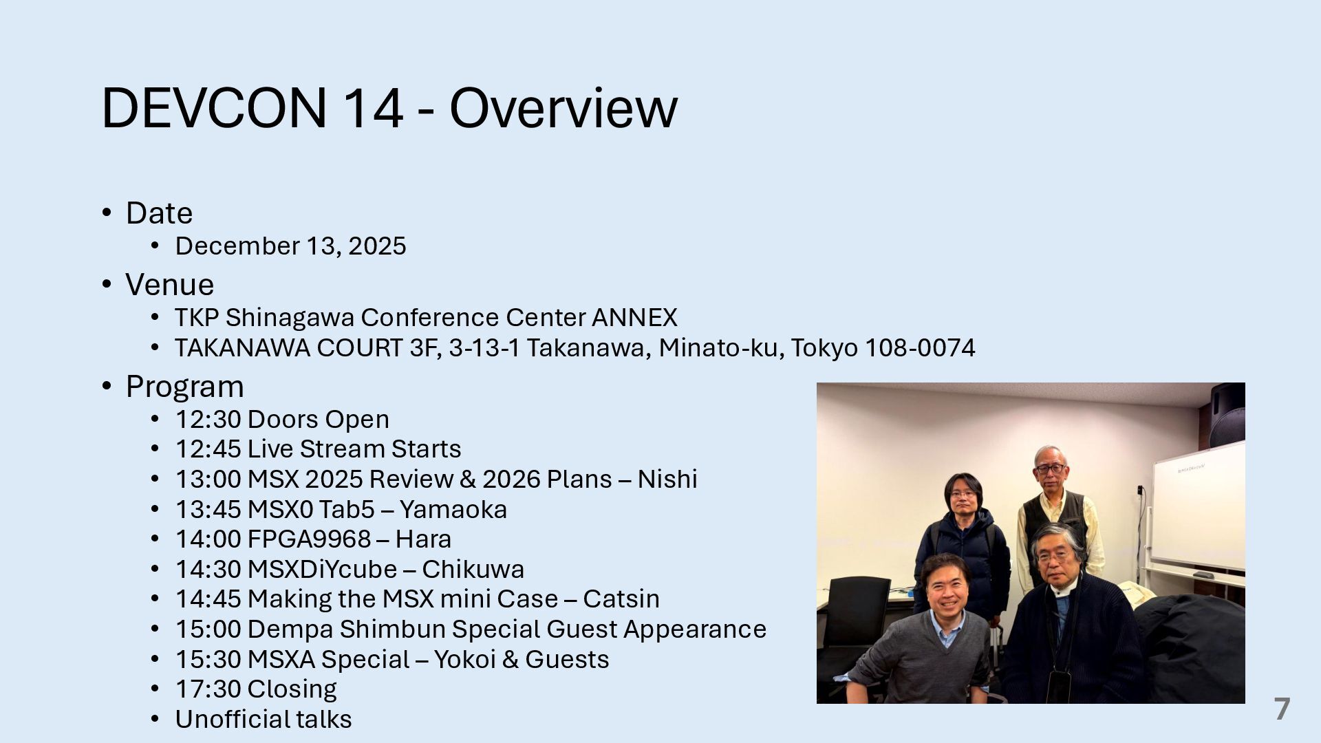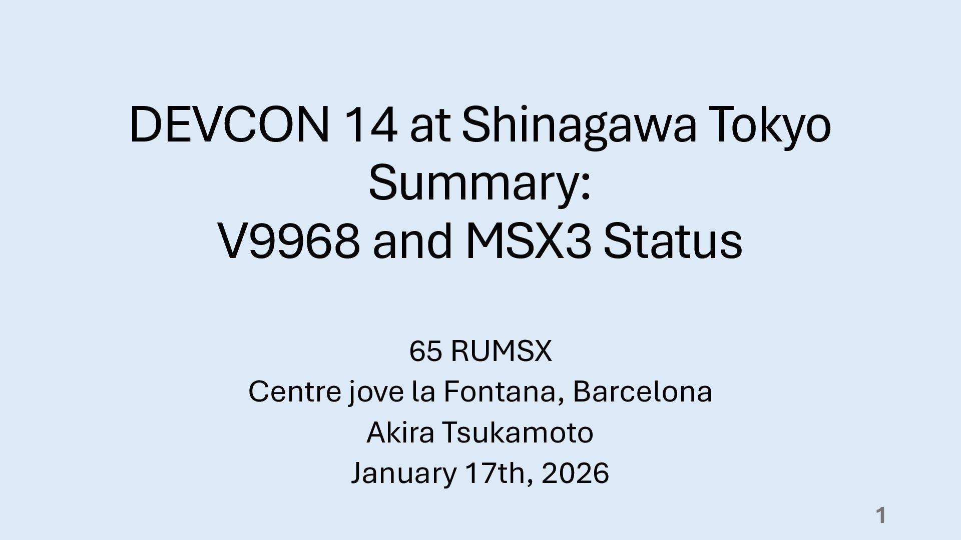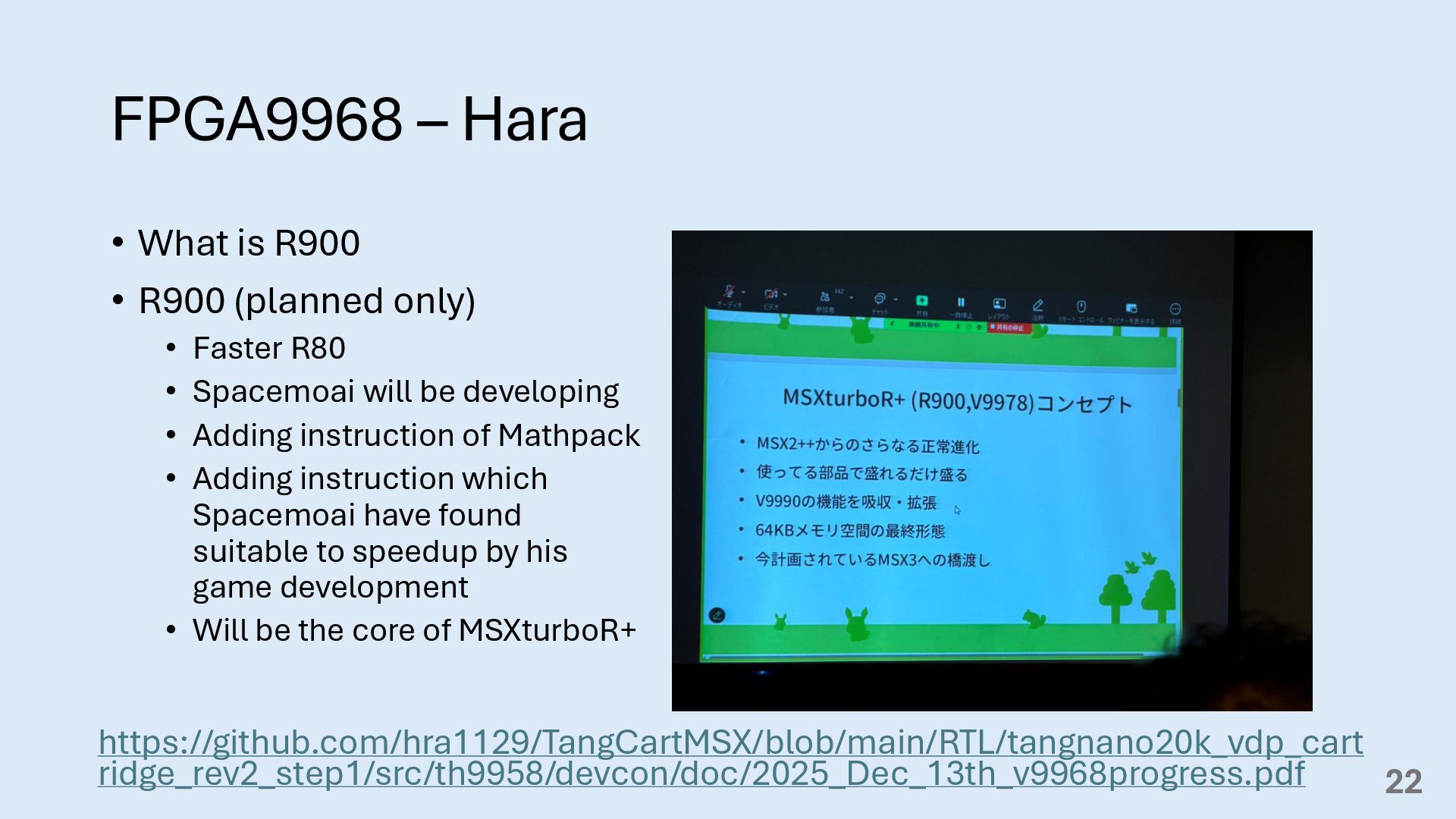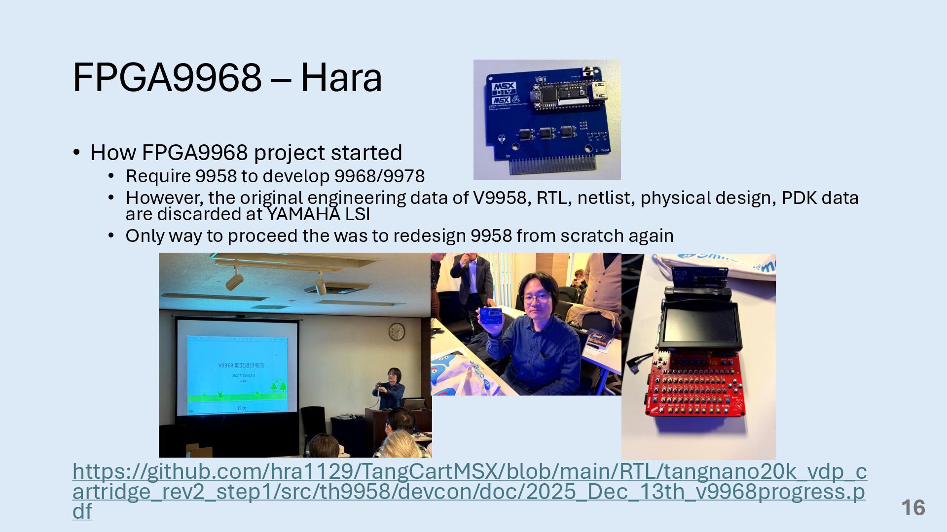 the invitation link to the Discord for discussion of what features would like to be added to V9978, and where to ask questions of V9968. https://discord.com/invite/tQ3k2egm • The slide of V9968 is uploaded. https://github.com/hra1129/TangCartMSX/blob/main/RTL/tangnano20k_vdp_cartr idge_rev2_step1/src/th9958/devcon/doc/2025_Dec_13th_v9968progress.pdf • Description of new features on V9968 from V9958. https://note.com/thara1129/n/n7f9f293e6066?magazine_key=md87a1f4c7bc9 • The source of the RTL is uploaded here. It is verilog, not VHDL. https://github.com/hra1129/TangCartMSX/tree/main/RTL/tangnano20k_vdp_cartri dge_rev2_step1/src/th9958 23