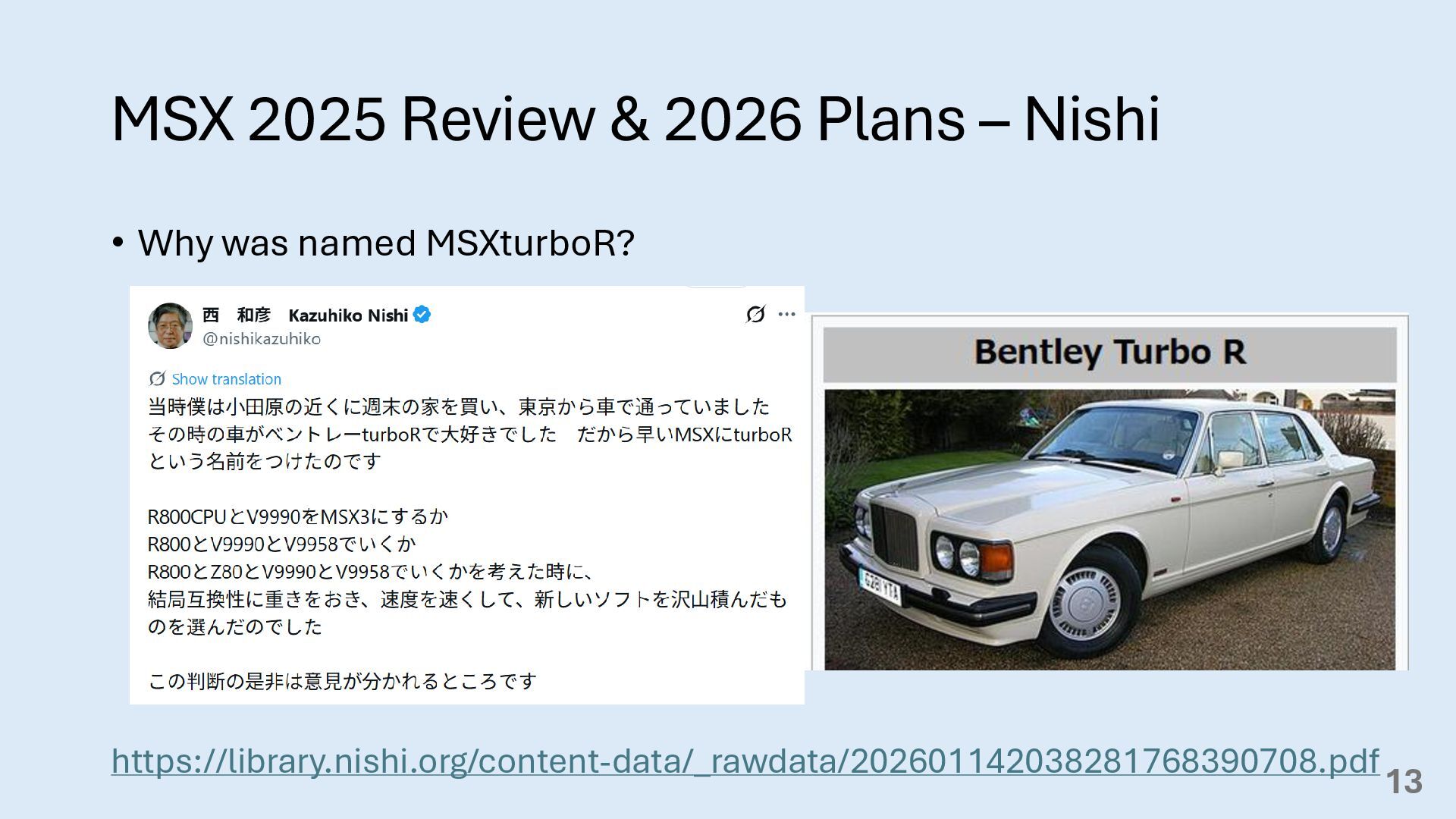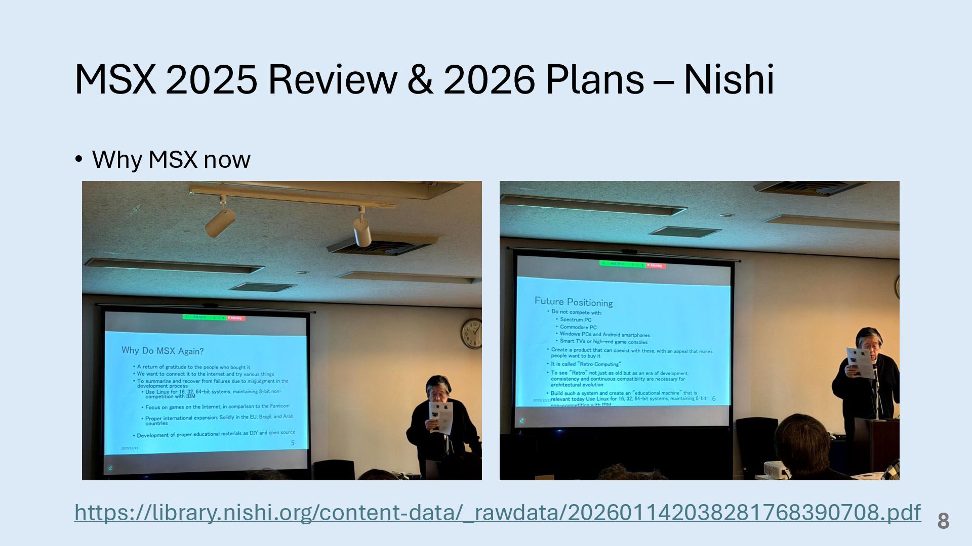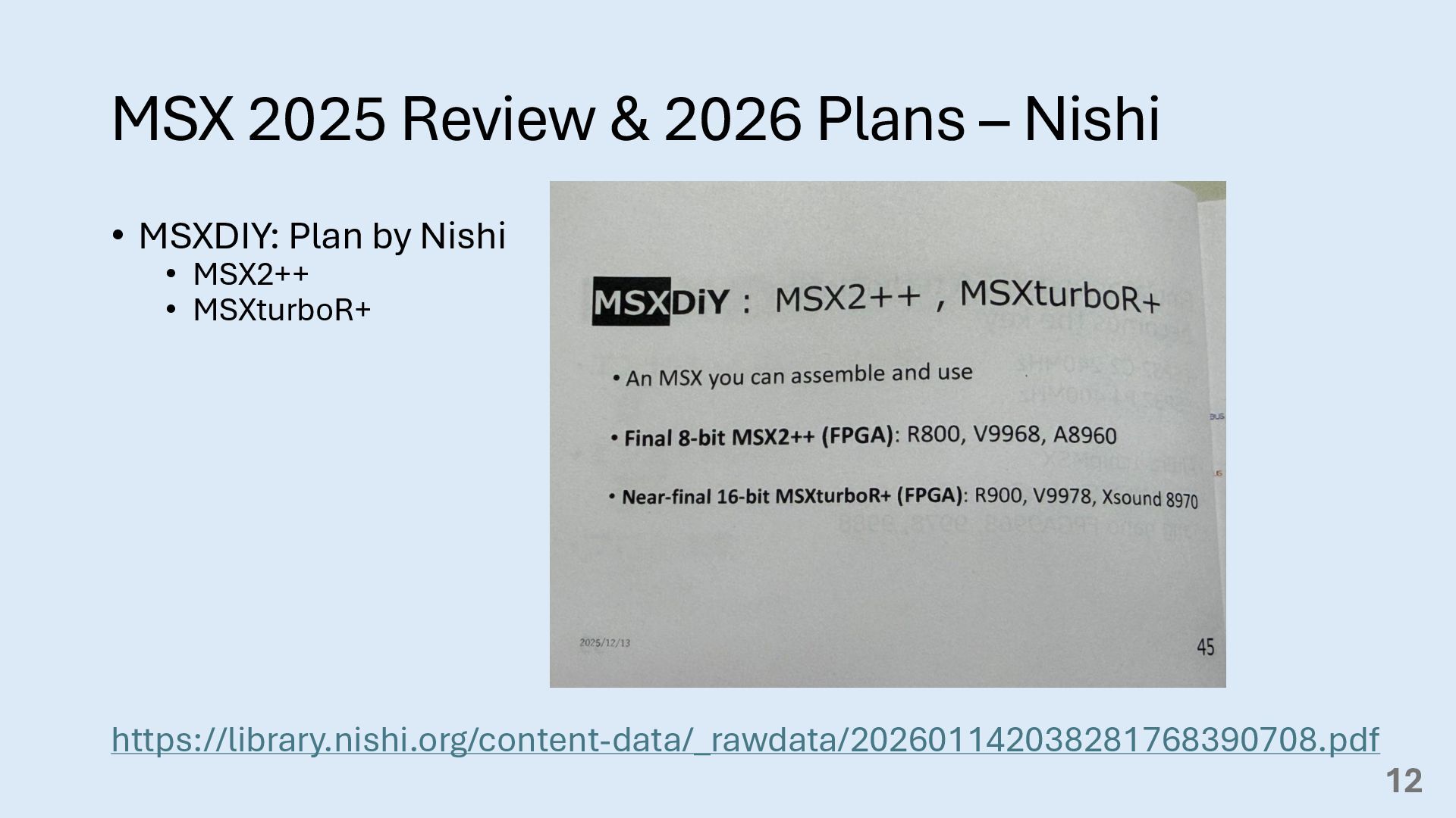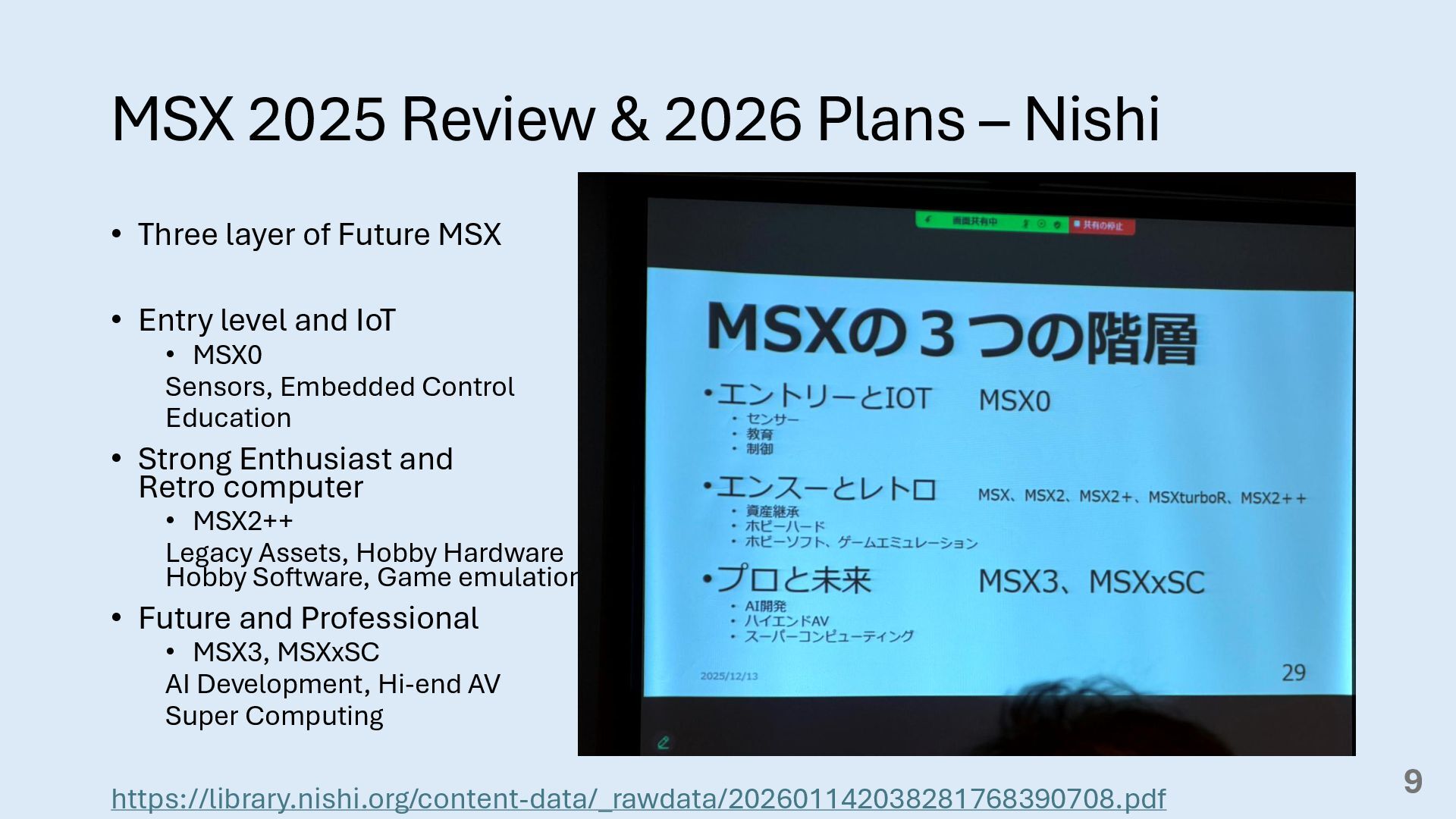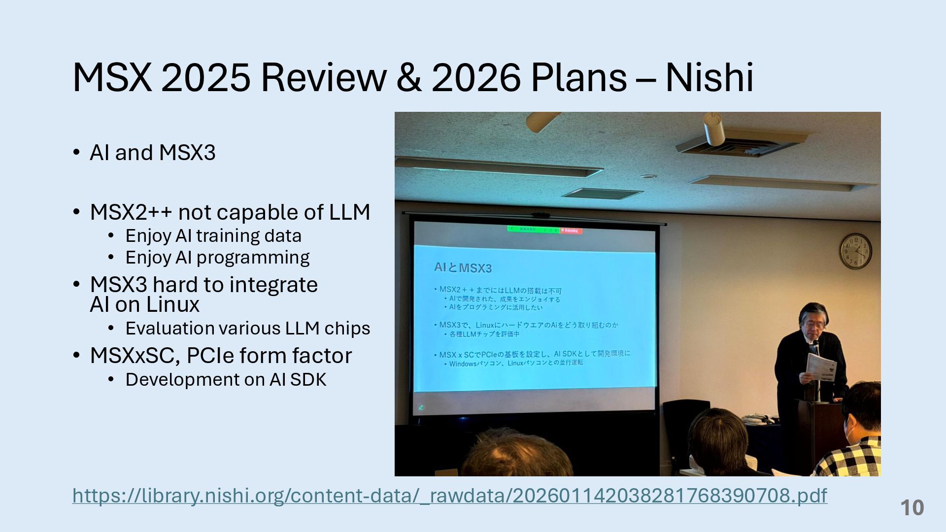 layer of Future MSX • Entry level and IoT • MSX0 Sensors, Embedded Control Education • Strong Enthusiast and Retro computer • MSX2++ Legacy Assets, Hobby Hardware Hobby Software, Game emulation • Future and Professional • MSX3, MSXxSC AI Development, Hi-end AV Super Computing https://library.nishi.org/content-data/_rawdata/202601142038281768390708.pdf 9