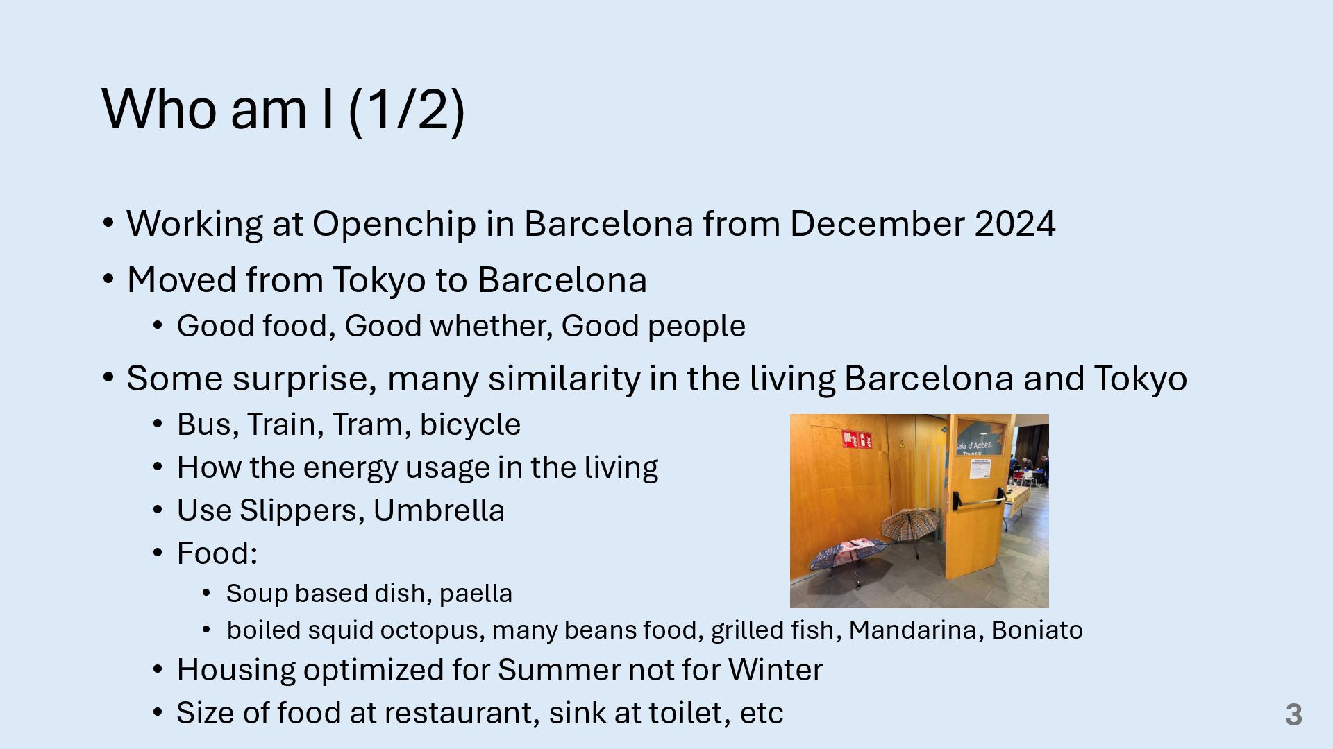 from December 2024 • Moved from Tokyo to Barcelona • Good food, Good whether, Good people • Some surprise, many similarity in the living Barcelona and Tokyo • Bus, Train, Tram, bicycle • How the energy usage in the living • Use Slippers, Umbrella • Food: • Soup based dish, paella • boiled squid octopus, many beans food, grilled fish, Mandarina, Boniato • Housing optimized for Summer not for Winter • Size of food at restaurant, sink at toilet, etc 3