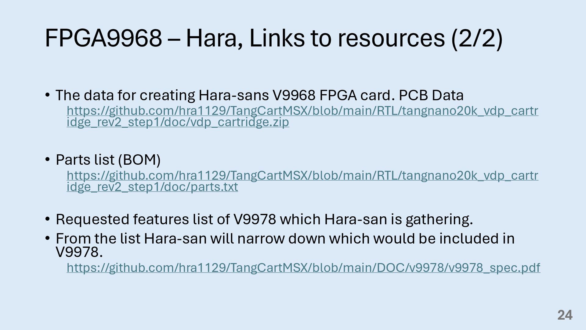 for creating Hara-sans V9968 FPGA card. PCB Data https://github.com/hra1129/TangCartMSX/blob/main/RTL/tangnano20k_vdp_cartr idge_rev2_step1/doc/vdp_cartridge.zip • Parts list (BOM) https://github.com/hra1129/TangCartMSX/blob/main/RTL/tangnano20k_vdp_cartr idge_rev2_step1/doc/parts.txt • Requested features list of V9978 which Hara-san is gathering. • From the list Hara-san will narrow down which would be included in V9978. https://github.com/hra1129/TangCartMSX/blob/main/DOC/v9978/v9978_spec.pdf 24
