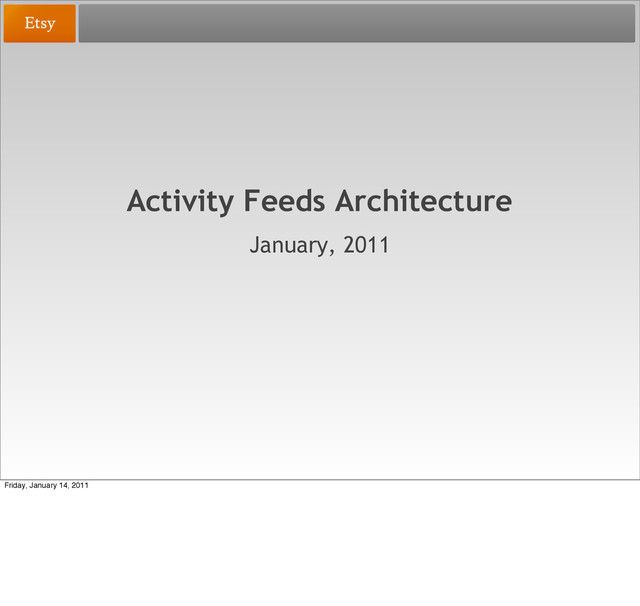 This describes the architecture behind the original incarnation of Etsy Activity feeds, as they were built in late 2010. The details differ significantly now. That said, this version of the architecture scaled up more than 20x before anyone had to change anything significantly.