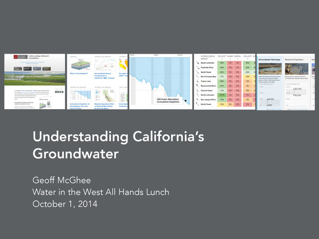 2014 • Timed for August return of state legislators, prior to debate and votes on groundwater regulation and water bond • Four articles (fifth published in September) • Written by Tara, Janny, Melissa, Bec, and Geoff • Infographics by Geoff and Paul Van Slembrouck and Michael Porath of Halftone (halftone.co) • URL: waterinthewest.stanford.edu/groundwater ! “Understanding California’s Groundwater”