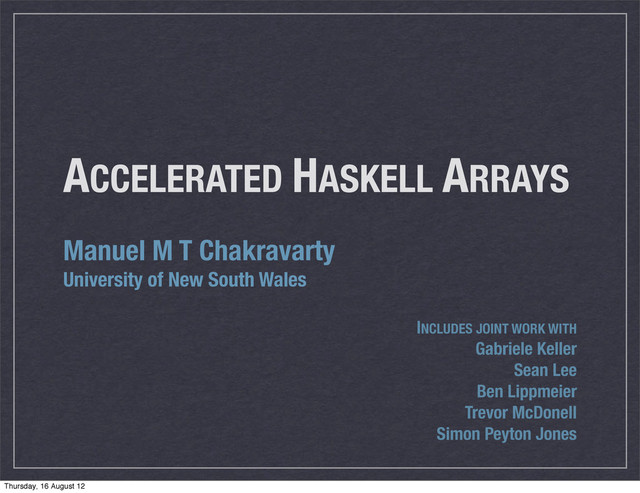 data parallel) Support for multiple backends Status: ‣ On GitHub: https://github.com/AccelerateHS/accelerate ‣ Under active development Thursday, 16 August 12