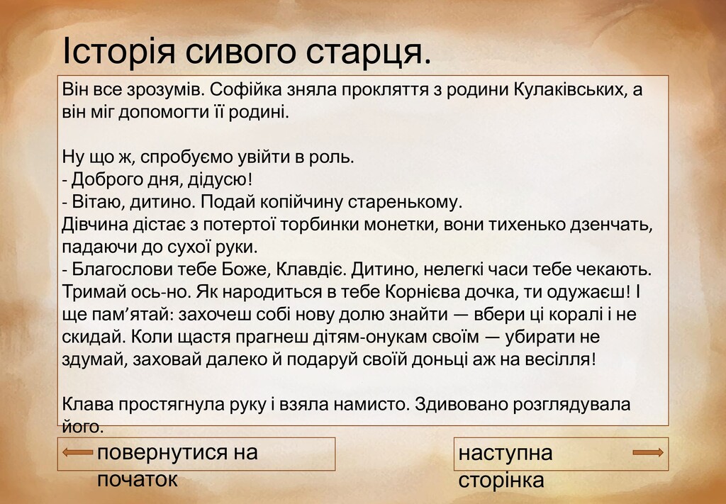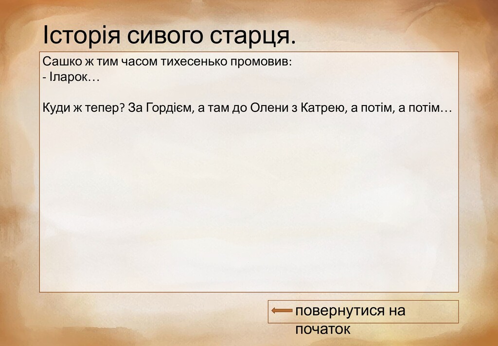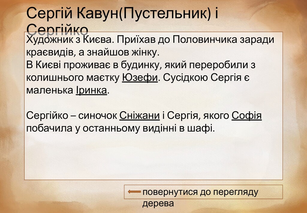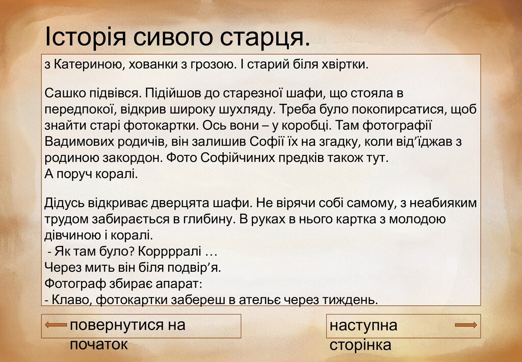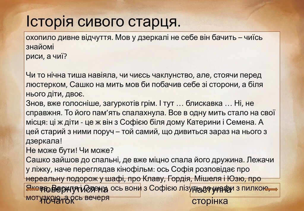 себе він бачить – чиїсь знайомі риси, а чиї? Чи то нічна тиша навіяла, чи чиєсь чаклунство, але, стоячи перед люстерком, Сашко на мить мов би побачив себе зі сторони, а біля нього діти, двоє. Знов, вже голосніше, загуркотів грім. І тут … блискавка … Ні, не справжня. То його пам’ять спалахнула. Все в одну мить стало на свої місця: ці ж діти - це ж він з Софією біля дому Катерини і Семена. А цей старий з ними поруч – той самий, що дивиться зараз на нього з дзеркала! Не може бути! Чи може? Сашко зайшов до спальні, де вже міцно спала його дружина. Лежачи у ліжку, наче переглядав кінофільм: ось Софія розповідає про нереальну подорож у шафі, про Клаву, Гордія, Мішеля і Юзю, про Якова, Василя і Олену, ось вони з Софією лізуть до шафи з пилкою, мотузкою, а ось вечеря повернутися на початок наступна сторінка