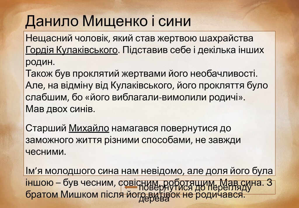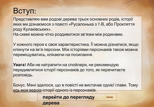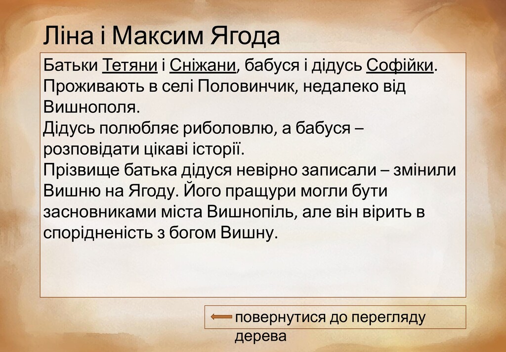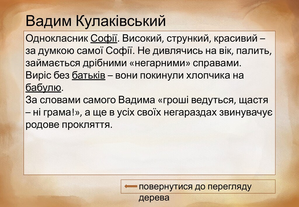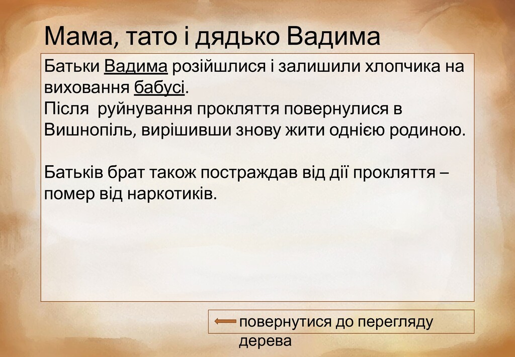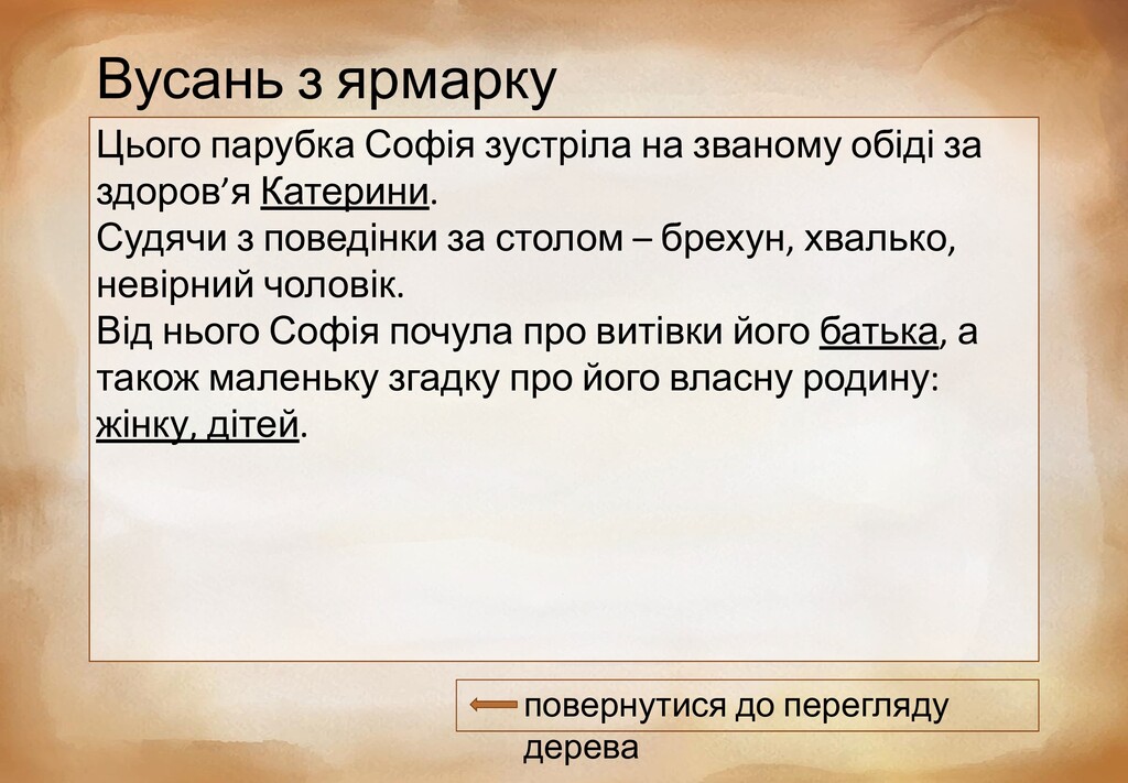 себе він бачить – чиїсь знайомі риси, а чиї? Чи то нічна тиша навіяла, чи чиєсь чаклунство, але, стоячи перед люстерком, Сашко на мить мов би побачив себе зі сторони, а біля нього діти, двоє. Знов, вже голосніше, загуркотів грім. І тут … блискавка … Ні, не справжня. То його пам’ять спалахнула. Все в одну мить стало на свої місця: ці ж діти - це ж він з Софією біля дому Катерини і Семена. А цей старий з ними поруч – той самий, що дивиться зараз на нього з дзеркала! Не може бути! Чи може? Сашко зайшов до спальні, де вже міцно спала його дружина. Лежачи у ліжку, наче переглядав кінофільм: ось Софія розповідає про нереальну подорож у шафі, про Клаву, Гордія, Мішеля і Юзю, про Якова, Василя і Олену, ось вони з Софією лізуть до шафи з пилкою, мотузкою, а ось вечеря повернутися на початок наступна сторінка