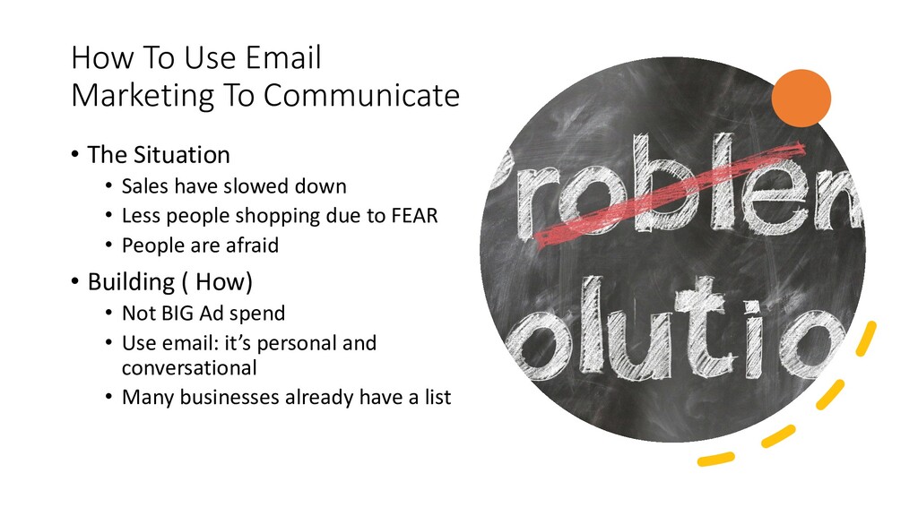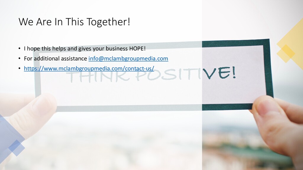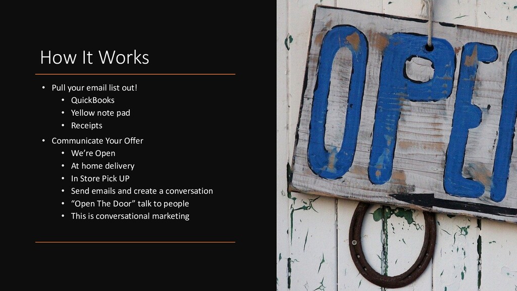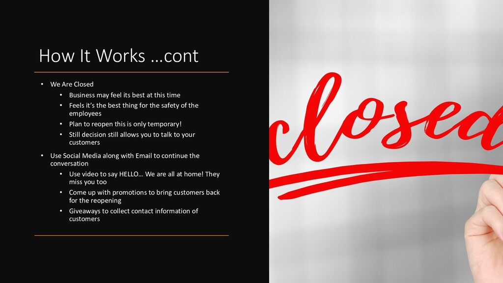 may feel its best at this time • Feels it’s the best thing for the safety of the employees • Plan to reopen this is only temporary! • Still decision still allows you to talk to your customers • Use Social Media along with Email to continue the conversation • Use video to say HELLO… We are all at home! They miss you too • Come up with promotions to bring customers back for the reopening • Giveaways to collect contact information of customers