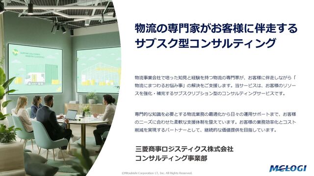 Inc. All Rights Reserved. サービスご利用の流れと次のステップ サブスク型コンサルティングの導入は、シンプルなプロセスで進めることができます。 お客様のニーズをしっかりと理解した上で、最適なサポート体制を構築します。 まずはお気軽にご相談ください。 無料相談 まずは、お客様の物流課題や目標についてお聞かせください。初回のコンサルテーションは無料 で実施します。お客様の状況を深く理解することで、最適なサポート内容を提案いたします。 プラン設計 お客様のニーズと予算に合わせた最適なプランをご提案します。月額費用や契約期間、サ ポート内容など、柔軟にカスタマイズが可能です。お客様にとって最も価値のある形での 提供を目指します。 契約・開始 契約締結後、すぐにサービスを開始できます。担当コンサルタントが決まり、定期的な ミーティングやサポート体制が確立されます。お客様の業務に寄り添いながら、物流課 題の解決を支援します。 物流の悩みは早期解決が重要です。課題が大きくなる前に、専門家のサポートを受け ることで効率的な解決が可能になります。まずはお気軽にお問い合わせください。 お客様の物流課題に対する最適な解決策をご提案いたします。