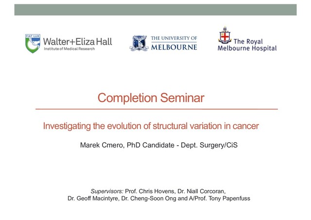 C.S., Yuan, K., Schröder, J., Kangbo, M., PCAWG Evolution and Heterogeneity Working Group, Corcoran, N.M., Papenfuss, T., Hovens, C.M., Markowetz, F., Macintyre, G. SVclone: inferring structural variant cancer cell fraction. • Gerstung, M. et al. [author 22 of 45] (2017). The evolutionary history of 2,658 cancers. bioRxiv 161562; doi: https://doi.org/10.1101/161562 • 2016 • Mangiola, S., Hong, M. K., Cmero, M., Kurganovs, N., Ryan, A., Costello, A. J., ... & Hovens, C. M. (2016). Comparing nodal versus bony metastatic spread using tumour phylogenies. Scientific Reports, 6. • Stuchbery, R., Macintyre, G., Cmero, M., Harewood, L. M., Peters, J. S., Costello, A. J., ... & Corcoran, N. M. (2016). Reduction in expression of the benign AR transcriptome is a hallmark of localised prostate cancer progression. Oncotarget, 7(21), 31384. • Sapre, N., Macintyre, G., Clarkson, M., Naeem, H., Cmero, M., Kowalczyk, A., ... & Hovens, C. M. (2016). A urinary microRNA signature can predict the presence of bladder urothelial carcinoma in patients undergoing surveillance. British journal of cancer, 114(4), 454-462. • 2015 • Johanson, T. M., Keown, A. A., Cmero, M., Yeo, J. H., Kumar, A., Lew, A. M., ... & Chong, M. M. (2015). Drosha controls dendritic cell development by cleaving messenger RNAs encoding inhibitors of myelopoiesis. Nature immunology, 16(11), 1134-1141. • Hong, Matthew K.H., et al. [author 9 of 29] (2015). Tracking the origins and drivers of subclonal metastatic expansion in prostate cancer." Nature communications 6 • 2014 • Johanson, T. M., Cmero, M., Wettenhall, J., Lew, A. M., Zhan, Y., & Chong, M. M. (2014). A microRNA expression atlas of mouse dendritic cell development. Immunology and Cell Biology. • Schroeder, J., Hsu, A., Boyle, S. E., Macintyre, G., Cmero, M., Tothill, R. W. & Papenfuss, A. T. (2014). Socrates: identification of genomic rearrangements in tumour genomes by re-aligning soft clipped reads. Bioinformatics, btt767.