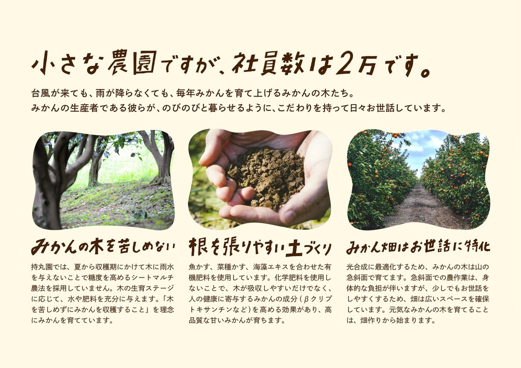 ʮ໦ Λۤ͠ΊͣʹΈ͔ΜΛऩ֭͢Δ͜ͱʯΛཧ೦ ʹΈ͔ΜΛҭ͍ͯͯ·͢ɻ ڕ͔͢ɺࡊछ͔͢ɺւ૶ΤΩεΛ߹Θͤͨ༗ ػංྉΛ࢖༻͍ͯ͠·͢ɻԽֶංྉΛ࢖༻͠ ͳ͍͜ͱͰɺ໦͕ٵऩ͠΍͍͚ͩ͢Ͱͳ͘ɺ ਓͷ݈߁ʹد༩͢ΔΈ͔Μͷ੒෼ ЌΫϦϓ τΩαϯνϯͳͲ ΛߴΊΔޮՌ͕͋Γɺߴ ඼࣭ͳ؁͍Έ͔Μ͕ҭͪ·͢ɻ ޫ߹੒ʹ࠷దԽ͢ΔͨΊɺΈ͔Μͷ໦͸ࢁͷ ٸࣼ໘Ͱҭͯ·͢ɻٸࣼ໘Ͱͷ೶࡞ۀ͸ɺ਎ ମతͳෛ୲͕൐͍·͕͢ɺগ͠Ͱ΋͓ੈ࿩Λ ͠΍͘͢͢ΔͨΊɺാ͸޿͍εϖʔεΛ֬อ ͍ͯ͠·͢ɻݩؾͳΈ͔Μͷ໦ΛҭͯΔ͜ͱ ͸ɺാ࡞Γ͔Β࢝·Γ·͢ɻ
