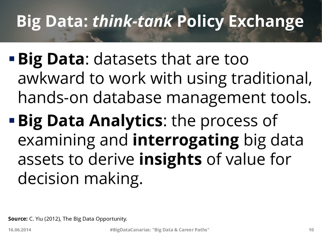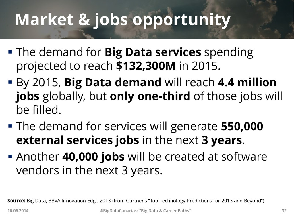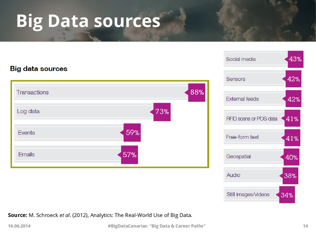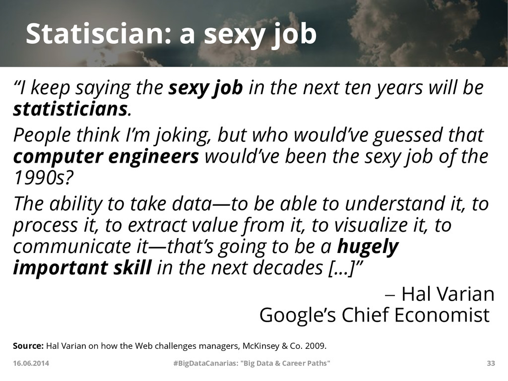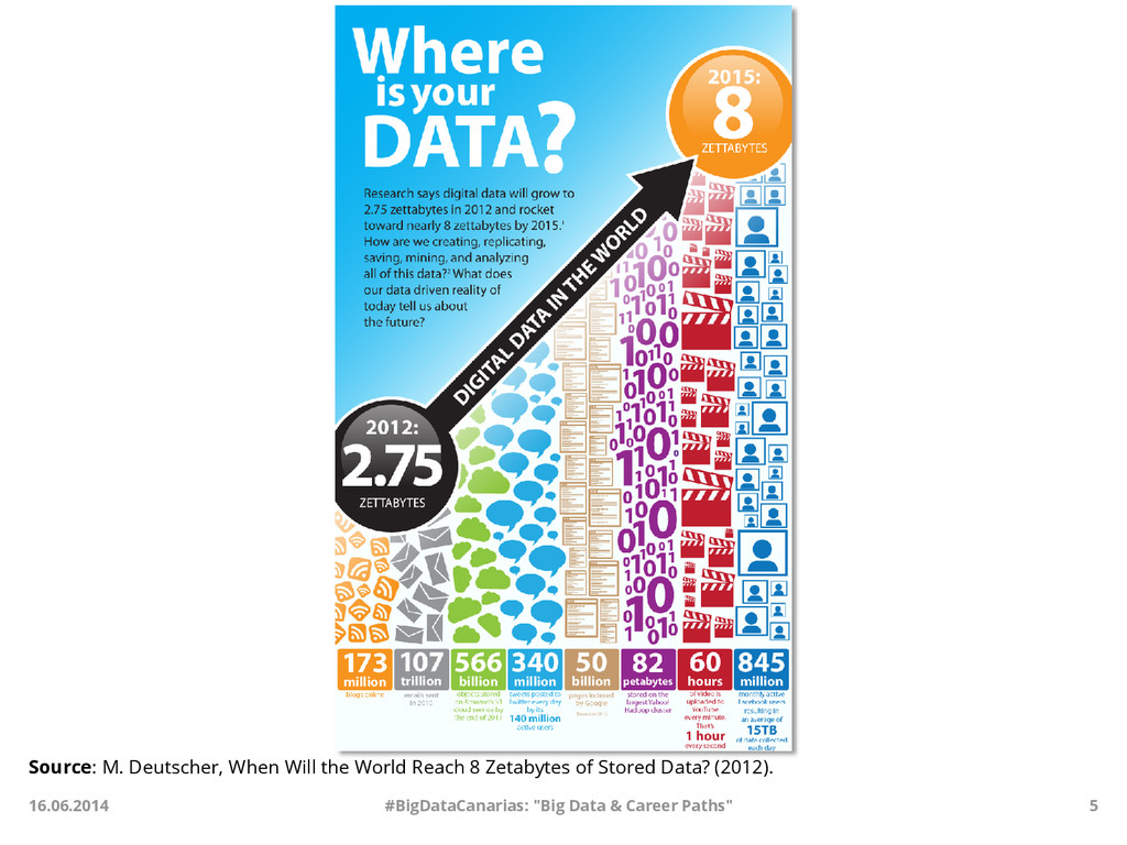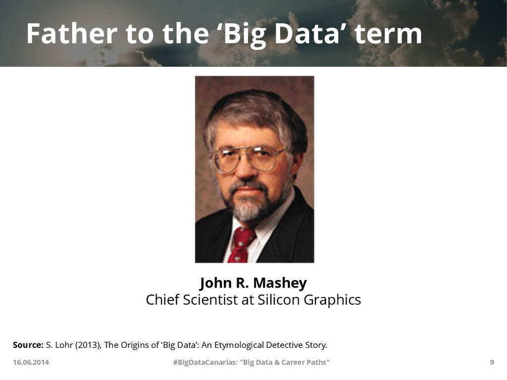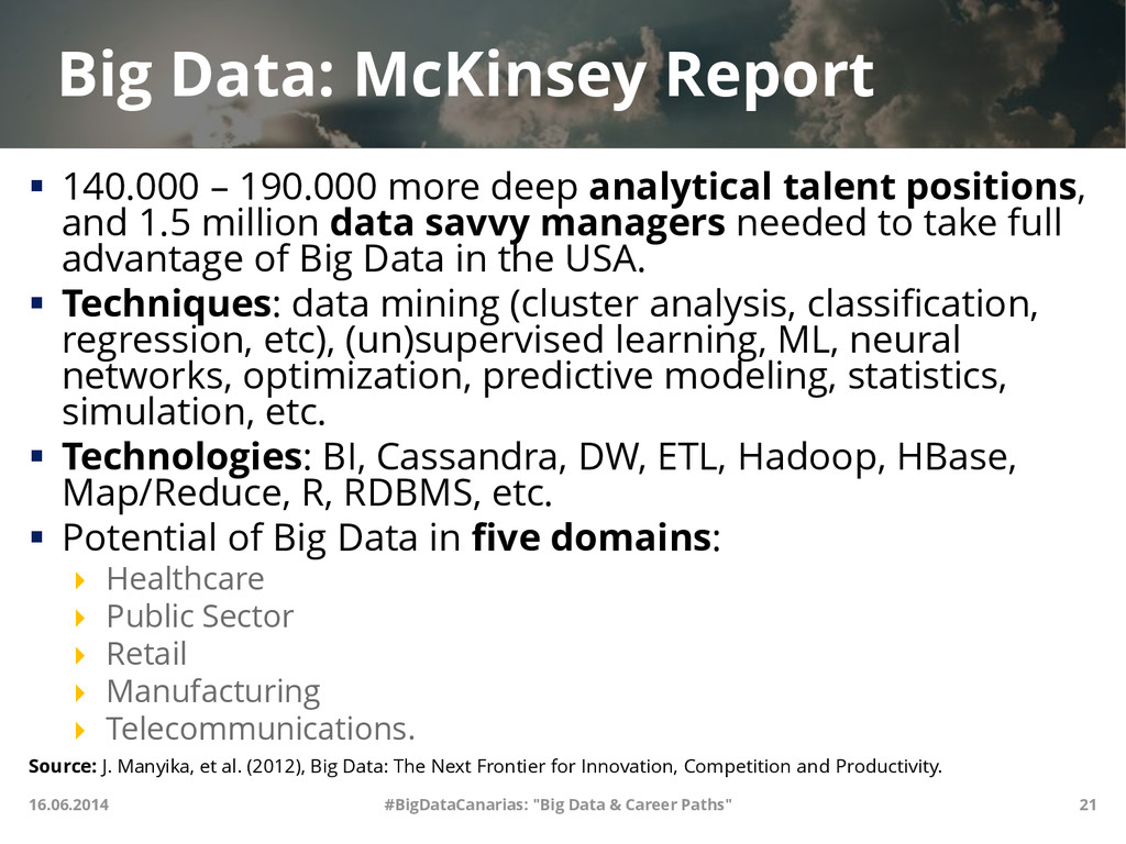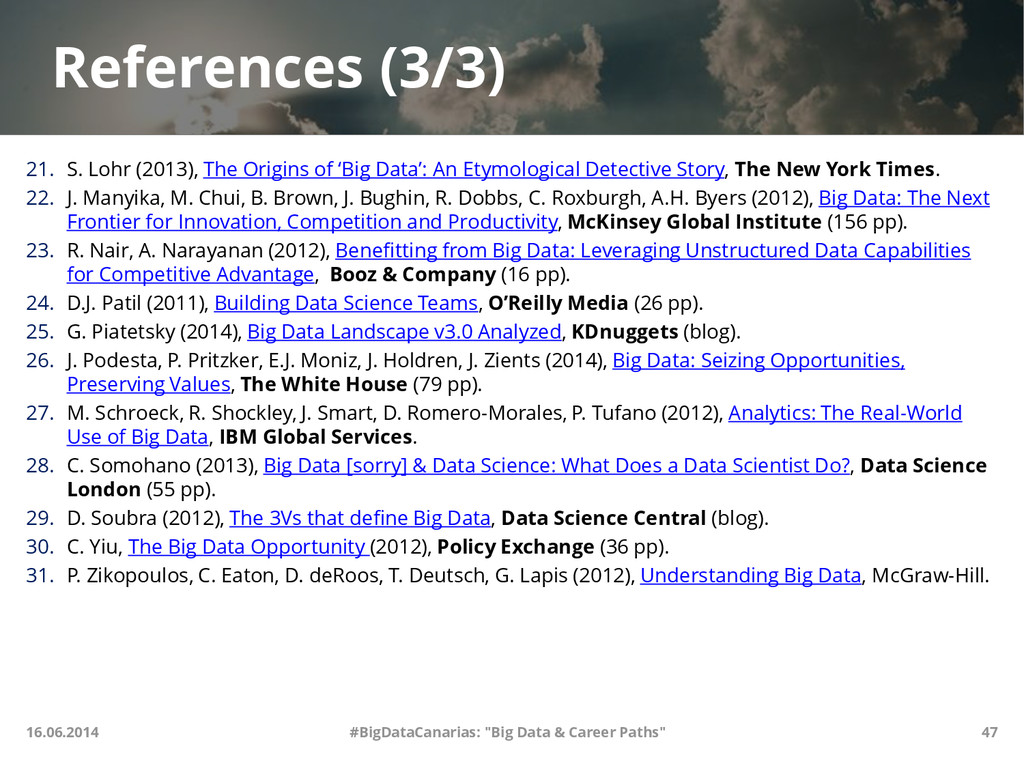 Data’: An Etymological Detective Story, The New York Times. 22. J. Manyika, M. Chui, B. Brown, J. Bughin, R. Dobbs, C. Roxburgh, A.H. Byers (2012), Big Data: The Next Frontier for Innovation, Competition and Productivity, McKinsey Global Institute (156 pp). 23. R. Nair, A. Narayanan (2012), Benefitting from Big Data: Leveraging Unstructured Data Capabilities for Competitive Advantage, Booz & Company (16 pp). 24. D.J. Patil (2011), Building Data Science Teams, O’Reilly Media (26 pp). 25. G. Piatetsky (2014), Big Data Landscape v3.0 Analyzed, KDnuggets (blog). 26. J. Podesta, P. Pritzker, E.J. Moniz, J. Holdren, J. Zients (2014), Big Data: Seizing Opportunities, Preserving Values, The White House (79 pp). 27. M. Schroeck, R. Shockley, J. Smart, D. Romero-Morales, P. Tufano (2012), Analytics: The Real-World Use of Big Data, IBM Global Services. 28. C. Somohano (2013), Big Data [sorry] & Data Science: What Does a Data Scientist Do?, Data Science London (55 pp). 29. D. Soubra (2012), The 3Vs that define Big Data, Data Science Central (blog). 30. C. Yiu, The Big Data Opportunity (2012), Policy Exchange (36 pp). 31. P. Zikopoulos, C. Eaton, D. deRoos, T. Deutsch, G. Lapis (2012), Understanding Big Data, McGraw-Hill. 16.06.2014 47 #BigDataCanarias: "Big Data & Career Paths"