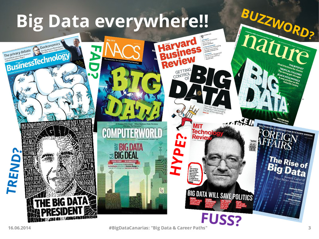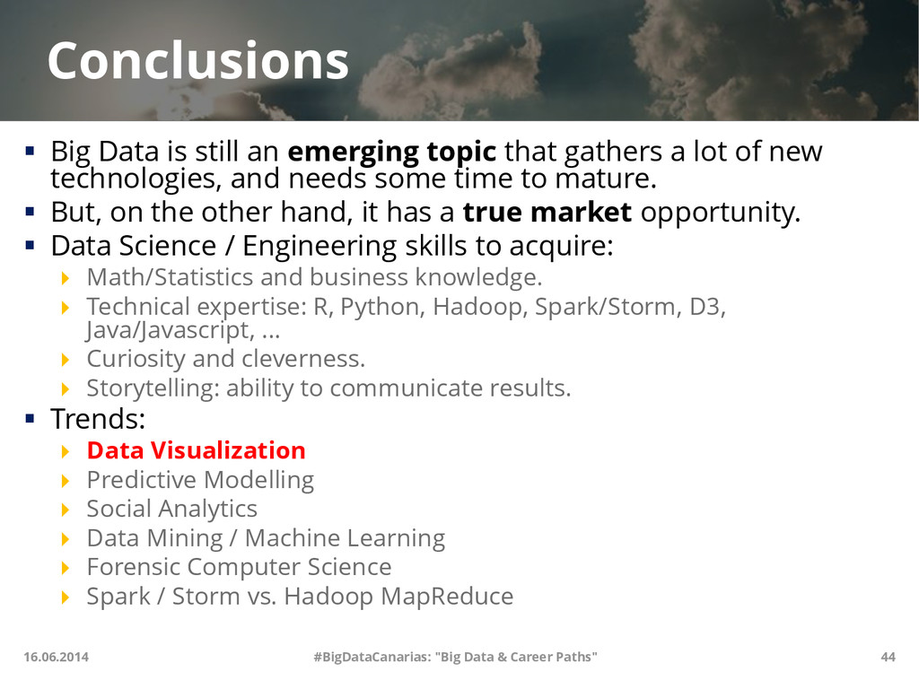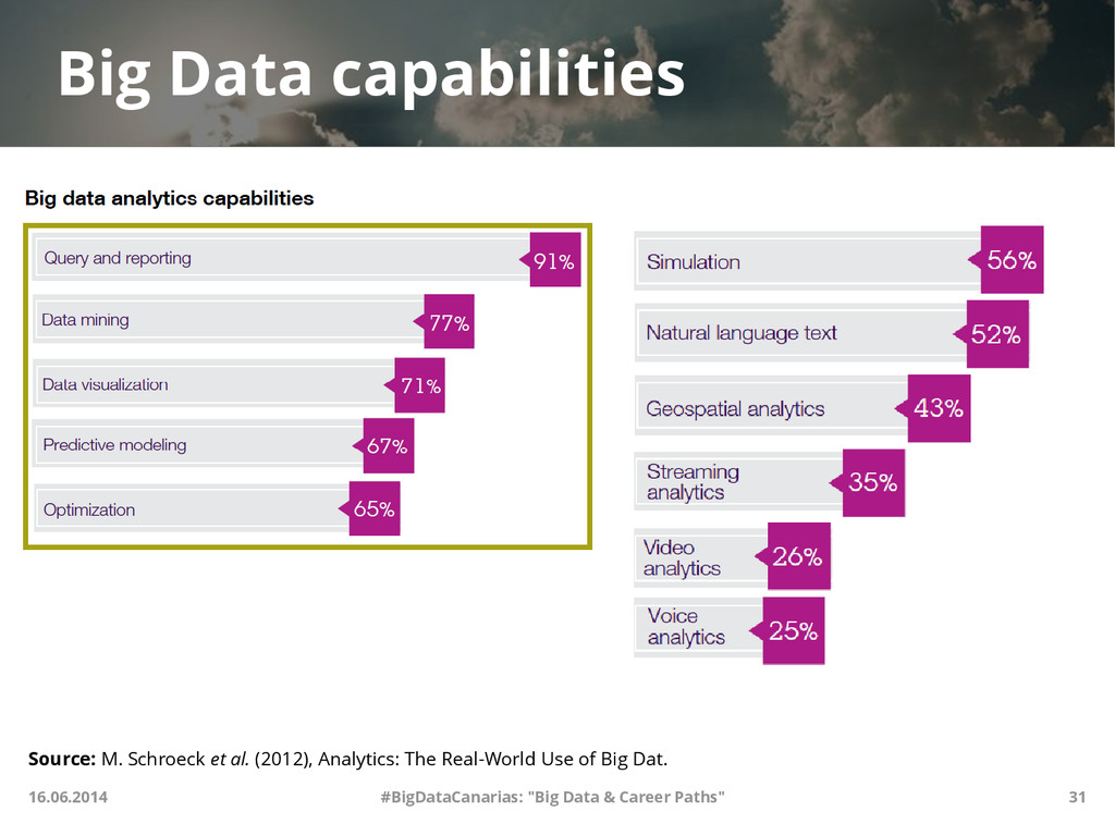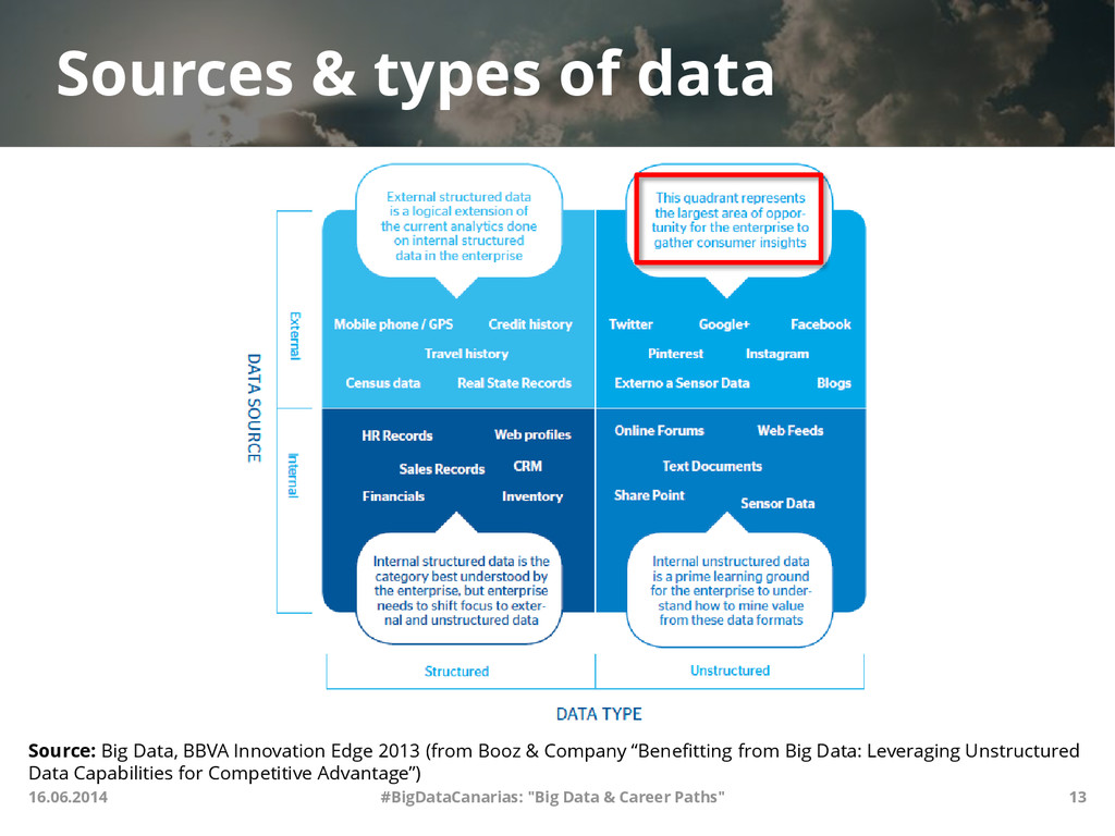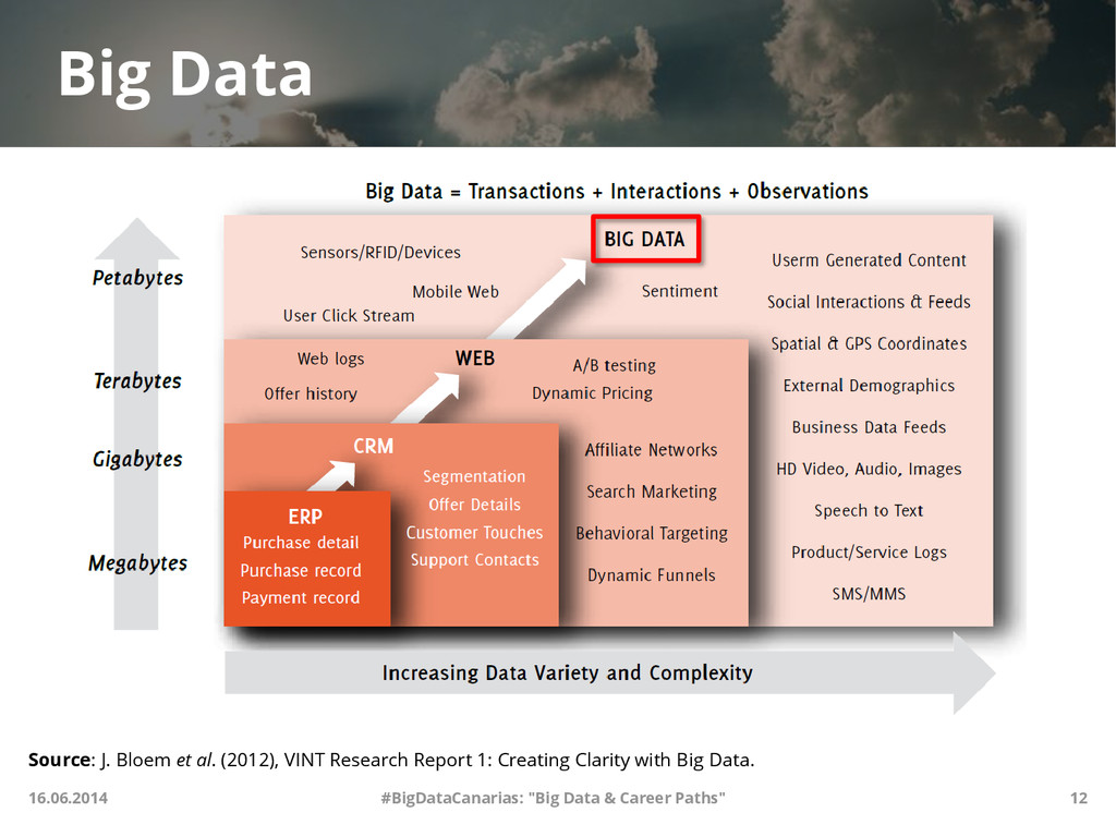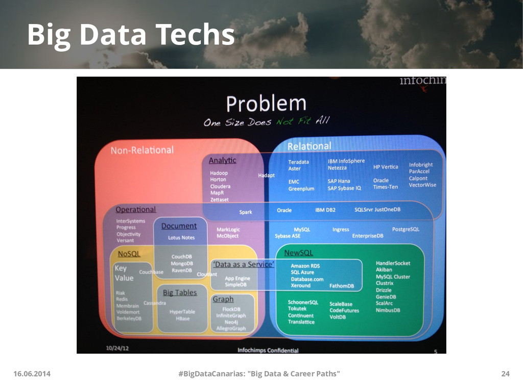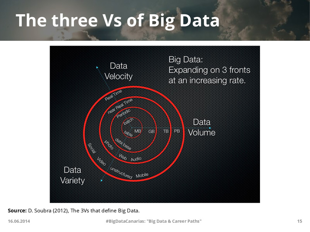 Data’: An Etymological Detective Story, The New York Times. 22. J. Manyika, M. Chui, B. Brown, J. Bughin, R. Dobbs, C. Roxburgh, A.H. Byers (2012), Big Data: The Next Frontier for Innovation, Competition and Productivity, McKinsey Global Institute (156 pp). 23. R. Nair, A. Narayanan (2012), Benefitting from Big Data: Leveraging Unstructured Data Capabilities for Competitive Advantage, Booz & Company (16 pp). 24. D.J. Patil (2011), Building Data Science Teams, O’Reilly Media (26 pp). 25. G. Piatetsky (2014), Big Data Landscape v3.0 Analyzed, KDnuggets (blog). 26. J. Podesta, P. Pritzker, E.J. Moniz, J. Holdren, J. Zients (2014), Big Data: Seizing Opportunities, Preserving Values, The White House (79 pp). 27. M. Schroeck, R. Shockley, J. Smart, D. Romero-Morales, P. Tufano (2012), Analytics: The Real-World Use of Big Data, IBM Global Services. 28. C. Somohano (2013), Big Data [sorry] & Data Science: What Does a Data Scientist Do?, Data Science London (55 pp). 29. D. Soubra (2012), The 3Vs that define Big Data, Data Science Central (blog). 30. C. Yiu, The Big Data Opportunity (2012), Policy Exchange (36 pp). 31. P. Zikopoulos, C. Eaton, D. deRoos, T. Deutsch, G. Lapis (2012), Understanding Big Data, McGraw-Hill. 16.06.2014 47 #BigDataCanarias: "Big Data & Career Paths"