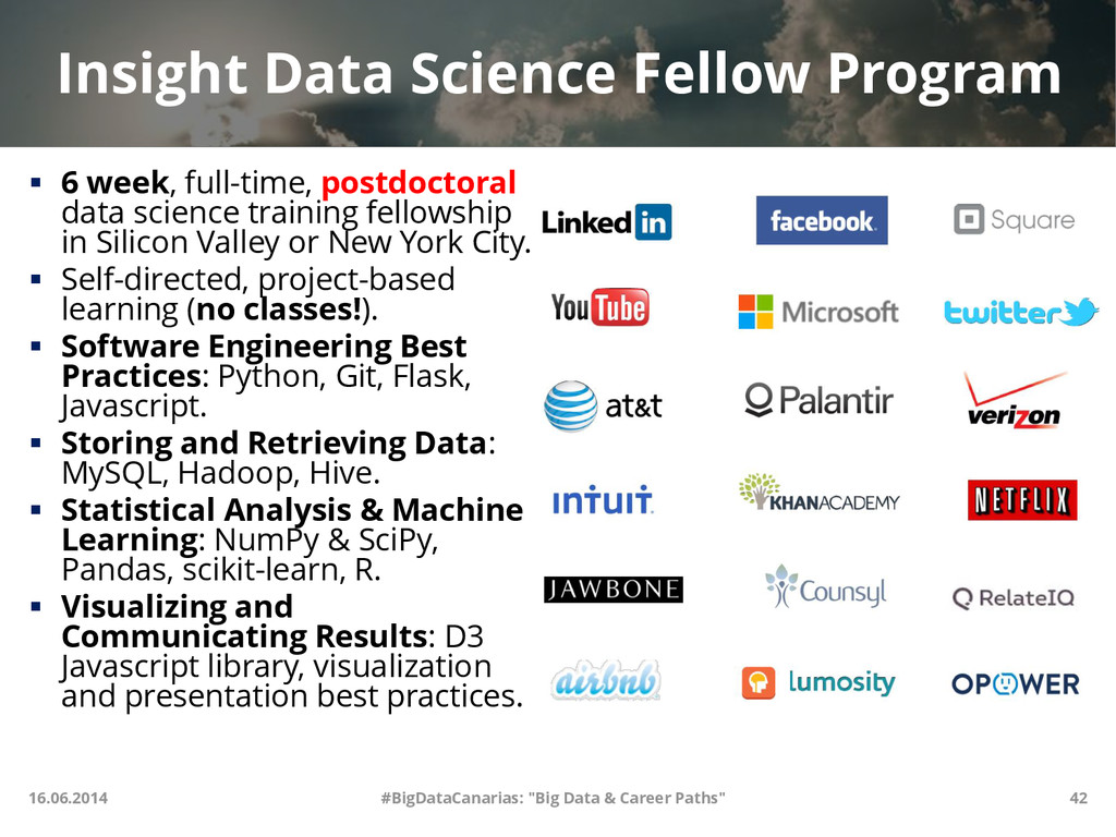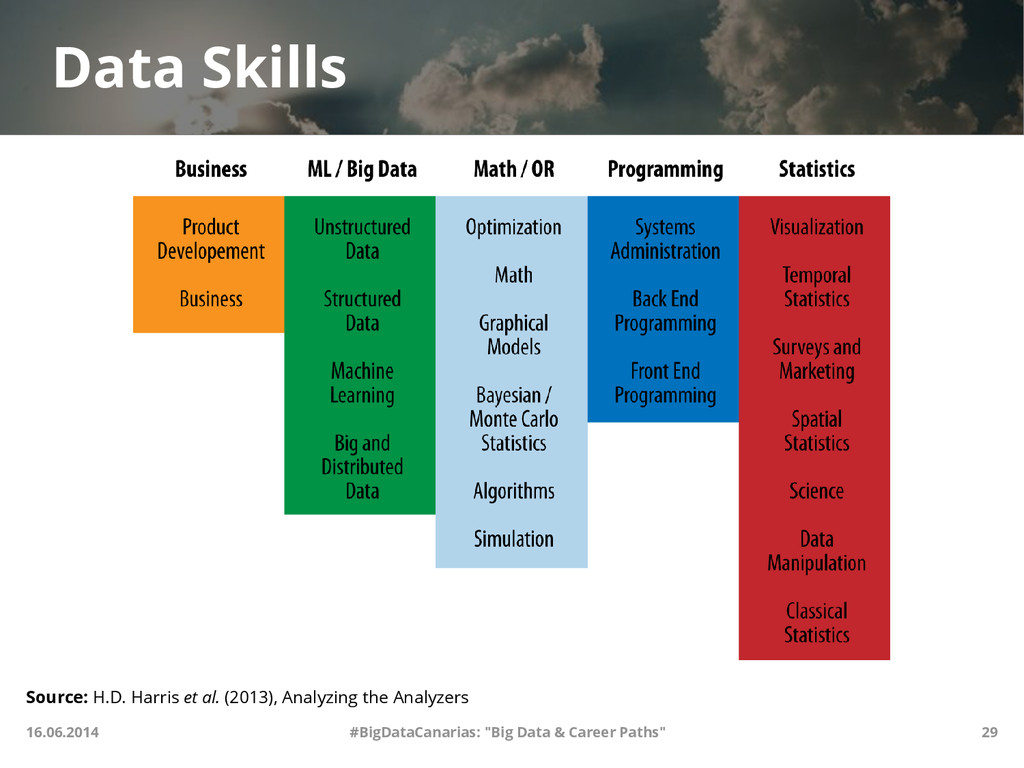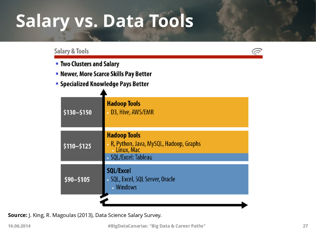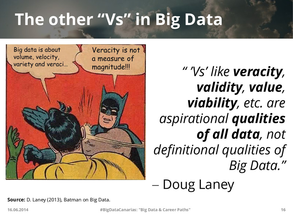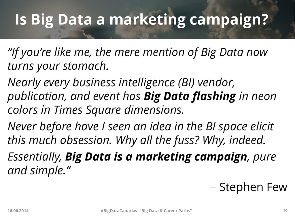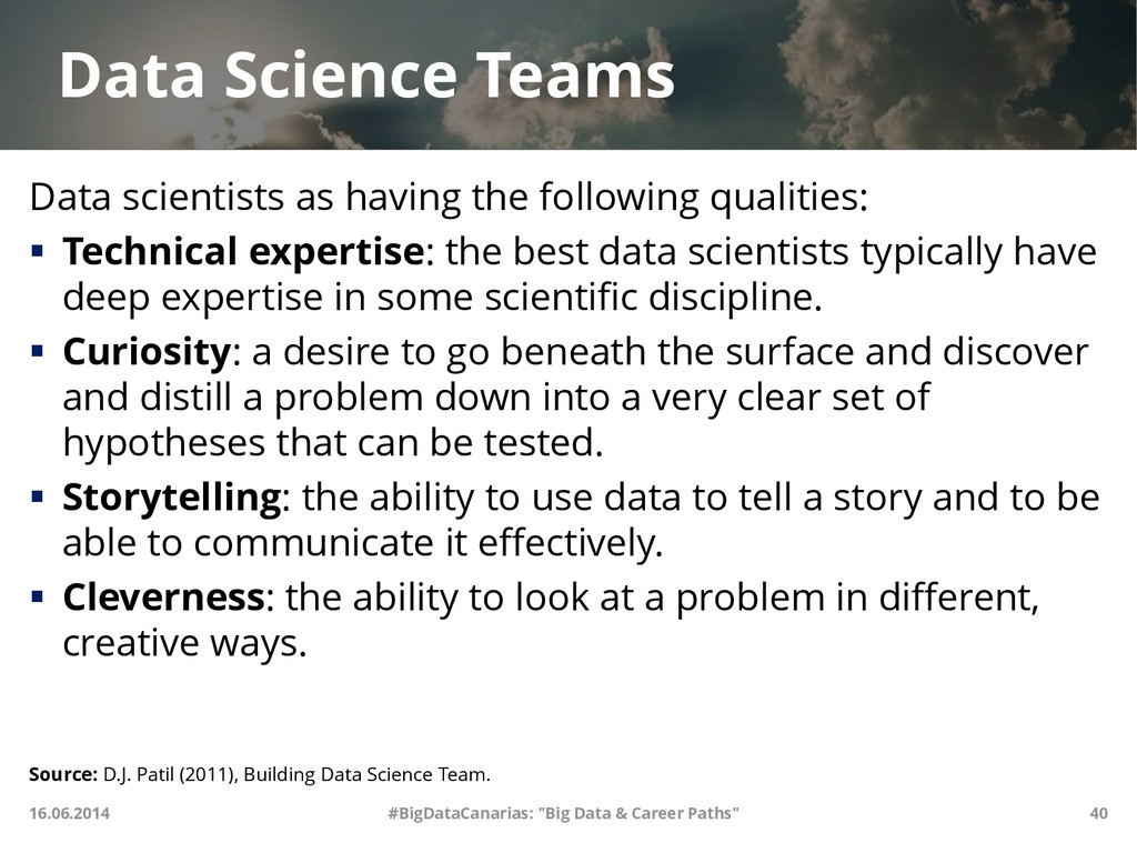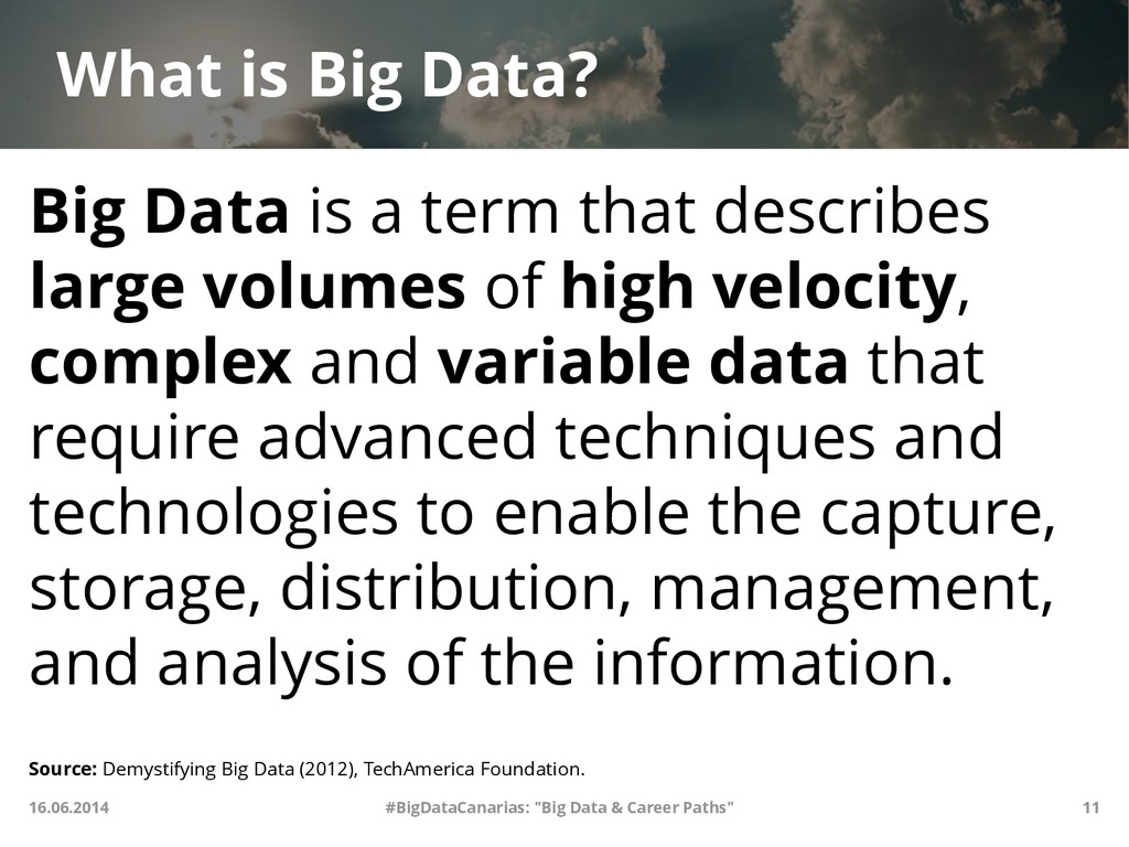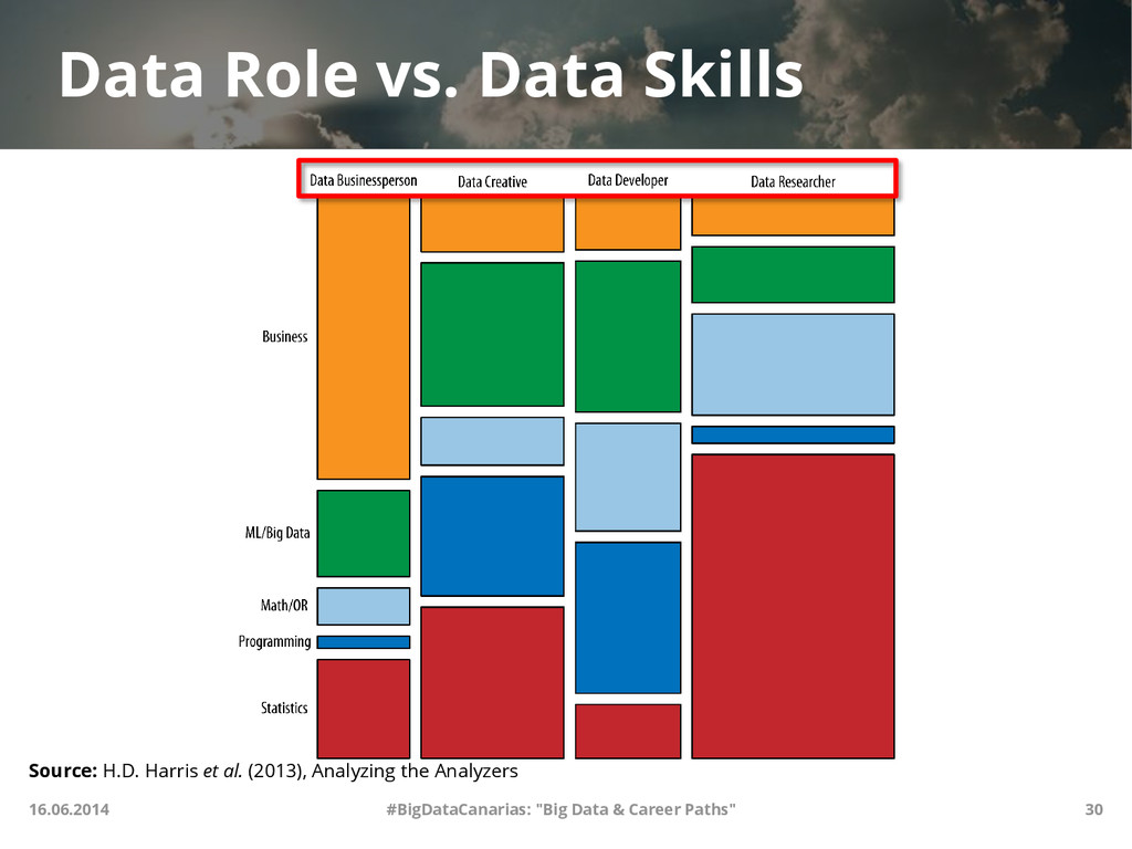 Data’: An Etymological Detective Story, The New York Times. 22. J. Manyika, M. Chui, B. Brown, J. Bughin, R. Dobbs, C. Roxburgh, A.H. Byers (2012), Big Data: The Next Frontier for Innovation, Competition and Productivity, McKinsey Global Institute (156 pp). 23. R. Nair, A. Narayanan (2012), Benefitting from Big Data: Leveraging Unstructured Data Capabilities for Competitive Advantage, Booz & Company (16 pp). 24. D.J. Patil (2011), Building Data Science Teams, O’Reilly Media (26 pp). 25. G. Piatetsky (2014), Big Data Landscape v3.0 Analyzed, KDnuggets (blog). 26. J. Podesta, P. Pritzker, E.J. Moniz, J. Holdren, J. Zients (2014), Big Data: Seizing Opportunities, Preserving Values, The White House (79 pp). 27. M. Schroeck, R. Shockley, J. Smart, D. Romero-Morales, P. Tufano (2012), Analytics: The Real-World Use of Big Data, IBM Global Services. 28. C. Somohano (2013), Big Data [sorry] & Data Science: What Does a Data Scientist Do?, Data Science London (55 pp). 29. D. Soubra (2012), The 3Vs that define Big Data, Data Science Central (blog). 30. C. Yiu, The Big Data Opportunity (2012), Policy Exchange (36 pp). 31. P. Zikopoulos, C. Eaton, D. deRoos, T. Deutsch, G. Lapis (2012), Understanding Big Data, McGraw-Hill. 16.06.2014 47 #BigDataCanarias: "Big Data & Career Paths"