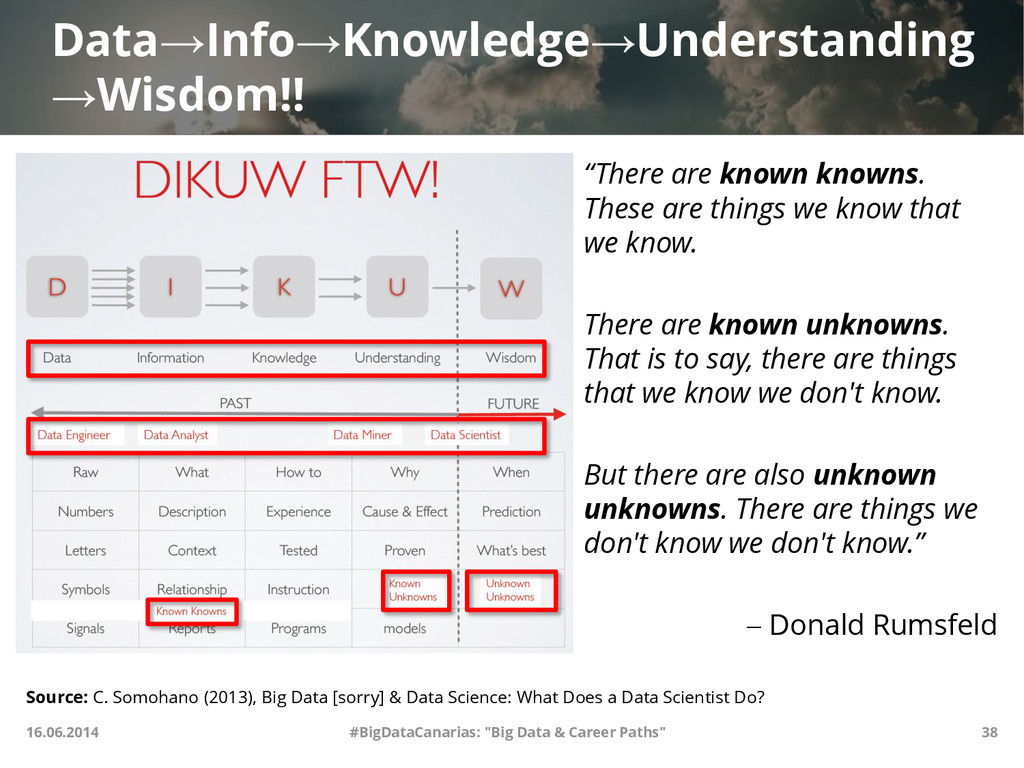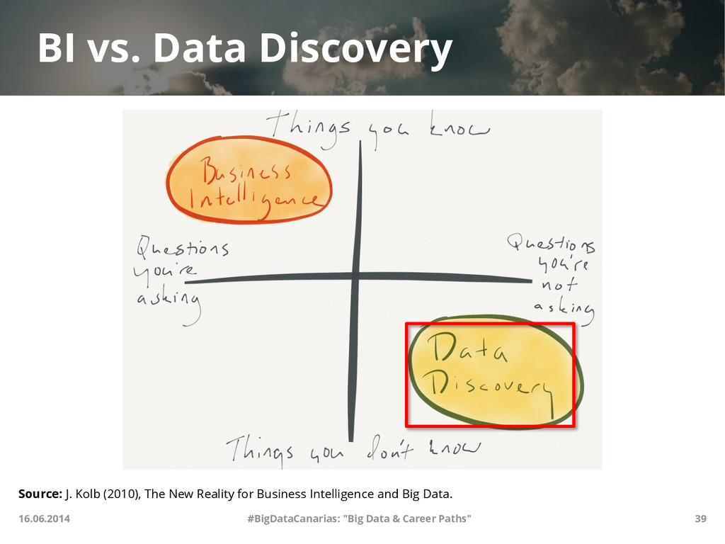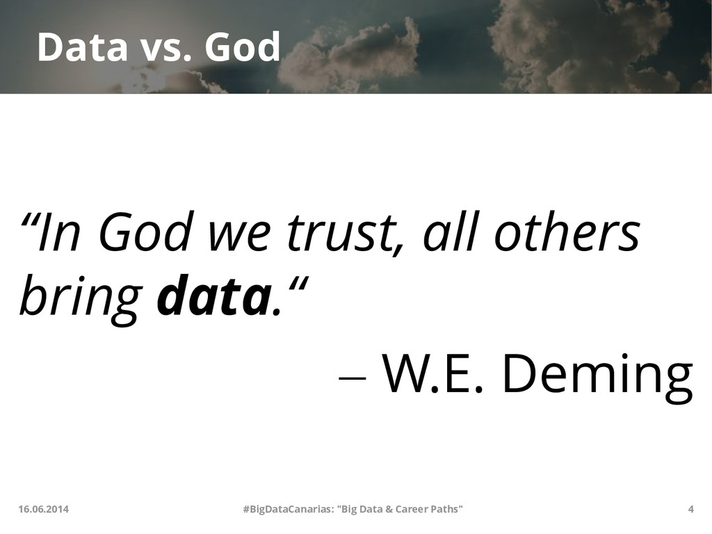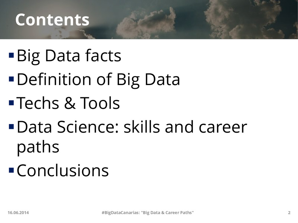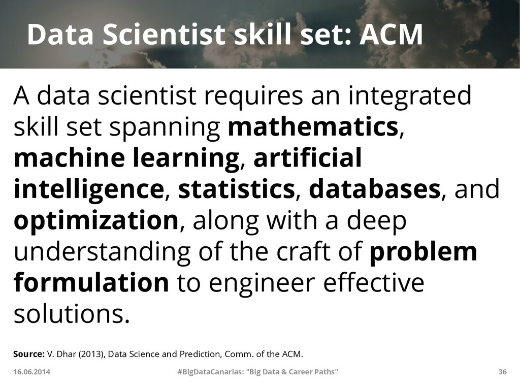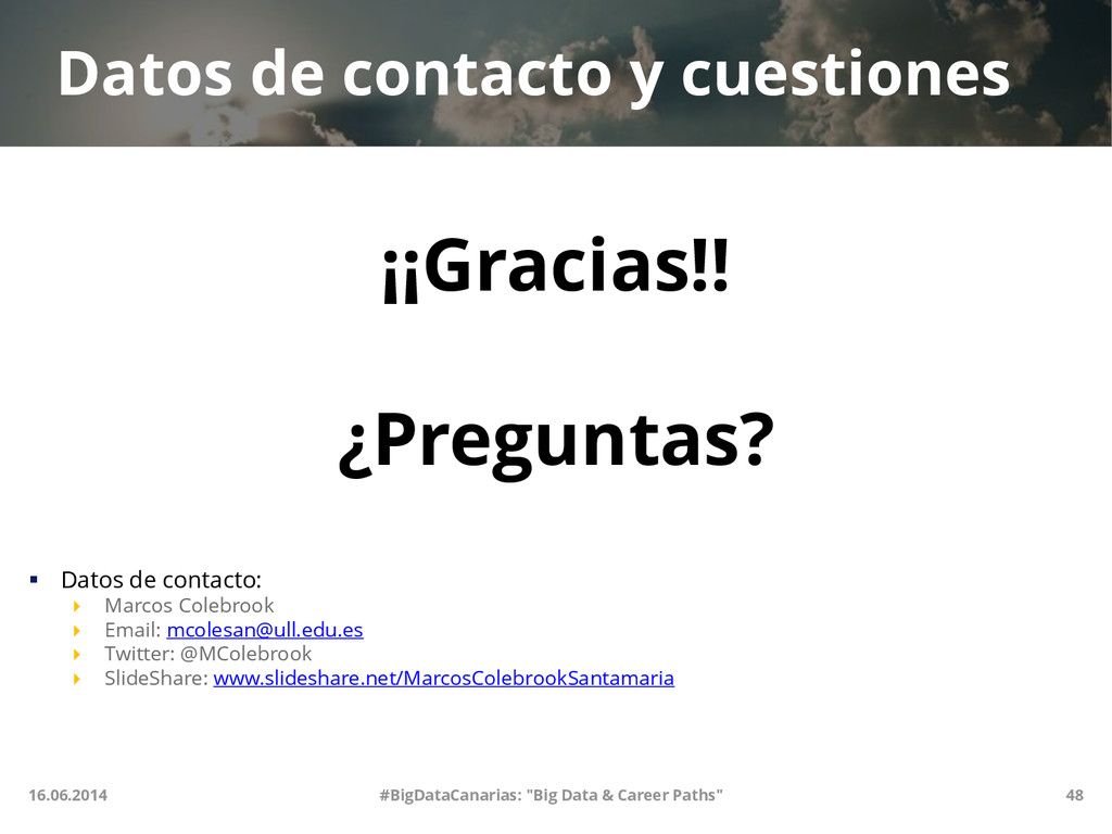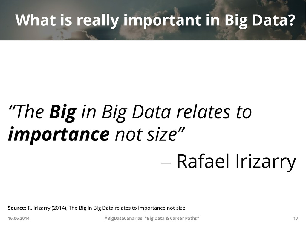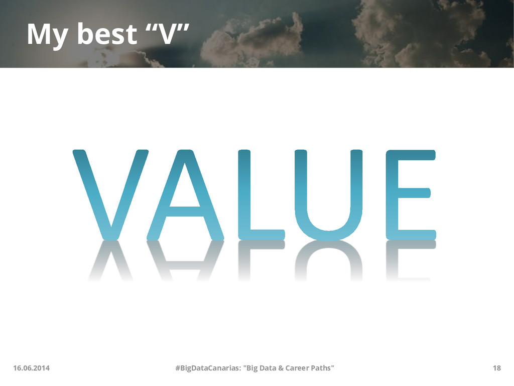 Data’: An Etymological Detective Story, The New York Times. 22. J. Manyika, M. Chui, B. Brown, J. Bughin, R. Dobbs, C. Roxburgh, A.H. Byers (2012), Big Data: The Next Frontier for Innovation, Competition and Productivity, McKinsey Global Institute (156 pp). 23. R. Nair, A. Narayanan (2012), Benefitting from Big Data: Leveraging Unstructured Data Capabilities for Competitive Advantage, Booz & Company (16 pp). 24. D.J. Patil (2011), Building Data Science Teams, O’Reilly Media (26 pp). 25. G. Piatetsky (2014), Big Data Landscape v3.0 Analyzed, KDnuggets (blog). 26. J. Podesta, P. Pritzker, E.J. Moniz, J. Holdren, J. Zients (2014), Big Data: Seizing Opportunities, Preserving Values, The White House (79 pp). 27. M. Schroeck, R. Shockley, J. Smart, D. Romero-Morales, P. Tufano (2012), Analytics: The Real-World Use of Big Data, IBM Global Services. 28. C. Somohano (2013), Big Data [sorry] & Data Science: What Does a Data Scientist Do?, Data Science London (55 pp). 29. D. Soubra (2012), The 3Vs that define Big Data, Data Science Central (blog). 30. C. Yiu, The Big Data Opportunity (2012), Policy Exchange (36 pp). 31. P. Zikopoulos, C. Eaton, D. deRoos, T. Deutsch, G. Lapis (2012), Understanding Big Data, McGraw-Hill. 16.06.2014 47 #BigDataCanarias: "Big Data & Career Paths"